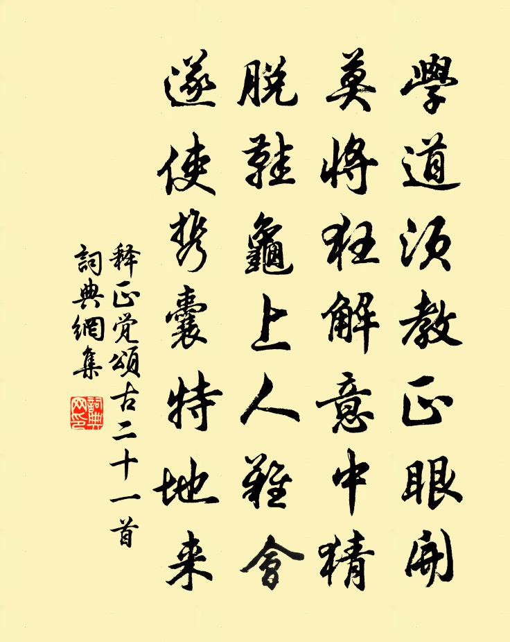 詩詞名句歷史字典書法欣賞書法字典國語詞典說文解字康熙字典古漢語字典標 題 作 者 詩 句 頌古二十一首作者:釋正覺 朝代:宋代頌古二十一首原文學道須教正眼開,莫將狂解意中猜。脫鞋龜上人難會,遂使攜囊特地來。詩詞問答問:頌古二十一首的作者是誰?答:釋正覺問:頌古二十一首寫於哪個朝代?答:宋代釋正覺頌古二十一首書法欣賞頌古二十一首書法作品詩詞推薦送王懿昌酒紫微孫處〔唐代〕將知骨分到仙鄉,酒飲金華玉液漿。莫道人間只如此,回頭已是一年強。雜詩絕句十七首梅堯臣〔宋代〕青青老鏡葉,下有繁實尖。浪頭撥船女,刺手終不嫌。南歌子姚述堯〔宋代〕金谷貂蟬侶,東山錦繡叢。管弦絲竹醉東風。漫逐流鶯飛舞、亂紅中。清嘗吾人事,詩情我輩鍾。藤蘿欲上更搘筇桂嶺馬之純〔宋代〕桂花千樹占嵌岩,絕用淮南一小山。竽籟有時味木末,天香無限滿人間。懸知彼處有金粟,為見如今聞麝蘭。躡磴題樊漢炳墓許奕〔宋代〕高志崢嶸局九州,直從人里著仙籌。青囊書在鬼神泣,黃絹詞高冰雪羞。槐里但知曾折角,蘭台無復問長頭。玉棺風棲梧 寄東方學道者丘處機〔元代〕天下風光何處好。八水三川,自古長安道。錦樹屏山方曲繞。天涯海角誰能到。既是拋家須早早。雲水登程,莫戀馬嵬徐夤〔唐代〕二百年來事遠聞,從龍誰解盡如雲。張均兄弟皆何在,卻是楊妃死報君。次韻京口叔祖見寄四首張鎡〔宋代〕欲訴中心話許長,尺書恨不寄千張。新篇喜逐東風好,亦盡人間草木荒。贈許待制歲旦生日梅堯臣〔宋代〕天曆重更端,哲人茲命世。嘗聞月旦評,況是高陽裔。椒花作壽杯,爆火通爐桂。穹龜及蒼鶴,尚以千年系。曰惟送硯與周宰朱翌〔宋代〕巧匠斲山取山骨,媼神拱手不敢惜。因隆作防窪作池,以金為聲玉為質。藉以綈衣便契攜,置之烏皮長拂拭。憶昨閒遊陸游〔宋代〕我出亦何急,輟行還悵然。輕裝幸已具,老健更誰先。野飯聊支日,山蔬不直錢。此生終樂死,何以報皇天?偶成曹彥約〔宋代〕曩疑先賢嗇於言,何不明明細經傳。今省從前都錯認,更加詳後即紛然。木蘭後池三詠白蓮皮日休〔唐代〕但恐醍醐難並潔,只應薝蔔可齊香。半垂金粉知何似,靜婉臨溪照額黃。華清宮四首吳融〔唐代〕中原無鹿海無波,鳳輦鸞旗出幸多。今日故宮歸寂寞,太平功業在山河。漁陽烽火照函關,玉輦匆匆下此山。一曲山下泉李端〔唐代〕碧水映丹霞,濺濺度淺沙。暗通山下草,流出洞中花。淨色和雲落,喧聲繞石斜。明朝更尋去,應到阮郎家。偈頌四十一首釋慧暉〔宋代〕傳家清白,字字廓脫。玉袋金針,鋒鋒通達。今夜一輪月,千山萬派流。不覺動壺鐵,巍然沒去留。句常袞〔唐代〕風候已應同嶺北,雲山仍喜似終南。(《題漳浦驛》。《方輿勝覽》)水調歌頭呂渭老〔宋代〕其兄進道作水調歌頭一韻,幾二十首,讀之,殆不勝情。次其韻作一篇,懷其人,亦以贈元發、說道扁舟思獨往,中元夜泊淮口羅隱〔唐代〕木葉回飄水面平,偶因孤棹已三更。秋涼霧露侵燈下,夜靜魚龍逼岸行。欹枕正牽題柱思,隔樓誰轉繞樑聲?錦帆扇子詩李石〔宋代〕煙雨青絲百尺樓,江南樹樹拂人頭。此間豈是藏樽處,醉里一聲黃鷅鶹。名句推薦意得則舒懷以命筆,理伏則投筆以卷懷劉勰《文心雕龍·養氣》 今日清明節,園林勝事偏。賈島《清明日園林寄友人》 亦知合被才名折,二十三年折太多。白居易《醉贈劉二十八使君》 九萬里風鵬正舉。李清照《漁家傲·天接雲濤連曉霧》 燈火紙窗修竹里,讀書聲。陳繼儒《浣溪沙·初夏夜飲歸》 君看六幅南朝事,老木寒雲滿故城。韋莊《金陵圖》 君人者不可以不慎取臣,匹夫不可不慎取友。友者,所以相有也。荀子《荀子·大略》 幾硯昔年游,於今成十秋。司馬光《送龔章判官之衛州·新及第》 愛多者則法不立,威寡者則下侵上。韓非及後人《韓非子·內儲說上七術》 金帶連環束戰袍,馬頭沖雪度臨洮。馬戴《出塞詞》