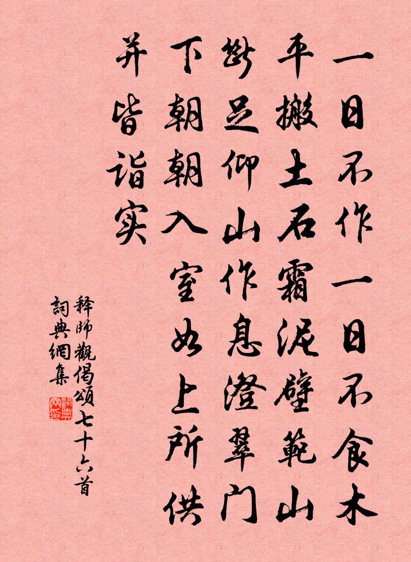 詩詞名句歷史字典書法欣賞書法字典國語詞典說文解字康熙字典古漢語字典標 題 作 者 詩 句 偈頌七十六首作者:釋師觀 朝代:宋代偈頌七十六首原文一日不作,一日不食。木平搬土,石霜泥壁。范山斷足,仰山作息。澄翠門下,朝朝入室。如上所供,並皆詣實。詩詞問答問:偈頌七十六首的作者是誰?答:釋師觀問:偈頌七十六首寫於哪個朝代?答:宋代釋師觀偈頌七十六首書法欣賞偈頌七十六首書法作品詩詞推薦湖徐璣〔宋代〕拾得柔條弄淺波,清風吹斷採蓮歌。又移小艇前汀去,蓮葉稠時柳葉多。木蘭花慢 壽崔子文王惲〔元代〕際河山兩界,道此地,正文衛。才北渚離筵,南亭奔迓,終歲倥*。風流故家從事,暫淹留、蓮幕簿書業。更辦錦為樂天自勘詩集因思頃年城南醉歸馬上遞唱艷曲…成篇元稹〔唐代〕春野醉吟十里程,齋宮潛詠萬人驚。今宵不寐到明讀,風雨曉聞開鎖聲。贊痴絕和尚釋心月〔宋代〕破蟄之雷,指南之龜。斫圓玉斧,刮膜金篦。噫,非師而誰。寄徐丞趙師秀〔宋代〕病不窺園經一月,更無人跡損青苔。池禽引子衡魚去,野蔓開花上竹來。亦欲鬢毛休似雪,爭如丹汞只為灰。秋風頌古三十一首釋原妙〔宋代〕靈山拈出一枝花,百萬都來是作家。惟有飲光猶未瞥,那堪眼裡又添沙。喜遷鶯薛昭蘊〔唐代〕殘蟾落,曉鐘鳴,羽化覺身輕。乍無春睡有餘酲,杏苑雪初晴。紫陌長,襟袖冷,不是人間風景。回看塵土似前生西江月·阻風山峰下張孝祥〔宋代〕滿載一船秋色,平鋪十里湖光。波神留我看斜陽。放起鱗鱗細浪。明日風回更好,今宵露宿何妨。水晶宮裡奏霓裳守歲項安世〔宋代〕大家投轄駐年先,共判今宵一醉長。不管棲禽驚列炬,且傾浮蟻盡餘觴。茶馗已作當關面,花柳誰知惜別腸。看取四愁詩張衡〔兩漢〕我所思兮在太山。欲往從之梁父艱,側身東望涕沾翰。美人贈我金錯刀,何以報之英瓊瑤。路遠莫致倚逍遙,何為太皇太后合春帖子六首蘇頌〔宋代〕氣至風條達,陽升土墳盈。芸芸生物遂,兩兩泰階平。四月二十日登烏奴山卷剛中〔宋代〕烏奴樓閣起江皋,特地攜樽上最高。城閣帶煙無十里,舳艫銜運過千艘。箇中官事暫時少,明日吾生依舊勞。未到遣興效樂天文同〔宋代〕君莫學楊虞卿奉李宗閔,宗閔權勢豈能久。君莫學劉棲楚附李逢吉,逢吉祿位寧長守。雖然一時身暫好,其奈千古潛鶴鼓楊備〔宋代〕端門擊破使人驚,潛鶴雙飛上玉清。怪得舊時聲太遠,沖天合自九臯鳴。聞毀強至〔宋代〕憶初向關中,觸熱事西走。淋漓汗征衣,早夜犯星斗。歡然赴所知,辛苦復何有。主人喜賓至,相見勞杯酒。誓將鄴中贈王大(一作鄴中王大勸入高鳳石門山幽居)李白〔唐代〕一身竟無托,遠與孤蓬征。千里失所依,復將落葉並。中途偶良朋,問我將何行。欲獻濟時策,此心誰見明。君王陽羨雜詠十九首。西陽亭陸希聲〔唐代〕隔林殘日照孤亭,玄晏先生酒未醒。入夜莫愁迷下路,昔人猶在逐流螢。送劉成伯著作赴弋陽宰梅堯臣〔宋代〕我昨之官來,值君為郡掾。當年已知名,是日才識面。未久嗟還都,始應群公薦。遂除芸省郎,出治江上縣。縣劇落第後歸山下舊居留別劉起居昆季盧綸〔唐代〕寂寞過朝昏,沈憂豈易論。有時空卜命,無事可酬恩。寄食依鄰里,成家望子孫。風塵知世路,衰賤到君門。醉里著書蘇籀〔宋代〕著書前古老虞卿,何必窮愁學乃成。駕說精心是家訓,修辭肆筆體人情。少年竦躍文章慕,老去沖融道術鳴。流略名句推薦提出西方白帝驚,嗷嗷鬼母秋郊哭。李賀《春坊正字劍子歌》 山無陵,江水為竭。佚名《上邪》 春夢醒來么?對春帆細雨,獨自吟喔。譚嗣同《望海潮·自題小影》 此際閒愁郎不共,月移窗罅春寒重。王士禎《蝶戀花·和漱玉詞》 十五彩衣年,承歡慈母前。孟浩然《送張參明經舉兼向涇州覲省》 聽元宵,往歲喧譁,歌也千家,舞也千家。王磐《古蟾宮·元宵》 賈生年少虛垂淚,王粲春來更遠遊。李商隱《安定城樓》 道吾好者是吾賊,道吾惡者是吾師。佚名《增廣賢文·上集》 紅樹青山日欲斜,長郊草色綠無涯。歐陽修《豐樂亭遊春·其三》 山中無甲子,寒盡不知年。吳承恩《西遊記·第一回》