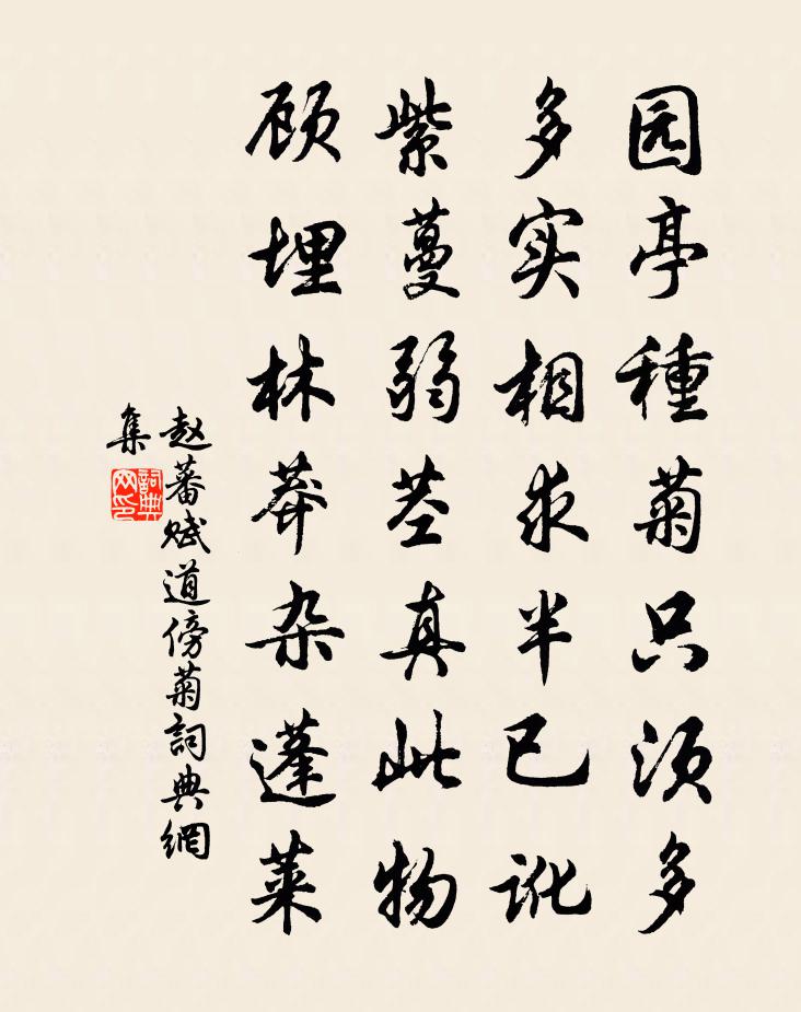 詩詞名句歷史字典書法欣賞書法字典國語詞典說文解字康熙字典古漢語字典標 題 作 者 詩 句 賦道傍菊作者:趙蕃 朝代:宋代賦道傍菊原文園亭種菊只須多,多實相求半已訛。紫蔓弱莖真此物,顧埋林莽雜蓬萊。詩詞問答問:賦道傍菊的作者是誰?答:趙蕃問:賦道傍菊寫於哪個朝代?答:宋代趙蕃賦道傍菊書法欣賞賦道傍菊書法作品詩詞推薦頌古四十四首釋法泰〔宋代〕病餐毒藥訪良醫,醫使元餐藥治之。病去藥回滋味別,舌頭具眼者方知。歸故園舒岳祥〔宋代〕辟兵辟寇走他方,六遍移家路轉長。百醉與君同出處,五窮隨我共行藏。柳花暗度誰家筆,燕子寒歸何處梁。最羨送春有感吳芾〔宋代〕物物俱有情,情尤鍾我輩。況復病且衰,白髮不相貸。今日送殘春,倍覺生感慨。正恐明年春,此身不復在。憶昔春詞(一作沈亞之詩)施肩吾〔唐代〕黃鳥啼多春日高,紅芳開盡井邊桃。美人手暖裁衣易,片片輕雲落剪刀。桂飄香(元名花心動)曹冠〔宋代〕律應清商,嫩涼生、金風乍飄林葉。玉兔騰精,光浸樓台,宛似廣寒宮闕。遠山橫翠煙霏斂,鵲枝繞、蛩聲淒切。題高麗字跡牟巘五〔宋代〕片紙殷勤贈跋篇,來從箕子舊朝鮮。六經原不經秦火,好為刊傳惠後賢。奉和對雪(一本作奉和王相公喜雪)皇甫冉〔唐代〕春雪偏當夜,暄風卻變寒。庭深不復掃,城曉更宜看。命酒閒令酌,披蓑晚未冠。連營鼓角動,忽似戰桑乾。題竹谷上人院賈島〔唐代〕禪庭高鳥道,回望極川原。樵徑連峰頂,石泉通竹根。木深猶積雪,山淺未聞猿。欲別塵中苦,願師貽一言。張履妻王氏輓詞周必大〔宋代〕逮事尊嫜日以嚴,退從娣姒一何謙。不愁囊橐金珠減,但喜園林錦繡添。四德助成家赫赫,一身寧計病懨懨。歸尋讀《山海經》 其九陶淵明〔魏晉〕夸父誕 * ,乃與日競志。俱至虞淵下,似若無勝負。神力既殊妙,傾河焉足有!餘跡寄鄧林,功竟在身後。紅繡鞋任昱〔元代〕暗朱箔雨寒風峭,試羅衣玉減香銷。落花時節怨良宵。銀檯燈影淡,繡枕淚痕交。團圓春夢少。和遲田舍雜詩九首蘇轍〔宋代〕我生無定居,投老旋求宅。未暇棟宇完,先問松筠碧。床銳日益銷,車轄轉生澀。東家雖告貧,鬻否猶未必。清平樂(贈處梅)張炎〔宋代〕暗香千樹。結屋中間住。明月一方流水護。夢入梨雲深處。清冰隔斷塵埃。無人踏碎蒼苔。一似逋仙歸後,吟詩不謝黃森惠詩並草書文同〔宋代〕南{左耒中昔右阝}黃夫子,生平氣凜然。吟詩舊有癖,寫字近方顛。可惜空山老,須為後世傳。蘭溪修禊否,願姑蘇宮行鮑溶〔唐代〕姑蘇宮,九層金台半虛空。雕楹璇題斗皎潔,中有妖姬似明月。西見洞庭秋鏡開,水華百里盤宮來。越王采女能水偈頌一百五十首釋心月〔宋代〕甌峰布鐵連陣,我曾長袖拂開。甌峰擲金剛圈,我曾鐵鞭擊碎。沒仇讎處起仇讎,無怨對中作怨對。今日何以報之將至東都先寄令狐留守白居易〔唐代〕黃鳥無聲葉滿枝,閒吟想到洛城時。惜逢金谷三春盡,恨拜銅樓一月遲。詩境忽來還自得,醉鄉潛去與誰期?東都贈天竺僧汪晫〔宋代〕衲被蒙頭付自然,何須八棒十三禪。數聲啼鳥青山外,驚起幽窗一覺眠。樂道黃庚〔宋代〕門掩荒苔客到稀,間情已與世相違。胸中宇宙自然景,眼底江山不盡詩。雲淡風輕皆道體,鳶飛魚躍總天機。吾心桂隱紀詠霞川張鎡〔宋代〕方舟臥看化,丹霞二三里。窮眼謝玄暉,休言余散綺。名句推薦只言啼鳥堪求侶,無那春風欲送行。高適《夜別韋司士》 喧鳥覆春洲,雜英滿芳甸。謝朓《晚登三山還望京邑》 貧家而學富家之衣食多用,則速亡必矣。墨子《墨子·47章 貴義》 長他人志氣,滅自己威風。張南莊《何典·第十回》 寶奩明月不欺人,明日歸來君試看。嚴仁《玉樓春·春思》 秋色雁聲愁幾許,都在斜陽。吳文英《浪淘沙·九日從吳見山覓酒》 邊蛇口中草,蠍子尾後針。馮夢龍《警世通言·卷二十五》 居安思危。思則有備,有備無患左丘明《左傳·襄公·襄公十一年》 數樹梨花,晚風吹墮半汀鷺。吳文英《齊天樂·新煙初試花如夢》 手攜稚子夜歸院,月冷空房不見人。白居易《為薛台悼亡》