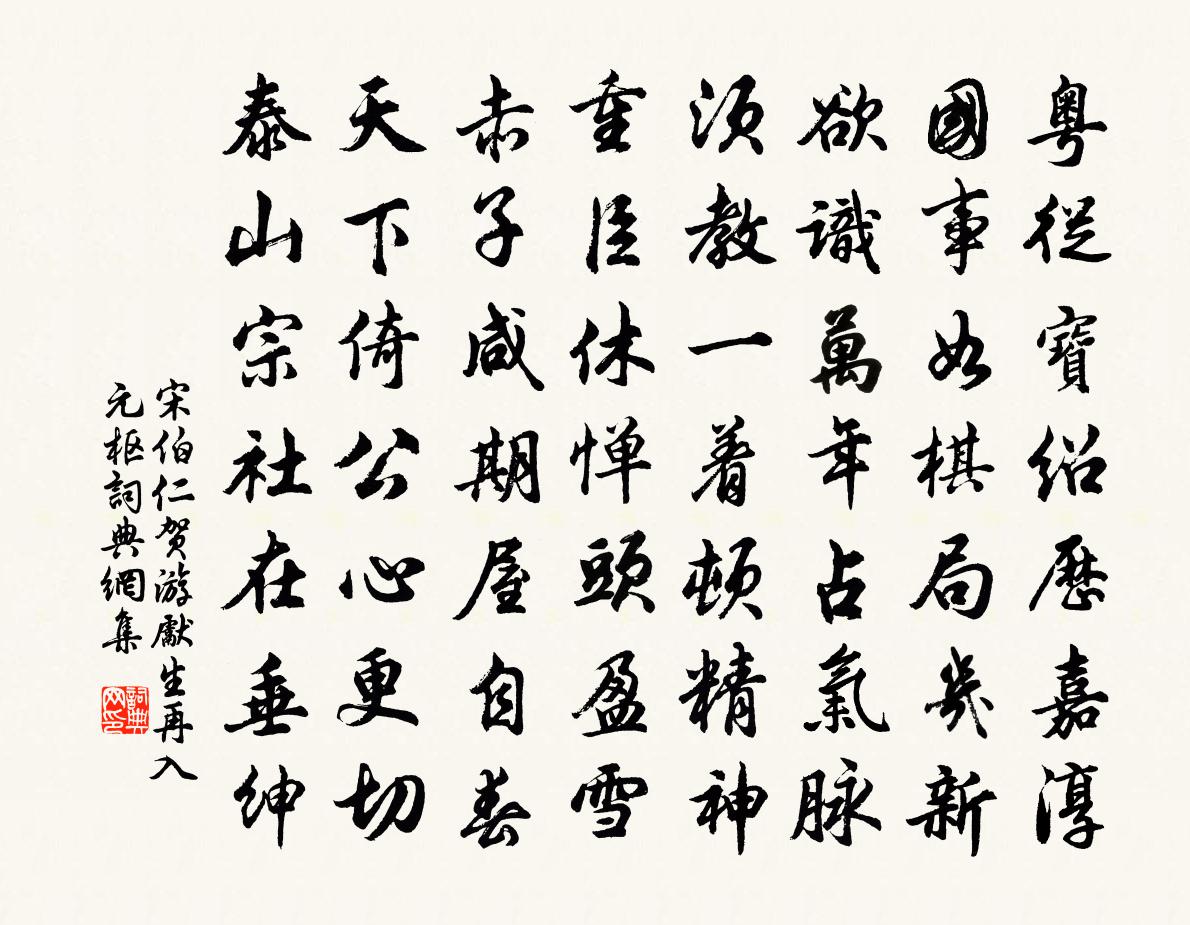 詩詞名句歷史字典書法欣賞書法字典國語詞典說文解字康熙字典古漢語字典標 題 作 者 詩 句 賀游先生再入元樞作者:宋伯仁 朝代:宋代賀游先生再入元樞原文粵從寶紹歷嘉淳,國事如棋局幾新。欲識萬年占氣脈,須教一著頓精神。重臣休憚頭盈雪,赤子鹹期屋自春。天下倚公心更切,泰山宗社在垂紳。詩詞問答問:賀游先生再入元樞的作者是誰?答:宋伯仁問:賀游先生再入元樞寫於哪個朝代?答:宋代宋伯仁賀游先生再入元樞書法欣賞賀游先生再入元樞書法作品詩詞推薦過謝{左石右達}渰岳珂〔宋代〕蒹葭曼衍浪縈迴,波面雖平路不開。溝瀆行舟休剡木,{左土右幻}堂浮芥欲膠杯。人如鳧雁俱游耳,江有魚龍安雨中陪子瞻同顏復長官送梁燾學士舟行歸汶上蘇轍〔宋代〕客從南方來,信宿北方去。手棹木蘭舟,不顧長江雨。江昏氣陰黑,雨落無朝暮。肅肅赴波濤,濛濛暗洲渚。微涼題長安酒肆壁三絕句鍾離權〔唐代〕坐臥常攜酒一壺,不教雙眼識皇都。乾坤許大無名姓,疏散人中一丈夫。得道高僧不易逢,幾時歸去願相從。自言山居陳宓〔宋代〕山深塵事絕,物靜壯心降。蟻度輕移履,蜂迷為穴窗。霜暉疑皓月,風月類翻江。有客來何處,應尋居士龐。塞上曲黃庭堅〔宋代〕十月北風燕草黃,燕人馬肥弓力強。虎皮裁鞍鵰羽箭,射殺山陰雙白狼。青氈帳高雪不濕,擊鼓傳觴令行急。戎王贈胡端本顯伯教諭二首方回〔宋代〕星□□□□諸胡,鄉里人人仰范模。韜養沉潛求大□,□揮□□號通□。□生不出跧吟屋,垂老□□□□□。□□三山亭李昴英〔宋代〕山中招提鼎足踞,路如丁字分頭入。還看港漢紛長繩,俯見阜丘才小笠。班荊坐仆縱之息,爭解綠荷撮紅粒。群然龍夜吟李賀〔唐代〕捲髮胡兒眼睛綠,高樓夜靜吹橫竹。一聲似向天上來,月下美人望鄉哭。直排七點星藏指,暗合清風調宮徵。蜀道蒲徐似道〔宋代〕圓蒲相將結僧廈,荷葉蒲茸綠相亞。浮花浪葉自飄零,小院迴廊正瀟灑。葉如青幄花成茵,細腰起舞來送春。紙光登樓李洞〔唐代〕川上值樓開,寒山四面來。竹吹人語遠,峰礙鳥飛回。生死別離陌,朝昏雲雨堆。誰知獨立意,濺淚落莓苔。梅花引 溪舊隱丘處機〔元代〕無名客。無牽迫。無桑無梓無田宅。古岩前。老松邊。長歌隱几,徐徐考太玄。玄中默論無生死。實際何曾分彼此端平二年端午帖子詞皇帝閣洪咨夔〔宋代〕明進離方午,柔生遇已陰。妙參三聖易,細測兩儀心。送李德仁歸濟南鄉試 其一王冕〔元代〕岩前有古桂,鱗甲森蒼蒼。吹涼洗綠煙,永延清夜光。郄林既已榮,燕山亦已芳。於今贈君去,願挹秋天香。奉和襲美夏景無事因懷章來二上人次韻陸龜蒙〔唐代〕檐外青陽有二梅,折來堪下凍醪杯。高杉自欲生龍腦,小弁誰能寄鹿胎。麗事肯教饒沈謝,談微何必減宗雷。還聞越井岡方信孺〔宋代〕萬山袞袞盡東來,高處猶存百尺台。回首舊時張樂地,一杯重與酹蒼苔。劉正之宜樓四章黃榦〔宋代〕春風滿庭除,琴瑟亦靜好。翁中有歡伯,相祝以偕老。病後訪梅九絕劉克莊〔宋代〕和靖林間欬嗽時,一邊覓句一邊飢。而今始會天公意,不惜功名只惜詩。夜窗二首楊萬里〔宋代〕詩人心緒幾時休,逢著三春似九秋。數到五更仍五點,明朝還更有新愁。齊人歌先秦無名〔先秦〕魯人之皋。數年不覺。使我高蹈。唯其儒書。以為二國憂。題長江圖三絕王柏〔宋代〕瓜步洲前水最深,幾人恃此縱荒淫。誰雲天意分南北,自是人無混一心。名句推薦天下大勢,分久必合,合久必分。羅貫中《三國演義·第一回》 出其東門,有女如雲。佚名《出其東門》 一朝哭都市,淚盡歸田畝。元結《農臣怨》 平生塞北江南,歸來華發蒼顏。辛棄疾《清平樂·獨宿博山王氏庵》 朝作輕寒暮作陰,愁中不覺已春深。屈大均《壬戌清明作》 子規啼徹四更時,起視蠶稠怕葉稀。謝枋得《蠶婦吟》 脫鞍暫入酒家壚,送君萬里西擊胡岑參《送李副使赴磧西官軍》 有力者疾以助人,有財者勉以分人,有道者勸以教人。墨子《墨子·10章 尚賢(下)》 相望試登高,心隨雁飛滅。孟浩然《秋登蘭山寄張五》 柳條將舒未舒,柔梢披風,麥田淺鬣寸許。袁宏道《滿井遊記》