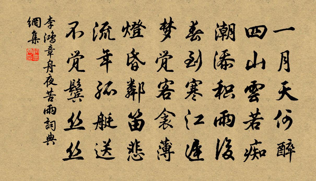 詩詞名句歷史字典書法欣賞書法字典國語詞典說文解字康熙字典古漢語字典標 題 作 者 詩 句 舟夜苦雨作者:李鴻章 朝代:清代舟夜苦雨原文一月天何醉,四山雲若痴。潮添積雨後,春到寒江遲。夢覺客衾薄,燈昏鄰笛悲。流年孤艇送,不覺鬢絲絲。詩詞問答問:舟夜苦雨的作者是誰?答:李鴻章問:舟夜苦雨寫於哪個朝代?答:清代問:舟夜苦雨是什麼體裁?答:五律李鴻章舟夜苦雨書法欣賞舟夜苦雨書法作品詩詞推薦長風沙交宋丈韻一首王阮〔宋代〕已將身世等河沙,又泛春江看浪花。錦纜牙檣君送酒,蓑衣蒻笠我浮家。淹留日覺青春暮,飄泊風兼細雨斜。安得由刁園步至因勝求浴吳則禮〔宋代〕鳥聲已迎一百五,野逕微行誰復嗔。放飯要穿花底屐,捐書聊著頭上巾。老夫踽踽只白眼,爛蕊細細走青春。憑伏鷓鴣天趙長卿〔宋代〕綠水澄江得勝游。浪平風軟稱輕舟。樽前我易傷前事,柳外人誰獨倚樓。空感慨,惜風流。風流贏得謾多愁。愁多遣興吳則禮〔宋代〕鮮鮮黃金花,種種白髮人。晚歲色不改,宿昔情相親。浪因五斗米,愧此流轉身。吾輩有能事,大笑非伯倫。送丁司理赴明州范仲淹〔宋代〕仙家枝葉令威孫,南去司刑庇越民。金闕道書微旨在,獄多陰德是真人。贈京尹八首袁燮〔宋代〕美名疇昔藹循良,重任今茲典浩穰。摯若蒼鷹非不健,何如鸞鳳郊嘉祥。客中作牟融〔唐代〕異鄉歲晚悵離懷,遊子驅馳愧不才。夜夜砧聲催客去,年年雁影帶寒來。半林殘葉迎霜落,三徑黃花近節開。幾度讀楚騷史彌寧〔宋代〕一蕊青鐙手自挑,霜風木葉下亭皋。篆香銷盡寒灰塌,細嚼梅花味楚騷。和人見詠新鶴魏野〔宋代〕雪霜毛羽瘦形儀,養處人家覺道肥。龜有壽齡方可近,鷺無仙分莫相依。千年松上疑孤立,五色雲中好並飛。不競秋懷白居易〔唐代〕月出照北堂,光華滿階墀。涼風從西至,草木日夜衰。桐柳減綠陰,蕙蘭消碧滋。感物私自念,我心亦如之。安得元夜病起二首陳造〔宋代〕節物撩佳興,浮生盍自寬。山城如許樂,燈市不多寒。微步漂香細,行歌惜夜闌。何人欹醉帽,朱袖簇歸鞍。呂與叔挽章四首秦觀〔宋代〕追惟獻歲發春間,和我新詩憶故山。今日始知詩是讖,魂兮應已度函關。虎溪林仲嘉〔宋代〕山闊青連海,溪長綠繞城。規模唐故郡,弦誦魯諸生。水鄉酌別但能之主管,能之將過石康范成大〔宋代〕南郭河橋市井喧,綠荷香處有江天。一簾梅雨爐煙外,三疊陽關燭淚前。馬耳西風君並海,船頭北渚我歸田。後期和夔漕王韻魏了翁〔宋代〕開濟堂前送櫂歌,淵淵舡鼓伐靈鼉。雲埋白帝千山小,浪拍青天一葉過。解後天涯驚易別,雇瞻水劑得如何。惟余即事十絕劉克莊〔宋代〕穹廬迫淝水,黃屋幸澶州。謝傅方爭弈,葉公亦擲骰。好時光·寶髻偏宜宮樣李隆基〔唐代〕寶髻偏宜宮樣,蓮臉嫩,體紅香。眉黛不須張敞畫,天教入鬢長。莫倚傾國貌,嫁取個,有情郎。彼此當年少,莫肩吾生日三絕句魏了翁〔宋代〕昔人年德位俱優,淇奧賓筵苦自修。學至百年寧有厭,勉哉三十六春秋。荔枝香近/荔枝香陳允平〔宋代〕臉霞香銷粉薄,淚偷泫。靉靉金獸,瀋水微薰,人簾綠樹春陰,糝徑紅英風卷。芳草怨碧,王孫漸遠。錦屏夢回,送郭定夫陳藻〔宋代〕相看無可分,遠適無可餞。但向主人家,杯酒時同燕。交緣何太淺,春風方識面。子行歸有期,我老魂將變。後會名句推薦暖風熏得遊人醉,直把杭州作汴州。林升《題臨安邸》 廬山煙雨浙江潮,未至千般恨不消。蘇軾《廬山煙雨浙江潮》 被冷香消新夢覺,不許愁人不起李清照《念奴嬌·春情》 春宵一刻值千金,花有清香月有陰。蘇軾《春宵·春宵一刻值千金》 遠書歸夢兩悠悠,只有空床敵素秋。李商隱《端居》 驪山語罷清宵半,淚雨霖鈴終不怨。納蘭性德《木蘭詞·擬古決絕詞柬友》 憐君片雲思,一棹去瀟湘。杜牧《送薛種游湖南》 盡道豐年瑞,豐年事若何羅隱《雪》 酒不醉人人自醉,色不迷人人自迷。馮夢龍《警世通言·卷二十四》 花開堪折直須折,莫待無花空折枝。杜秋娘《金縷衣》