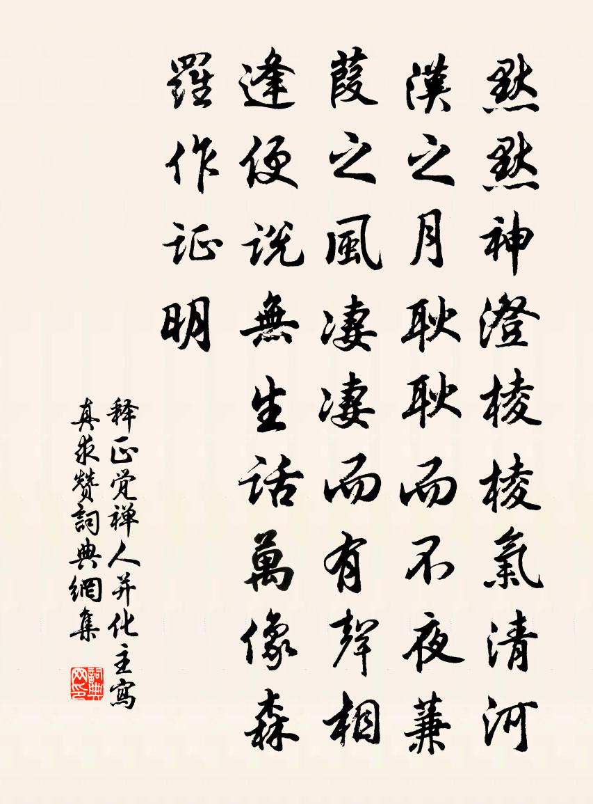 詩詞名句歷史字典書法欣賞書法字典國語詞典說文解字康熙字典古漢語字典標 題 作 者 詩 句 禪人並化主寫真求贊作者:釋正覺 朝代:宋代禪人並化主寫真求贊原文默默神澄,稜稜氣清。河漢之月耿耿而不夜,蒹葭之風淒淒而有聲。相逢便說無生話,萬像森羅作證明。詩詞問答問:禪人並化主寫真求贊的作者是誰?答:釋正覺問:禪人並化主寫真求贊寫於哪個朝代?答:宋代釋正覺禪人並化主寫真求贊書法欣賞禪人並化主寫真求贊書法作品詩詞推薦鷓鴣天崔敦禮〔宋代〕王母瑤池景物鮮。蟠桃華寶不知年。天教把定春風笑,來作人間長壽仙。披蕊芨,誦雲篇。朝朝香火篆爐煙。只將次韻慎思貽無咎文潛誦詩蔡肇〔宋代〕臥聽高齋落葉風,清詩交詠想晨鐘。故人厚意論千載,正始遺音僅一逢。膠漆初期在俄頃,雲龍莫恨不相從。芸房和武公望雪梅五首廖行之〔宋代〕自是陽和生處有,不同凡卉競時開。居然茹雪猶全節,底為藏冰但卻災。望江南/憶江南華清淑〔宋代〕燕塞雪,片片大如拳。薊上酒樓喧鼓吹,帝城車馬走駢闐。羈館獨悽然。燕塞月,缺了又還圓。萬里妾心愁更苦,游清都觀尋沈道士得仙字劉孝孫〔唐代〕紛吾因暇豫,行樂極留連。尋真謁紫府,披霧覿青天。緬懷金闕外,遐想玉京前。飛軒俯松柏,抗殿接雲煙。滔滔上運使工部強至〔宋代〕天地熊慳英氣,人皆所得偏。公乎何卓越,熊乃獨純全。精學窺神{奧米換采},遺經討聖淵。辭宗師者眾,詩將南征陸龜蒙〔唐代〕丞相南征定有無,幕中誰是騁良圖。遙知賊膽縱橫破,繞帳生犀一萬株。次韻許節推喜雨陳造〔宋代〕昨夕聽雨喜不寐,清曉欲作喜雨詩。捻髭臨紙筆未落,墮前乃獲瓊瑰辭。白鵝免烹巫不鼓,麥田欲乾沛甘雨。玄璧西陂余復〔宋代〕涉海波濤險,登山足力疲。胡為赤鑒游,海角山之涯。崎嶇亂石間,況復乘船危。茲游固有意,訪古傷今時。荒陂柏蘇軾〔宋代〕故園多珍木,翠柏如蒲葦。幽囚無與樂,百日看不已。時來拾流膠,未忍踐落子。當年誰所種,少長與我齒。仰視寇中逃山蕭澥〔宋代〕才入林巒屏跡時,此身自幸少人知。嬰孩底苦不解事,偏是怕時方始啼。鮮于大任自吳下來比與之飲大任自取毗陵惠山晁公溯〔宋代〕君從毗陵來,載酒與偕行。釀以陸子泉,可使滄父驚。香味橄欖嚴,顏色蒲萄清。得非續玉漿,無乃挹金莖。固應送樓煩李別駕許渾〔唐代〕琴清詩思勞,更欲學龍韜。王粲暫停筆,呂虔初佩刀。夜吟關月靜,秋望塞雲高。去去從軍樂,雕飛代馬豪。答王甫判官示遊興慶池之作黃庶〔宋代〕東池十里近,遭匝風物飽。南山若戶屏,登臨四時好。我初來長安,腳擬朝夕到。 * 簿書間,拘窘若囚盜。一歲甲申元日王夢應〔宋代〕上日仍漂寄,尊前又客非。鄉心眠聽雨,病骨晚添衣。街鼓春將動,簾燈寒未歸。梅花經一雪,幾片不曾飛。到家旬余意味甚適戲書陸游〔宋代〕天恐紅塵著腳深,不教經歲去山林。欲酬清淨三生願,先洗功名萬里心。石鼎颼飀閒煮茗,玉徽零落自修琴。晚來月夜與兄公度納涼閒行至御橋梅堯臣〔宋代〕夕月吐澄明,陰雲淨如掃。空庭引天翠,爽氣生懷抱。家近御橋頭,因為橋畔游。倚欄波上影,不共水東流。思歸偈三十五首釋祖珍〔宋代〕岩谷相從始晏然,又攜瓶錫應時緣。奉川此去無多遠,興發何妨訪戴船。雨中五首張耒〔宋代〕節物即自好,客心何落然。早寒清野市,夜雨濕江天。破屋疏茅滴,空廚濕葦煙。政須一杯酒,相與度殘年。送王侍御赴宣城(一作赴越城令)許棠〔唐代〕戴豸卻驅雞,東南上句溪。路過金谷口,帆轉石城西。水樹連天暗,山禽繞郡啼。江人諳舊化,那復俟招攜。名句推薦青山欲共高人語。聯翩萬馬來無數。辛棄疾《菩薩蠻·金陵賞心亭為葉丞相賦》 五月雖熱麥風清,檐頭索索繰車鳴。王建《田家行》 菩提本無樹,明鏡亦非台。惠能《菩提偈》 和平處事,勿矯俗為高;正直居心,勿設機以為智。王永彬《圍爐夜話·第六五則》 小溪清水平如鏡,一葉飛來浪細生。徐璣《秋行》 秋蕭索。梧桐落盡西風惡。黃機《憶秦娥·秋蕭索》 共眠一舸聽秋雨,小簟輕衾各自寒。朱彝尊《桂殿秋·思往事》 明月別枝驚鵲,清風半夜鳴蟬。辛棄疾《西江月·夜行黃沙道中》 在世百年,那有三萬六千日之樂。程登吉《幼學瓊林·卷二·老幼壽誕》 野徑雲俱黑,江船火獨明。杜甫《春夜喜雨》