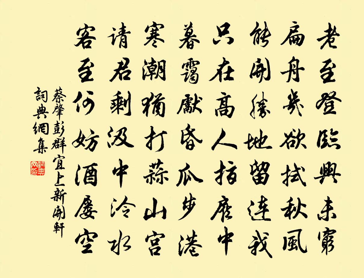 詩詞名句歷史字典書法欣賞書法字典國語詞典說文解字康熙字典古漢語字典標 題 作 者 詩 句 彭群宜上新開軒作者:蔡肇 朝代:宋代彭群宜上新開軒原文老至登臨興未窮,扁舟幾欲拭秋風。能開勝地留連我,只在高人指雇中。暮靄先昏瓜步港,寒潮猶打蒜山宮。請君剩汲中泠水,客至何妨酒屢空。詩詞問答問:彭群宜上新開軒的作者是誰?答:蔡肇問:彭群宜上新開軒寫於哪個朝代?答:宋代蔡肇彭群宜上新開軒書法欣賞彭群宜上新開軒書法作品詩詞推薦謝彭大夫惠寒山詩三首曹勛〔宋代〕人生大塊內,徒以蟻旋磨。不有明眼人,何能知己過。直指識自性,老甑必破墮。身詩忽兼忘,嘉惠天來大。句釋惠崇〔宋代〕孤雲還靜境,遠籟發秋空。偈頌十五首釋寶印〔宋代〕初三十一,中九下七。眾眼難瞞,當機莫惜。奉送王相公赴幽州(一作韓翃詩,題下有巡邊二字)張繼〔唐代〕黃閣開幃幄,丹墀拜冕旒。位高湯左相,權總漢諸侯。不改周南化,仍分趙北憂。雙旌過易水,千騎入幽州。塞草送劉太白(太白居從善坊)元稹〔唐代〕洛陽大底居人少,從善坊西最寂寥。想得劉君獨騎馬,古堤愁樹隔中橋。夜呈欽止審知時欽止歸自三衢趙蕃〔宋代〕政爾相從問阿兄,忽聞門外竹車鳴。對床縱復無今雨,展卷不妨同短檠。頗念興乘聊一詣,卻憐侍立苦頻更。風微鹹陽道中作魏野〔宋代〕渭水凍無波,終南翠色多。雲臨殘照霽,客向故城過。驚雁遠猶叫,牧童寒不歌。心愁人不會,謂我欲求何。調二舉子石延年〔宋代〕司空憐汝汝須知,月下敲門更有誰。叵耐一雙窮相眼,得便宜是落便宜。壽陸放翁三首蘇泂〔宋代〕花間乳鹿笑相迎,拄杖穿花導鹿行。六子子孫俱宦達,三山山水亦聰明。論詩何止高南渡,草檄相看了北征。帶得寄興化黃主簿杞賀鑄〔宋代〕何準第五不足稱,黃童無雙非自名。卑棲鸞鳳安初仕,葆練龍虎希長生。明月高吟紫芝曲,紅塵先老白雲兄。莫辭詠雪李世民〔唐代〕潔野凝晨曜,裝墀帶夕暉。集條分樹玉,拂浪影泉璣。色灑妝檯粉,花飄綺席衣。入扇縈離匣,點素皎殘機。白雲山見五色雀李昴英〔宋代〕羅浮禽五色,創見此山椒。錦羽嬉同墜,鐵冠遷最喬。疑隨仙雙過,喜趁白雲招。貴客非關我,勞渠千里遙。春雨徐凝〔唐代〕花時悶見聯綿雨,雲入人家水毀堤。昨日春風源上路,可憐紅錦枉拋泥。和孫偉卿雜言十章陳傅良〔宋代〕墮落生死間,大患為有身。老子識未破,天地豈不仁。浣溪沙辛棄疾〔宋代〕父老爭言雨水勻。眉頭不似去年顰。殷勤謝卻甑中塵。啼鳥有時能勸客,小桃無賴已撩人。梨花也作白頭新。如夢令 蒙友惠詞王哲〔元代〕明月古今長有。怎奈華宗海口。黑窟裡頭居。黯不分夜晝。吾友。吾友。問你如何下手。春朝早起范成大〔宋代〕莫笑眠常早,還憐起不遲。穠香溫夜氣,小雨濕春姿。瘦比中年甚,寒惟病骨知。羨渠兒女健,繞屋探南枝。丁未上巳重遊龍隱岩章峴〔宋代〕溪乾艤棹訪岩扉,危磴攀緣不欲歸。垂乳滴聲當佛座,宿雲留潤在僧衣。聊開禊席臨流水,閒擲文竿到落暉。旅宦早行熊皎〔唐代〕結束何妨早,將行四顧頻。山前猶見月,陌上未逢人。遠樹動宿鳥,危橋怯病身。漸明恆 * ,應免復迷津。偈頌二十一首釋堅璧〔宋代〕木人夜半穿靴,難尋蹤跡。石女天明不露,誰辨親疎。枯木上一點春回,古渡頭千尋寒雪。同門出入不來還憶渠,名句推薦天際兩蛾凝黛,愁與恨、幾時極。韓元吉《霜天曉角·題採石蛾眉亭》 古人不見今時月,今月曾經照古人。佚名《增廣賢文·上集》 去年米貴闕軍食,今年米賤大傷農。杜甫《歲晏行》 上窮碧落下黃泉,兩處茫茫皆不見。白居易《長恨歌》 前山急雨過溪來,盡洗卻、人間暑氣吳潛《鵲橋仙·扁舟昨泊》 相逢清露下,流影濕衣襟。袁枚《夜過借園見主人坐月下吹笛》 君看蕭蕭只數葉,滿堂風雨不勝寒。李東陽《柯敬仲墨竹》 階下青苔與紅樹,雨中寥落月中愁。李商隱《端居》 行雲歸楚峽,飛夢到揚州。晁補之《臨江仙·綠暗汀洲三月暮》 芭蕉不展丁香結, 同向春風各自愁。李商隱《代贈二首》