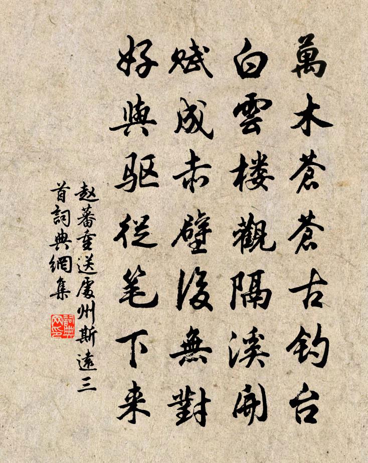 詩詞名句歷史字典書法欣賞書法字典國語詞典說文解字康熙字典古漢語字典標 題 作 者 詩 句 重送處州斯遠三首作者:趙蕃 朝代:宋代重送處州斯遠三首原文萬木蒼蒼古釣台,白雲樓觀隔溪開。賦成赤壁後無對,好與驅從筆下來。詩詞問答問:重送處州斯遠三首的作者是誰?答:趙蕃問:重送處州斯遠三首寫於哪個朝代?答:宋代趙蕃重送處州斯遠三首書法欣賞重送處州斯遠三首書法作品詩詞推薦凌雲閣潘興嗣〔宋代〕蕭峰頂上與雲齊,一派溪流直下飛。擊破寒冰千萬片,涵林幽響動清暉。題王叔范自耕園葉適〔宋代〕自耕不要從人得,知在盧南第幾街。吳地於今說佳麗,浙人自昔巧安排。包容花竹春留巷,謝遣蒲荷雪滿涯。必想送裴如晦宰吳江梅堯臣〔宋代〕吳江田有粳,粳香舂作雪。吳江下有鱸,鱸肥膾堪切。炊粳調橙齏,飽食不為餮。月從洞庭來,光映寒湖凸。長橋山中古墓釋文珦〔宋代〕白石蒼苔路,荒涼古墓門。看來百歲後,曾有幾人存。故物余翁仲,今誰是子孫。狐狸空敗穴,殘魄不能言。送蘄州李郎中赴任劉禹錫〔唐代〕楚關蘄水路非賒,東望雲山日夕佳。薤葉照人呈夏簟,松花滿碗試新茶。樓中飲興因明月,江上詩情為晚霞。北地明日雨止復招子駿堯夫游南園司馬光〔宋代〕昨朝洛北阻游陪,惆悵中橋半醉回。潑火既經寒食雨,解酲須撥凍醪醅。答詩友徵近詩曾由基〔宋代〕寄傲西峰未肯東,論文舊約幾時同。不知傑句真何用,便有虛名豈療窮。珍重遠書徵近作,疏蕪故我欠新功。每慚夏中雜興陸游〔宋代〕心慕羲農世,躬行黃老言。采椽聊築舍,橫木即為門。短髮冠龜屋,空床枕竹根。從來薄世味,染指肯嘗黿?次韻方去言用予喜歸韻見寄三首方回〔宋代〕秋高親見老崖來,險阻嵌崎付一杯。萬古懸知名不夜,九泉誰免骨為灰。輕鷗熟與風波狎,勁柏寧資糞壤栽。卻笑鳥散余花落孔溫業〔唐代〕美景春堪賞,芳園白日斜。共看飛好鳥,復見落余花。來往驚翻電,經過想散霞。雨餘飄處處,風送滿家家。求友隆興書堂自警三十五首陳淳〔宋代〕氣稟微有偏,積習日蕃衍。矯厲工弗深,其末必猶反。驀山溪佚名〔宋代〕當時曾見,上苑東風暖。今歲卻相逢,向煙村、亭邊驛畔。垂鞭立馬,一晌黯無言,江南信,壽陽人,悵望成斷腸泊祠下詩蘇泂〔宋代〕潮小淹留孝子祠,雪花須要老夫詩。鐘聲篷底不知處,卻似姑蘇夜泊時。聞福昌院春日一川花卉最盛蔡襄〔宋代〕山前溪上最宜春,千樹夭桃一雨新。爭得扁舟隨水去,亂花深處問秦人。偈二首釋守道〔宋代〕不從一地至一地,寂滅性中寧有位。釋迦稽首問然燈,仁者何名為受記。和虞道二十三弟晃沖之〔宋代〕向別已復久,此懷誰與明。書來慰吾意,詩重識君情。放鶴惜未到,飛鴻今尚橫。何由一隨汝,端為薄浮名。制梅花湯陳郁〔宋代〕南枝開處覓春光,摘得冰葩密瓮藏。留煮牛湯消暑渴,吟騷才頰有浮香。絕句尼正覺〔宋代〕春朝湖上風兼雨,世事如花落又開。退省閉門真樂處,閒雲終日去還來。山居七詠湛然亭方岳〔宋代〕一念惟余睡作魔,鷗閒不與世同波。邇來定力空諸妄,如以摩尼照濁河。送李四清吳可〔宋代〕連侯愛畫魚,李侯愛畫山。詩情動幽懷,摹寫不少閒。騷雅移丹青,妙寄雲水間。翻然欲登涉,試尋芷與蘭。我不名句推薦松樹千年終是朽,槿花一日自為榮。白居易《放言五首·其五》 無數春筍滿林生,柴門密掩斷行人。杜甫《詠春筍》 歸雁橫秋,倦客思家。張可久《折桂令·九日》 寒蟬鳴處,回首斜陽暮。趙彥端《點絳唇·途中逢管倅》 湖山信是東南美,一望彌千里蘇軾《虞美人·有美堂贈述古》 洛陽城東桃李花,飛來飛去落誰家?劉希夷《代悲白頭翁 / 白頭吟 / 有所思》 操吳戈兮被犀甲,車錯轂兮短兵接。屈原《國殤》 猿鳥猶疑畏簡書,風雲常為護儲胥。李商隱《籌筆驛》 丹漆不文,白玉不雕佚名《孔子家語·好生》 登泰山而小天下。孟子《孟子·盡心章句上·第二十四節》
