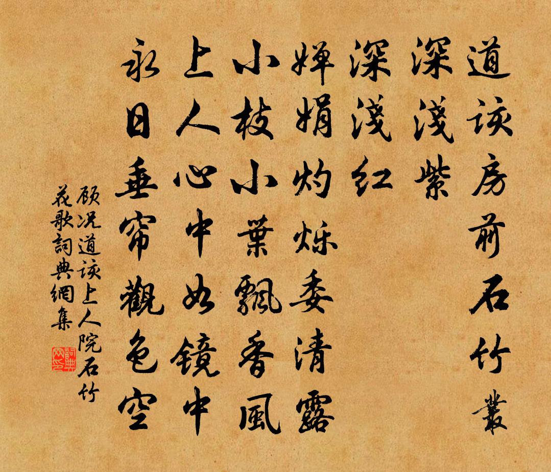 詩詞名句歷史字典書法欣賞書法字典國語詞典說文解字康熙字典古漢語字典標 題 作 者 詩 句 道該上人院石竹花歌作者:顧況 朝代:唐代道該上人院石竹花歌原文道該房前石竹叢,深淺紫,深淺紅。嬋娟灼爍委清露,小枝小葉飄香風。上人心中如鏡中,永日垂簾觀色空。詩詞問答問:道該上人院石竹花歌的作者是誰?答:顧況問:道該上人院石竹花歌寫於哪個朝代?答:唐代問:道該上人院石竹花歌是什麼體裁?答:七古顧況道該上人院石竹花歌書法欣賞道該上人院石竹花歌書法作品注釋全唐詩:卷883-4詩詞推薦步步嬌佚名〔宋代〕休執性為真。如何出陽神。十個九個守,頑空。若得命基帶了性。白面做燒餅,有準。長門怨鄒登龍〔宋代〕怨殺宮門不忍開,無情孤月暗蒼苔。而今痛惜珊瑚枕,曾是君王賜御來。孫倅書尾附二詩曹勛〔宋代〕已作驚禽不擇柯,異鄉那復困風波。別來莫訝書悽惻,憂患艱難我最多。八音歌贈晁堯民黃庭堅〔宋代〕金荷酌美酒,夫子莫留殘。石有補天材,虎豹守九關。絲窠將柳花,入戶撲衣冠。竹風搖永日,思與子盤桓。匏瓜和彥逢弟簡相山古上人二首王之道〔宋代〕蒿艾深迷古徑苔,荒涼菊塢與松栽。稻田正似人無幾,賴有高僧伴我來。送夏侯正言奉使江南王禹偁〔宋代〕百舌關關麥壠青,遠山迎馬翠如屏。禁中已誦相如賦,江外猶看使者星。衣拂茶煙尋水寺,枕欹梅雨泊沙汀。歸期金縷曲(壽陳靜山)劉辰翁〔宋代〕昨醉君家酒。從今十萬八千場,未收老友。人道水仙標格俊,不許梅花殿後。但贏得、一年年瘦。迤邐聚星樓上雪南徐晚望褚載〔唐代〕芳草鋪香晚岸晴,岸頭含醉去來行。僧歸岳外殘鍾寺,日下江邊調角城。入浙孤帆知楚信,過淮疏雨帶潮聲。如今和耕甫弟梅杜范〔宋代〕數點冰葩與雪宜,有人著眼水邊籬。從渠疎影初傳句,自此清吟未有詩。曾到孤山飛鶴處,恰思偃樹跨鯨時。李園送聖民出城即事張耒〔宋代〕東風堤上送行人,漸出城來漸少塵。柳色已深花又落,客來下馬獨傷春。題諸色扇二首宋度宗〔宋代〕履霜知地凍,賞雪念民寒。山嵐迷曉月,海浪起晴雲。鷺起蓮邊曉,鷗棲蓼外涼。西風欹翠蓋,曉露浥紅裳。艷紅疏懶一首蘇籀〔宋代〕省寺周行占姓名,老耽攝養道幾成。生緣瑣悄同瓮算,居處閒靜惟瓶笙。求己洗心祛習氣,知非窮理勇移更。鴻生烏衣園方岳〔宋代〕吳宮晉苑半桑麻,路入長乾野草花。秋晚夕陽空巷陌,蓄時燕子幾人家。不攜妓與東山醉,曾賭碁輸別墅嘩。已近蘭陵王張元乾〔宋代〕卷朱箔。朝雨輕陰乍閣。闌乾外,煙柳弄晴,芳草侵階映紅藥。東風妒花惡。吹落。梢頭嫩萼。屏山掩,瀋水倦熏次韻張秘校喜雪三首黃庭堅〔宋代〕落月煙沙靜渺然,好風吹雪下平田。瓊瑤萬里酒增價,桂玉一炊人少錢。學子已占秋食麥,廣文何憾客無氈。睡余南柯子/南歌子佚名〔宋代〕積雪迷松逕,圍爐掩竹扉。床頭一味有蹲鴟。軟火深開香熟、已多時。自得陶朱法,休教懶瓚知。浪傳黃獨正甘肥浣溪沙·風遞殘香出繡簾孫光憲〔五代〕風遞殘香出繡簾,團窠金鳳舞襜襜,落花微雨恨相兼。何處去來狂太甚,空推宿酒睡無厭,怎教人不別猜嫌?題迎薰閣張硯〔宋代〕解慍風來處,朱甍起舊城。條山供偃蹇,鹽澤借澄泓。龍廟疑飛出,蓮宮若化成。亂雲堆素彩,遠溜集幽聲。逸驥柴桑山易士達〔宋代〕千古先生節最高,功名識破等鴻毛。如今亦作柴桑隱,只把荷衣當綠袍。遣興鄧深〔宋代〕頗覺今朝好,全無俗事關。風清林鶴喜,雨霽野雲閒。橘柚垂枝重,莓苔上砌斑。芼羹挑野菜,風味不吾慳。名句推薦天寒水鳥自相依,十百為群戲落暉。秦觀《還自廣陵》 右手畫圓,左手畫方,不能兩成。韓非及後人《韓非子·功名》 豈知民力艱,顆米皆琳琅。黃燮清《秋日田家雜詠》 城上風光鶯語亂,城下煙波春拍岸。錢惟演《木蘭花·城上風光鶯語亂》 雪聲偏傍竹,寒夢不離家。戎昱《桂州臘夜》 野雲萬里無城郭,雨雪紛紛連大漠。李頎《古從軍行》 近鄉情更怯,不敢問來人。宋之問《渡漢江》 漢水東流,都洗盡、髭鬍膏血。辛棄疾《滿江紅·漢水東流》 君問歸期未有期,巴山夜雨漲秋池。李商隱《夜雨寄北》 亦有白骨歸鹹陽,營家各與題本鄉。王建《渡遼水》