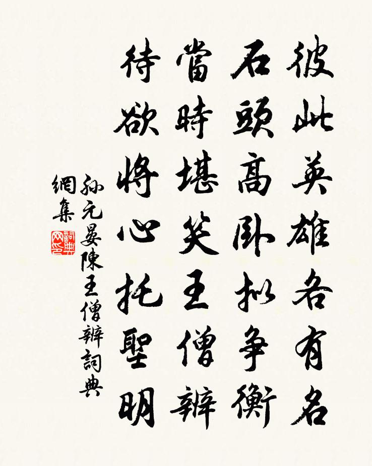 詩詞名句歷史字典書法欣賞書法字典國語詞典說文解字康熙字典古漢語字典標 題 作 者 詩 句 陳王僧辨作者:孫元晏 朝代:唐代陳王僧辨原文彼此英雄各有名,石頭高臥擬爭衡。當時堪笑王僧辨,待欲將心托聖明。詩詞問答問:陳王僧辨的作者是誰?答:孫元晏問:陳王僧辨寫於哪個朝代?答:唐代孫元晏陳王僧辨書法欣賞陳王僧辨書法作品注釋全唐詩:卷767-63詩詞推薦天香汪元量〔宋代〕遲日侵階,和風入戶,朱弦欲奏還倦。一幅鸞箋,五雲飛下,賜予內家琴苑。音隨指動,猶彷佛、虞薰再見。妙處送復夢赴韋令幕元稹〔唐代〕世上於今重檢身,吾徒耽酒作狂人。西曹舊事多持法,慎莫吐他丞相茵。游南嶽張喬〔唐代〕入岩仙境清,行盡復重行。若得閒無事,長來寄此生。澗松閒易老,籠燭晚生明。一宿泉聲里,思鄉夢不成。虞美人李太古〔宋代〕西風海色秋無際。雙淚如鉛水。牡羊成隊夢初平。掛杖敲雲、雲外曉鴻驚。小瓊閒抱銀箏笑。問有芳卿否。玉書分偈公六十五首釋鹹傑〔宋代〕生鐵鑄牛頭,牽犁還拽杷。智者笑忻忻,愚人驚怪差。古往今來幾百年,更向鬼門重貼卦。棹上官良史釋善珍〔宋代〕京口見君乘早潮,短巾調笑立溪橋。長瓶買酒典孤劍,一夜枕書談六朝。常恐騎鯨狂捉月,不然跨鶴坐橫簫。遠公題金陵雜興詩後十八首李璉〔宋代〕池邊石是南朝石,綠梁苔花亦可憐。今日波平人事變,白魚猶自躍天泉。愛山堂趙蕃〔宋代〕朝從日掛鉦,暮至月吐璧。坐得少文圖,不資康樂屐。邊上逢歌者張祜〔唐代〕垂老秋歌出塞庭,遏雲相付舊秦青。少年翻擲新聲盡,卻向人前側耳聽。和陶擬古九首蘇軾〔宋代〕沉香作庭燎,甲煎粉相和。豈若炷微火,縈煙嫋清歌。貪人無饑飽,胡椒亦求多。朱劉兩狂子,隕墜如風花。本欲送李瑜屯田通判潤州韓維〔宋代〕耳熟江南勝事傳,聞君官去便翛然。江流截楚紅塵斷,山勢吞吳秀色連。紫蟹迎霜新受釣,黃花吹酒正當前。嗟予和酬宋竹坡韻郭鈺〔元代〕寄詩問我山中事,性懶家貧一事無。春瓮酒香梅未落,午窗夢起鳥相呼。舊來叔夜交遊絕,老去文通筆硯枯。鷗社念奴嬌(上德安王文甫生辰)石孝友〔宋代〕麥秋天氣,正玉杓斡暑,熏弦鳴律。浴佛生朝初過也,還數佳辰三日。筮水呈祥,夢熊葉慶,寶運符千一。太平朝燈花梅堯臣〔宋代〕灼灼生寒燼,終朝照席明。從教占有驗,燃滅本無情。赴無錫別靈一上人(寄靈一上人)劉長卿〔唐代〕高僧本姓竺,開士舊名林。一入春山里,千峰不可尋。新年芳草遍,度日白雲深。欲問微官去,懸知訝此心。次韻謝遁翁吳山長孔昭三首方回〔宋代〕乾淳一老去非賒,里社游談亦孔嘉。仙馭不還緱氏鶴,禪機空說趙州茶。神農為我先嘗藥,迦葉誰今又笑花。欲向同於汝錫賞白牡丹王建〔唐代〕曉日花初吐,春寒白未凝。月光裁不得,蘇合點難勝。柔膩於雲葉,新鮮掩鶴膺。統心黃倒暈,側莖紫重棱。乍斂徐懋功餉酒用其韻劉克莊〔宋代〕少時酒伴盡豪雄,歲晚瓶罍一併空。方嘆獨醒吟澤畔,忽勤分餉到籬東。鯤鯨有量真溟涬,螟蠃無知妄異同。老矣留春令高觀國〔宋代〕粉綃輕試,綠裙微褪,吳姬嬌小。一點清香著芳魂,便添起、春懷抱。玉臉窺人舒淺笑。寄此情天渺。酒醒羅浮角送梅子明還吳孔武仲〔宋代〕姑蘇限雲水,官舍隱蓬萊。出汴青山涌,橫江畫舸開。家園雖渴別,書社早歸來。新命鄉人喜,神仙舊姓梅。名句推薦應憐屐齒印蒼苔,小扣柴扉久不開。葉紹翁《遊園不值》 愚而好自用,賤而好自專。生乎今之世,反古之道。如此者災及其身者也。子思《中庸·第二十八章》 佳期大堤下,淚向南雲滿李白《大堤曲》 天門中斷楚江開,碧水東流至此回。李白《望天門山》 蒂有餘香金淡泊,枝無全葉翠離披。曹雪芹《殘菊》 不戚戚於貧賤,不汲汲於富貴。陶淵明《五柳先生傳》 遠水難救近火,遠親不如近鄰。佚名《增廣賢文·上集》 無常安之國,無宜治之民戴聖《大戴禮記·保傅第四十八》 長江千里,煙淡水雲闊。李綱《六么令·次韻和賀方回金陵懷古鄱陽席上作》 或飲食,或坐走。長者先,幼者後。李毓秀《弟子規·出則弟》