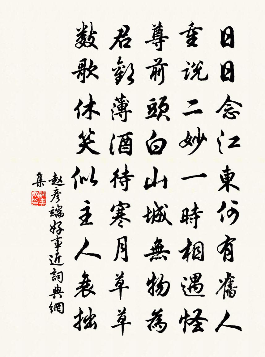 詩詞名句歷史字典書法欣賞書法字典國語詞典說文解字康熙字典古漢語字典標 題 作 者 詩 句 好事近作者:趙彥端 朝代:宋代好事近原文日日念江東,何有舊人重說。二妙一時相遇,怪尊前頭白。山城無物為君歡,薄酒待寒月。草草數歌休笑,似主人衰拙。詩詞問答問:好事近的作者是誰?答:趙彥端問:好事近寫於哪個朝代?答:宋代趙彥端好事近書法欣賞好事近書法作品詩詞推薦朝中措(五月菊)朱翌〔宋代〕玉台金盞對炎光。全似去年香。有意莊嚴端午,不應忘卻重陽。菖蒲九葉,金英滿把,同泛瑤觴。舊日東籬陶令,夏日閒書墨君堂壁二首文同〔宋代〕先人有敝廬,涪水之東邊。我罷漢中守,歸此聊息焉。是時五六月,赤日烘遙天。山川盡糝燥,草木皆焦燃。塵襟臥病枕上再用韻虞儔〔宋代〕領邑西來物物違,只應松竹舊相知。寬心雨意濃如酒,滿眼秋懷總是詩。慚愧不才勞撫字,平生何意羨輕肥。飄然秋日山居好十首舒岳祥〔宋代〕秋日山居好,星河頂上懸。聊隨兒女戲,也設果瓜筵。欹枕看星渡,開窗抱月眠。溪田六十日,接闕到紅鮮。送盧汀侍御歸天德幕孟郊〔唐代〕仲宣領騎射,結束皆少年。匹馬黃河岸,射鵰清霜天。旌旗防日北,道路上雲巔。古雪無銷鑠,新冰有堆填。清溪客思吟楊敬之〔唐代〕禾黍正離離,南園剪白芝。細腰沈趙女,高髻唱蠻姬。路愧前岡月,梳慚一頷絲。鄉人不可語,獨念畏人知。題檐蔔黃杞〔宋代〕春花狼藉餘,六出浄煩熱。衲衣凝夜禪,香散深林月。繡觀音酬郢州王知錄丹青美人之贈兩絕洪咨夔〔宋代〕十相端嚴具足身,一團楊柳淨瓶春。石城莫與蛾眉看,羞不如人卻妒人。南鄉子許有壬〔元代〕塵夢黍方炊。白鶴空中漫誦詩。飲啄適時爭得似,山雞。敢效妖狐更假威。曾與老仙期。衛國遭逢彼一時。千六百送徐倅陳著〔宋代〕堂堂東嘉英,文章筆如椽。箳篁駐鄞城,迎刃解劇煩。最聲徹閭闔,詔使歸日邊。人方辦杯水,前事乃不然。才難孅阿一絕蘇籀〔宋代〕不瑕彭澤願言中,都治姿年慧則通。揭調郡齋賓孺子,孅阿茜粲駐芳蹤。瀟湘神黃公紹〔宋代〕踏青青。踏青青。西泠橋畔草連汀。撲得龍船兒一對,畫闌倚遍看遊人。再次韻四首陳造〔宋代〕到眼浪岐官冷熱,遇人傳得酒逡巡。曼容東老俱通夢,不勸趨榮勸養神。謝人惠琴材謝邈〔唐代〕風撼桐絲帶月明,羽人乘醉截秋聲。七弦妙制饒仙品,三尺良材稱道情。池小未開春浪泛,岳低猶欠暮雲生。何因耕織嘆趙汝鐩〔宋代〕春氣薰陶蠶動紙,採桑兒女哄如市。晝飼夜餧時分盤,扃門謝客謹俗忌。雪團落架抽繭絲,小姑繰車婦織機。全家答求譜朱淑真〔宋代〕雨好解開花百結,風括扶起柳三眠。春醲釅處多傷感,那得心情事管弦。偈頌二百零五首釋正覺〔宋代〕雲門老子能施設,胡餅佛祖俱超越。哆哆和和兩片皮,狤狤獠獠三寸舌。不是特地展家風,也非投機應時節。生鐵張惕山人即昔所謂惠思師也余舊識之於京師忽蘇轍〔宋代〕聽誦長江近章句,喜逢澄觀已冠巾。醉吟揮弄清潮水,誰信從前戒律人。唐山赤縣距修門不二百里土風儉樸專務桑麻余錢時〔宋代〕深深澗谷唐昌縣,莽莽桑 * 歙風。但得長 * 阜俗,不消此外別言功。代佳人贈張郎中武元衡〔唐代〕洛陽佳麗本神仙,冰雪顏容桃李年。心愛阮郎留不住,獨將珠淚濕紅鉛。名句推薦青山一道同雲雨,明月何曾是兩鄉。王昌齡《送柴侍御》 深林人不知,明月來相照。王維《竹里館》 身多疾病思田裡,邑有流亡愧俸錢。韋應物《寄李儋元錫》 王者之宰民也,莫不同四海,一遠近, 為父母而子之。令狐德棻《周書·本紀·卷四》 縱被無情棄,不能羞。韋莊《思帝鄉·春日游》 覆巢之下,復有完卵劉義慶《世說新語·言語》 殷勤昨夜三更雨,又得浮生一日涼。蘇軾《鷓鴣天·林斷山明竹隱牆》 獨抱影兒眠,背看燈花落。汪懋麟《誤佳期·閨怨》 菱葉縈波荷颭風,荷花深處小船通。白居易《採蓮曲》 曉看紅濕處,花重錦官城。杜甫《春夜喜雨》