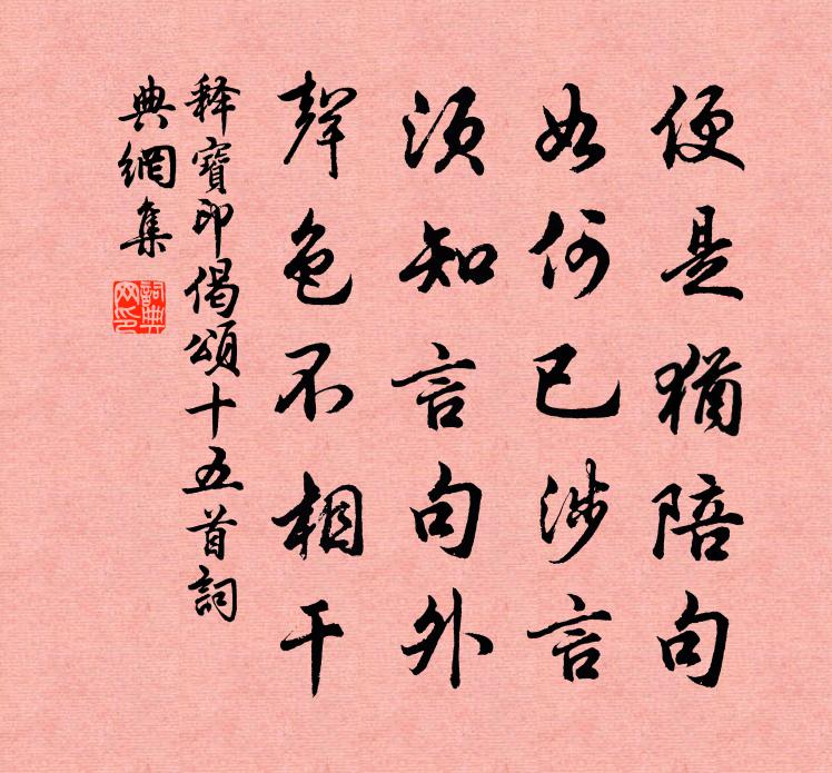 詩詞名句歷史字典書法欣賞書法字典國語詞典說文解字康熙字典古漢語字典標 題 作 者 詩 句 偈頌十五首作者:釋寶印 朝代:宋代偈頌十五首原文便是猶陪句,如何已涉言。須知言句外,聲色不相干。詩詞問答問:偈頌十五首的作者是誰?答:釋寶印問:偈頌十五首寫於哪個朝代?答:宋代釋寶印偈頌十五首書法欣賞偈頌十五首書法作品詩詞推薦宣清(林鐘商)柳永〔宋代〕殘月朦朧,小宴闌珊,歸來輕寒凜凜。背銀釭、孤館乍眠,擁重衾、醉魄猶噤。永漏頻傳,前歡已去,離愁一枕。元日高翥〔宋代〕長憶兒時二老傍,元正歲歲有風光。攙先禮數修人事,著好衣裳侍酒觴。回首不堪追日月,感情空嘆換星霜。尚期同莫子章方舟下龜溪袁說友〔宋代〕一舸相從下碧瀾,城南百里話更殘。絕知未減在家好,政自不愁行路難。舒望最堪詩眼縱,忘形只覺酒腸寬。歸來到家宋伯仁〔宋代〕塵壓征裘滿,今朝喜到家。牽衣兒欲淚,滿地菊初花。瓦甑添蒸芋,銅鐺旋煮茶。安貧儒者事,何必戀天涯。題義門胡氏華林書院何蒙〔宋代〕滿眼煙霞與宅連,義高孝弟代相傳。彤庭召對曾承詔,內府頒書特奉宣。學古一門遵法度,禮賓群仆盡精賢。竺齋記正月二十五日西湖之游十五首方回〔宋代〕石樑石柱石為碑,山拔泉飛石可移。兩玉堂仙一髠叟,自應名字萬年垂。臨濟贊釋祖先〔宋代〕揎拳捋肘,只有一個。電卷星飛,抬頭蹉過。羽扇亭李石〔宋代〕十里山光紺碧圍,瘴煙收盡溢春暉。黃紬睡美聞衛唱,白羽風高入指揮。樓角片雲隨雁去,谿頭驟雨送龍歸。君王春日病中李建勛〔唐代〕才得歸閒去,還教病臥頻。無由全勝意,終是負青春。綠柳漸拂地,黃鶯如喚人。方為醫者勸,斷酒已經旬。春霽高翥〔宋代〕積雪才收雲盡歸,長空一色碧琉璃。日移簾影臨書案,風颭瓶花落研池。巢燕學飛猶戀母,籠雞得食旋呼兒。眼看壬戌元日二首董嗣杲〔宋代〕萬里東風起楚皋,流年只染鬢蕭騷。富池江口聽春雨,昭勇樓心看雪濤。薄俗苦無公可論,全身惟有隱方高。故山題開元天寶遺事范成大〔宋代〕朝天車馬詔頻催,斸得新湯未敢開。忽報豬龍掀宇宙,阿瞞虛讀相書來。遊仙詞三十三首王鎡〔宋代〕金甲雷丁出巽宮,丹幢翠節擁靈童。五更飛去雌雄劍,一夜鹽池碧水紅。謝仲南和詩張耒〔宋代〕曾約西湖薄主人,只今湖色已知春。會須多載連車酒,絕勝寒倉滿目塵。對鏡吟白居易〔唐代〕白頭老人照鏡時,掩鏡沉吟吟舊詩。二十年前一莖白,如今變作滿頭絲。[餘二十年前曾有詩云:白髮生一莖,朝和薛仲止漁村雜詩十首劉黻〔宋代〕半生心力在吟編,鍊得形如孟浩然。水屋數間城市隔,客來無路呼船。小重山趙蕃〔宋代〕何地無溪祗欠人。有翁年八十,住其濱。直鉤元不事絲緡。優遊爾,聊以遂吾身。陶令賦歸辰。未嘗輕出入,犯風跋希遠細雨圖曹勛〔宋代〕牽風藻荇舞清漪,浪板無聲細雨時。小大自殊同隊樂,密圖勸學助韓詩。啄木行贈淨珇上人戴表元〔宋代〕東園嘹嘹山剝剝,有鳥晨飢啄霜木。天寒蟲豸得幾何,爪觜披猖良為腹。華堂蝙蝠添毛衣,飛蟻淨盡何處歸。海山即事二首王安石〔宋代〕雲從鍾山起,卻入鍾山去。借問山中人,雲今在何處。名句推薦夜戰桑乾北,秦兵半不歸。許渾《塞下曲》 風緊雁行高,無邊落木蕭蕭。納蘭性德《河瀆神·風緊雁行高》 牝雞無晨;牝雞之晨,惟家之索。佚名《尚書·周書·牧誓》 目前貧富非為準,久後窮通未可知。馮夢龍《醒世恆言·卷一》 仰天大笑出門去,我輩豈是蓬蒿人。李白《南陵別兒童入京》 燕歸花謝,早因循、又過清明。納蘭性德《紅窗月·燕歸花謝》 會稽愚婦輕買臣,余亦辭家西入秦。李白《南陵別兒童入京》 忍淚不能歌,試托哀弦語晏幾道《生查子·墜雨已辭雲》 萋萋芳草憶王孫。柳外樓高空斷魂。李重元《憶王孫·春詞》 今之孝者,是謂能養。至於犬馬皆能有養;不敬,何以別乎?孔子弟子《論語·為政篇》