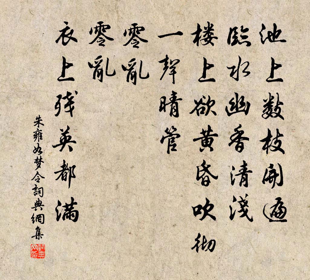 詩詞名句歷史字典書法欣賞書法字典國語詞典說文解字康熙字典古漢語字典標 題 作 者 詩 句 如夢令作者:朱雍 朝代:宋代如夢令原文池上數枝開遍。臨水幽香清淺。樓上欲黃昏,吹徹一聲晴管。零亂。零亂。衣上殘英都滿。詩詞問答問:如夢令的作者是誰?答:朱雍問:如夢令寫於哪個朝代?答:宋代問:如夢令是什麼體裁?答:詞朱雍如夢令書法欣賞如夢令書法作品詩詞推薦句藍元威〔宋代〕潤松盡作龍鍾結,匝地渾銷雁齒高。藤枕郭印〔宋代〕剡藤新織就,一榻共清涼。琥珀珍難得,龍頭貴莫當。不辭拳石冷,寧羨錦囊香。夢覺華胥樂,神怡四體康。題趙景安二亭尺五二首陳造〔宋代〕闛沓每疑坤軸動,撞唐更恐日車翻。憑欄待得波聲寂,擘絮依然掛海門。沖夜行施肩吾〔唐代〕夜行無月時,古路多荒榛。山鬼遙把火,自照不照人。黃筌鵲雛文同〔宋代〕短羽已褵褷,弱脛方屴岌。母也向何處,開口猶仰食。離陽翟張耒〔宋代〕驅車發潁川,回望失嵩少。霜氣塞層空,黯澹寒日曉。原田際天平,百里見飛鳥。累累道傍丘,石獸臥衰草。不知喜雨軒顏耆仲〔宋代〕六月炎炎苦旱災,斯民何罪守非材。爐煙未斷濃雲合,神物潛驅好雨來。苗槁復甦青易見,鬢愁雖喜白難回。也知次韻奉酬丁少詹見過同遊仙岩遇雨而別陳傅良〔宋代〕佳人何似似江梅,邂逅梅陰共舉杯。欲與溪山成勝話,卻因風雨得空回。新詩報我春乘興,小徑從今日掃埃。自是紫微方翥〔宋代〕學得天文夜睡遲,雲籠月照恨星稀。而今病眼都無力,猶向檐邊認紫微。和微之藥名勸酒王安石〔宋代〕赤車使者錦帳郎,從客珂馬留閒坊。紫芝眉宇傾一坐,笑語但聞雞舌香。藥名勸酒詩實好,陟厘為我書數行。真珠禪人並化主寫真求贊釋正覺〔宋代〕默默亡言,靈靈見根。鼓撾塗毒,香燒返魂。物物無心影受鏡,塵塵出礙聲逾垣。頌古十五首釋慧遠〔宋代〕行行月冷風高,步步山寒水深。逢人披肝露膽,見義劈腥剜心。記知聞近過關試韓儀〔唐代〕短行軸了付三銓,休把新銜惱必先。今日便稱前進士,好留春色與明年。念奴嬌陳三聘〔宋代〕餘霞飛綺,望長天、頃刻雲容凝碧。今夕江皋風力軟,明日波心頭白。客舸東流,語離深夜,遣我新愁積。春融花續夢中所見兩句林亦之〔宋代〕長劍歌明月,吳門一夜過。紅樓何處是,為說馬闌坡。木芙蓉黃庚〔宋代〕芙蓉一帶繞池塘,萬綠叢中簇艷妝。錯認園林春富貴,不知葉底有風霜。題昌山聖姥廟甘同叔〔宋代〕分宜古縣環清溪,重岡復嶺如賓士。行逢山斷水流處,閱城廟枕山之西。我來落日在前嶺,摩挲一讀廬肇碑。嗟唐嚴氏溪放歌行(溪在閬州東百餘里)杜甫〔唐代〕天下甲馬未盡銷,豈免溝壑常漂漂。劍南歲月不可度,邊頭公卿仍獨驕。費心姑息是一役,肥肉大酒徒相要。嗚呼芳樹納蘭性德〔清代〕連理無分影,同心豈獨芳?傍檐巢翡翠,臨水宿鴛鴦。葉葉含春思,枝枝向畫廊。君情若比樹,妾意復何傷?陌上呈齡叟二首陳著〔宋代〕溪山五里眼花中,萬變風光一總空。惟有老師無處語,依然只是舊家風。名句推薦燕子重來,往事東流去。吳文英《點絳唇·時霎清明》 清娥畫扇中,春樹鬱金紅。溫庭筠《清明日》 裊裊兮秋風,洞庭波兮木葉下。屈原《九歌·湘夫人》 燈半昏時,月半明時。徐再思《折桂令·春情》 馬毛縮如蝟,角弓不可張。鮑照《代出自薊北門行》 譽人不增其美。王充《論衡·卷八·藝增篇》 幾度思歸還把酒,拂雲堆上祝明妃。杜牧《題木蘭廟》 兒不嫌母醜,狗不嫌家貧。佚名《增廣賢文·下集》 君子遺人以財,不若善言。佚名《孔子家語·六本》 有緣千里來相會,無緣對面不相逢。施耐庵《水滸傳·第十四回》