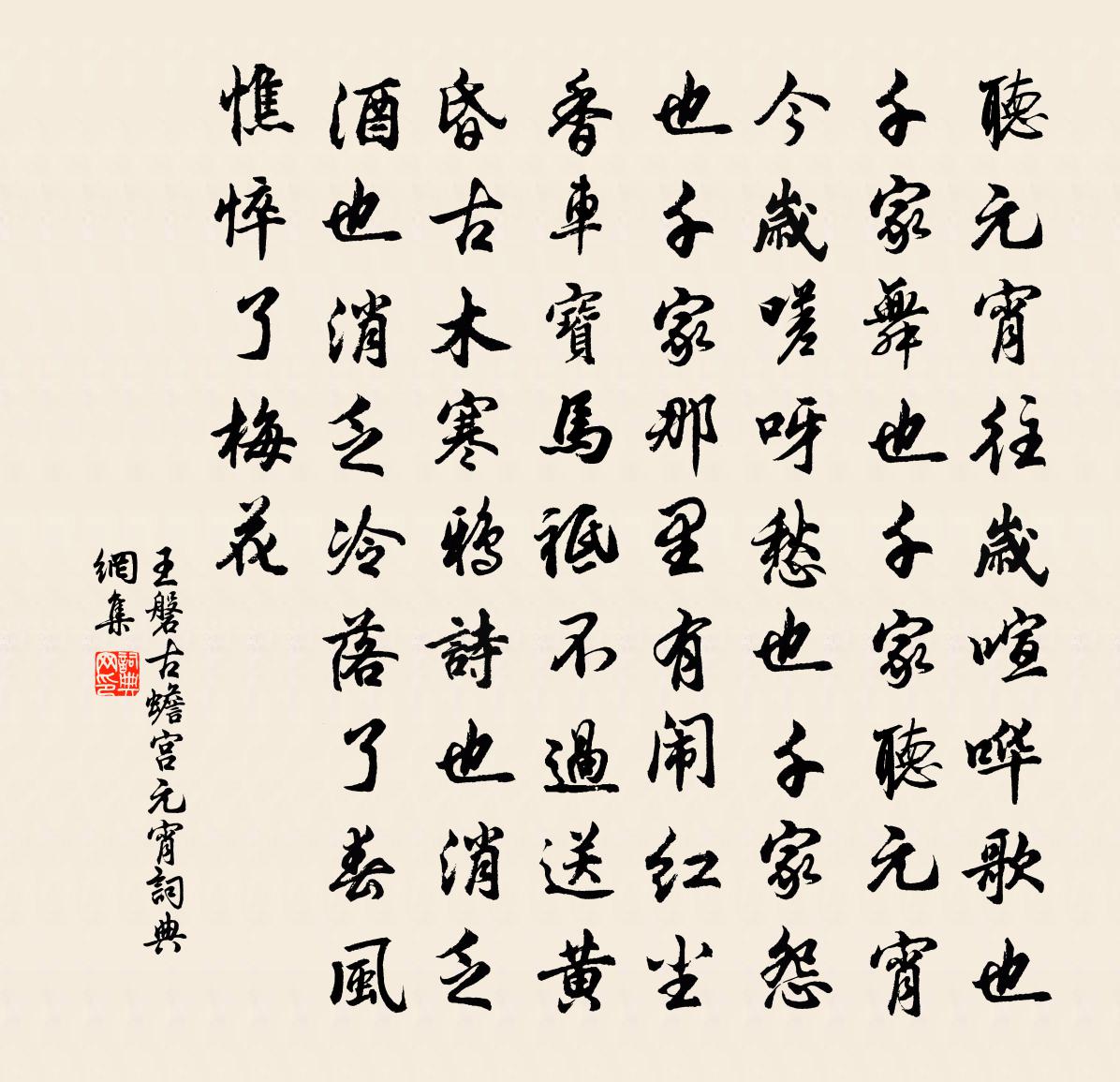 聽元宵,往歲喧譁,歌也千家,舞也千家。聽元宵,今歲嗟呀,愁也千家,怨也千家。那裡有鬧紅塵香車寶馬?祗不過送黃昏古木寒鴉。詩也消乏,酒也消乏,冷落了春風,憔悴了梅花。