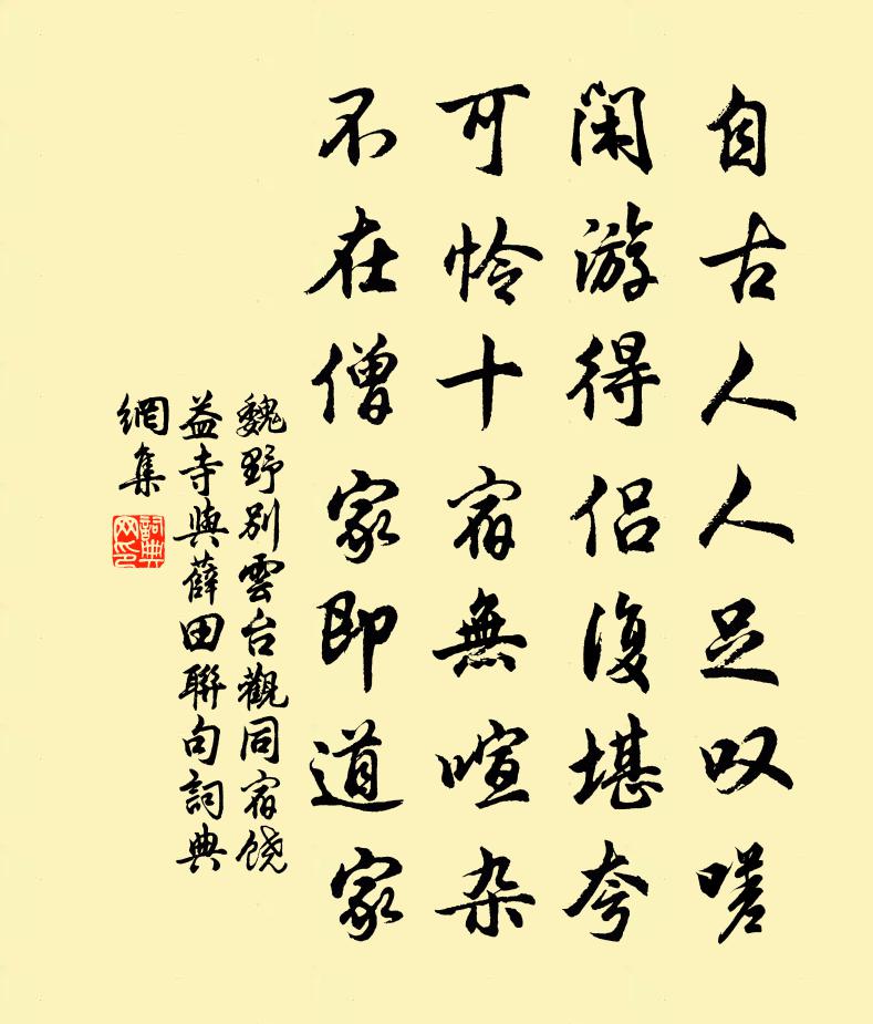 詩詞名句歷史字典書法欣賞書法字典國語詞典說文解字康熙字典古漢語字典標 題 作 者 詩 句 別雲台觀同宿饒益寺與薛田聯句作者:魏野 朝代:宋代原文自古人人足嘆嗟,閒遊得侶復堪夸。可憐十宿無喧雜,不在僧家即道家。詩詞問答問:《別雲台觀同宿饒益寺與薛田聯句》的作者是誰?答:魏野問:該詩寫於哪個朝代?答:宋代書法欣賞別雲台觀同宿饒益寺與薛田聯句書法作品詩詞推薦晚登信美亭宋庠〔宋代〕磴道盤紆薄晚雲,天邊疑見斗方春。清風萬里知何意,吹盡華纓漠漠塵。七十翁吟七言十絕方回〔宋代〕詩備眾體更須熟,文成一家仍不陳。晚悔昨非思改紀,規隨養氣省心人。六言雜興陸游〔宋代〕語道無如孔孟,佛莊雖似非同。倘有一人領會,何須客滿坐中。漢嗣唐彥謙〔唐代〕漢嗣安危係數君,高皇決意勢難分。張良口辨周昌吃,同建儲宮第一勛。水調歌頭(臘月二十一日可遠堂索賦)劉辰翁〔宋代〕落日半亭榭,山影沒壺中。蒼然欲不可極,迢遞未歸鴻。錦織家人何在,春寄故人不到,寂寞聽疏鍾。木末見江去送王居士游越皎然〔唐代〕野性配雲泉,詩情屬風景。愛作爛熳游,閒尋東路永。何山最好望,須上蕭然嶺。題弟侄書堂杜荀鶴〔唐代〕何事居窮道不窮,亂時還與靜時同。家山雖在干戈地,弟侄常修禮樂風。窗竹影搖書案上,野泉聲入硯池中。少年題晝寂軒徐壽仁〔宋代〕輕雲扶曲檻,少坐覺幽深。泛酒誰同話,敲詩獨寫心。竹聲流草榻,鳥語惹花陰。門外呼童掃,客彈月下琴。虎丘阻雨黃庚〔宋代〕石闌浸碧劍池空,池外秋聲萬壑風。人倚僧窗看風雨,亭亭塔影有無中。又呈慶伯趙蕃〔宋代〕下里又寒食,寒居猶去年。蕭條花不見,牢落病仍纏。強起陪親友,題詩未究宣。方欣好天色,雲氣復油然。木蘭花晏幾道〔宋代〕阿茸十五腰肢好,天與懷春風味早。畫眉勻臉不知愁,殢酒薰香偏稱小。東城楊柳西城草,月會花期如意少。思量江心寺林景熙〔宋代〕佛借龍宮五百年,平分城樹與村煙。叢林忽涌中流地,雙塔曾擎半壁天。石色帶雲籠客袖,磬聲和月落漁船。袈袍送謝處士南歸宋祁〔宋代〕歲晏心無著,時清遁更肥。江蒪縈箸滑,海鳥傍帆飛。鄉思生閩霧,吟懷入楚霏。趨庭多令子,采服間荷衣。石城金谷虛中〔唐代〕晉祚一傾摧,驕奢去不回。只應荊棘地,猶作綺羅灰。狐兔閒生長,樵蘇靜往來。踟躕意無盡,寒日又西頹。贊皇公張耒〔宋代〕才高一世有奇功,掩卷令人獨想風。莫笑狄祠遷武相,致人從古是英雄。觀安西兵過赴關中待命二首杜甫〔唐代〕四鎮富精銳,摧鋒皆絕倫。還聞獻士卒,足以靜風塵。老馬夜知道,蒼鷹飢著人。臨危經久戰,用急始如神。奇兵丁未十月見梅一點陳淳〔宋代〕清清一點玉,枯枝絕鮮鮮。歷歷霜林奇,未省有此妍。雅如哲君子,覺在群蒙先。揭之几案上,使我心洒然。仁和里雜敘皇甫湜(湜新尉陸渾)李賀〔唐代〕大人乞馬癯乃寒,宗人貸宅荒厥垣。橫庭鼠徑空土澀,出籬大棗垂朱殘。安定美人截黃綬,脫落纓裾瞑朝酒。還家夕陽劉筠〔宋代〕夕陽堪極目,況復近秋殘。寒逈橫煙紫,江清照葉丹。伍胥嗟路遠,潘子念行難。更有蕪城恨,城空逼夜寒。送圭子赴淮南總所排岸任陳宓〔宋代〕久叨簪紱裔,初筮帝王州。祖德期無忝,君恩要力酬。存心惟敬謹,律已必清修。千里書頻寄,重親鬢已秋。名句推薦共說春來春去事,多時。一點愁心入翠眉。晏幾道《南鄉子·花落未須悲》 小快害義,小慧害道,小辨害治,苟心傷德。劉向《說苑·談叢》 君子有三樂,而王天下不與存焉。孟子《孟子·盡心章句上·第二十節》 惜衣有衣,惜食有食。馮夢龍《警世通言·卷三》 荷絲傍繞腕,菱角遠牽衣蕭綱《採蓮曲》 夢入藍橋,幾點疏星映朱戶。吳文英《荔枝香近·七夕》 莊生曉夢迷蝴蝶,望帝春心托杜鵑。李商隱《錦瑟》 富貴必從勤苦得,男兒須讀五車書。杜甫《柏學士茅屋》 京口瓜洲一水間,鐘山只隔數重山王安石《泊船瓜洲》 黃鶴一去不復返,白雲千載空悠悠。崔顥《黃鶴樓 / 登黃鶴樓》