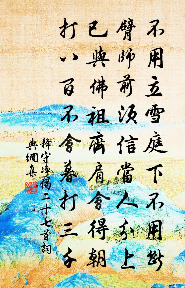 詩詞名句歷史字典書法欣賞書法字典國語詞典說文解字康熙字典古漢語字典標 題 作 者 詩 句 偈二十七首作者:釋守淨 朝代:宋代偈二十七首原文不用立雪庭下,不用斷臂師前。須信當人分上,已與佛祖齊肩。會得朝打八百,不會暮打三千。詩詞問答問:偈二十七首的作者是誰?答:釋守淨問:偈二十七首寫於哪個朝代?答:宋代釋守淨偈二十七首書法欣賞偈二十七首書法作品詩詞推薦還譚鳴玉北枝稿劉黻〔宋代〕天下惟此花,渠町南與北。有翁號北枝,似惋宇宙塞。紛紛紅紫蹊,陽春豈不力。枝北春雖遲,今古冰霜特。時熱少見客因詠所懷白居易〔唐代〕冠櫛心多懶,逢迎興漸微。況當時熱甚,幸遇客來稀。濕灑池邊地,涼開竹下扉。露床青篾簟,風架白蕉衣。院靜後梁宣明二帝碑堂下作劉禹錫〔唐代〕玉馬朝周從此辭,園陵寂寞對豐碑。千行宰樹荊州道,暮雨蕭蕭聞子規。伏虎壇胡融〔宋代〕顗公天人師,猛虎屢欲瞋。形體掘槁木,鷙心化為仁。猥廁龍象側,而作貓犬馴。礪齒怖天魔,掉尾迎山君。西伯頌古十六首釋心月〔宋代〕父母非親親是誰,雙眸烱烱帶雙眉。含元殿上不相識,正是岷峨相見時。閨情李白〔唐代〕流水去絕國,浮雲辭故關。水或戀前浦,雲猶歸舊山。恨君流沙去,棄妾漁陽間。玉箸夜垂流,雙雙落朱顏。黃鳥自嘆陸游〔宋代〕惡殺常根食,安貧但縕袍。消搖敢言達,簡默本非高。入剡逢飛雪,游吳看怒濤。平生笑漁父,苦語勸餔糟。御筆免房錢一旬李若水〔宋代〕風搖庭樹雲拍天,雪花亂拋如翦綿。舉頭三日不見日,屋檐已欹街已填。富兒圍爐笑浮頰,坐繞笙歌飛酒船。儒生歲暮懷崔峒耿湋司空曙〔唐代〕臘月江天見春色,白花青柳疑寒食。洛陽舊社各東西,楚國遊人不相識。贈鄭仁規方乾〔唐代〕一石雄才獨占難,應分二斗借人寰。澄心不出風騷外,落筆全歸教化間。蓮幕未來須更聘,桂枝才去即先攀。可憐和林簿二詩杜范〔宋代〕宦途元自險於山,我輩孤寒分外難。蕭寺羨君成勝概,新詩為我解愁端。知嘆落落無三語,底事區區為一官。初夏浣溪沙(種梅菊)辛棄疾〔宋代〕百世孤芳肯自媒。直須詩句與推排。不然喚近酒邊來。自有淵明方有菊,若無和靖即無梅。只今何處向人開。早夏寄元校書司空曙〔唐代〕獨游野徑送芳菲,高竹林居接翠微。綠岸草深蟲入遍,青叢花盡蝶來稀。珠荷薦果香寒簟,玉柄搖風滿夏衣。蓬蓽上平西王哲〔元代〕向終南,成遭遇,做風狂。便遊歷、海上嘉祥。閒閒得得,任從詞曲作詩章。自然神*,共交結、認正心香。真清南北史感遇十首司空圖〔唐代〕雨淋麟閣名臣畫,雪臥龍庭猛將碑。不用黃金鑄侯印,盡輸公子買蛾眉。漢世頻封萬戶侯,雲台空峻謝風流。江南賀新郎吳潛〔宋代〕一笑春無語。但園林、陰陰綠樹,老紅三數。底事東風猶自妒,片片狂飛亂舞。便燕懶、鶯殘初起。芍藥荼還又是挽王吉父知縣陳耆卿〔宋代〕冰把升沉掛舌端,排空劍氣逼人寒。竟鋤卉服功良易,及試花封事轉難。病骨欲從閒里過,長身仍作夢中看。醒庵大水後得雪牟巘〔宋代〕便涓飛灑又何佳,得得來尋貧士家。破屋青燈才一黍,荒園老樹忽千花。酒逢寒夜饒偏貴,詩出窮人矯轉夸。兩月答僧慧文釋曉榮〔宋代〕般若大神珠,分形萬億軀。塵塵彰妙體,剎剎盡毗廬。虛堂寇準〔宋代〕虛堂寂寂草蟲鳴,欹枕難忘是舊情。斜月半軒疏樹影,夜深風露更淒清。名句推薦東望鞭芙縹緲,寒光如注。劉辰翁《桂枝香· * 人去》 早梅發高樹,迥映楚天碧。柳宗元《早梅》 合歡桃核終堪恨,里許元來別有人。溫庭筠《南歌子詞二首 / 新添聲楊柳枝詞》 知其不可奈何而安之若命,德之至也。莊子《莊子·內篇·人間世》 國破山河在,城春草木深。杜甫《春望》 小憐初上琵琶,曉來思繞天涯。王安國《清平樂·春晚》 良禽擇木而棲,賢臣擇主而事。羅貫中《三國演義·第三回》 往事思量一晌空,飛絮無情,依舊煙籠。夏完淳《一剪梅·詠柳》 今古河山無定據。納蘭性德《蝶戀花·出塞》 命里無時,求之不來。馮夢龍《醒世恆言·卷十八》