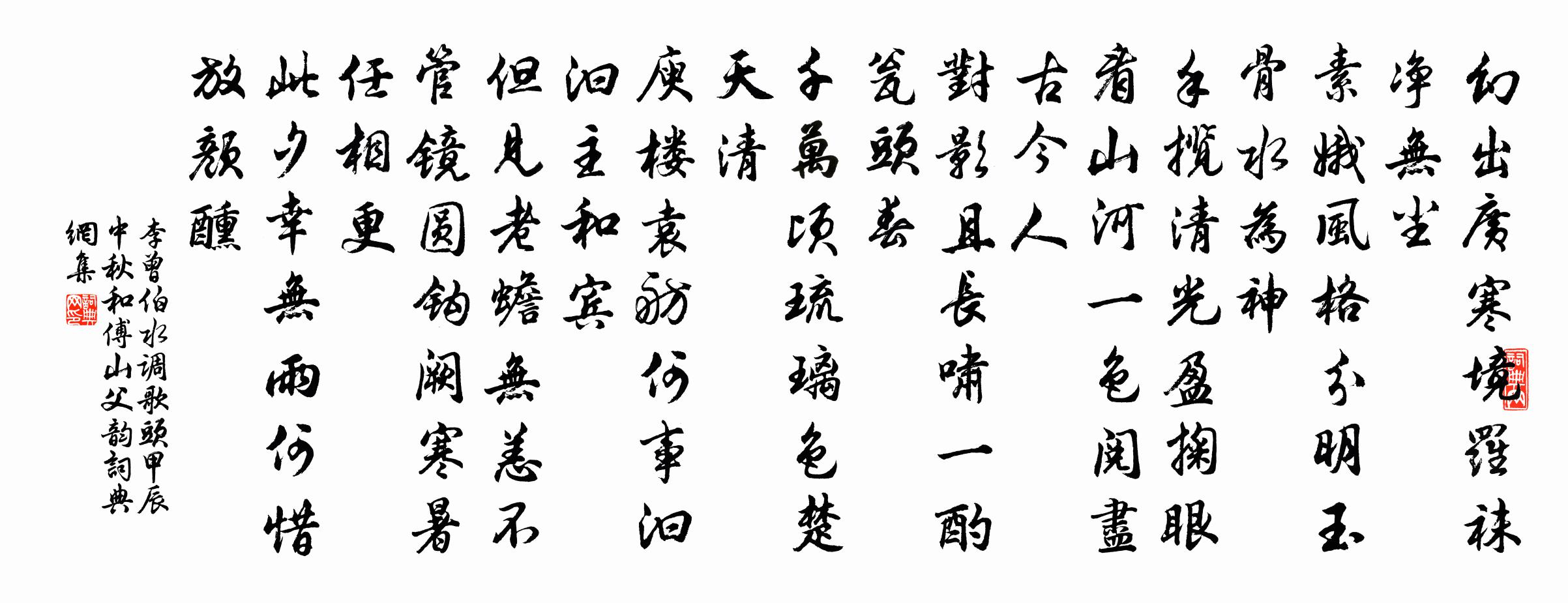 詩詞名句歷史字典書法欣賞書法字典國語詞典說文解字康熙字典古漢語字典標 題 作 者 詩 句 水調歌頭(甲辰中秋和傅山父韻)作者:李曾伯 朝代:宋代原文幻出廣寒境,羅襪淨無塵。素娥風格分明,玉骨水為神。手攬清光盈掬,眼看山河一色,閱盡古今人。對影且長嘯,一酌瓮頭春。千萬頃,琉璃色,楚天清。庾樓袁舫何事,汩汩主和賓。但見老蟾無恙,不管鏡圓鉤闕,寒暑任相更。此夕幸無雨,何惜放顏醺。詩詞問答問:《水調歌頭(甲辰中秋和傅山父韻)》的作者是誰?答:李曾伯問:該詩寫於哪個朝代?答:宋代問:該詩是什麼體裁?答:詞書法欣賞水調歌頭(甲辰中秋和傅山父韻)書法作品詩詞推薦萬杉院陳舜俞〔宋代〕銀鉤金榜佛家園,屐齒初來骨發寒。天上星辰留翰墨,人閒陵寢閟衣冠。虬龍擁護神如在,雲霧遮藏色未乾。四十贈餘乾袁明府曹松〔唐代〕一雨西城色,陶家心自清。山銜中郭分,雲卷下湖程。公署聞流木,人煙入廢城。難忘楚盡處,新有越吟生。瑞鶴仙(嘲博見樓)呂勝己〔宋代〕倚闌觀四遠。近有客登臨,故相磨難。山形欠舒展。小峰巒雲樹,晦明更變。江淮楚甸。又何曾、分明在眼。但臨韋譙公輓歌二首張說〔唐代〕五瑞分王國,雙珠映後家。文飛書上鳳,武結笥中蛇。出豫榮前馬,回鸞喪後車。袞衣將錫命,泉路有光華。國騁賡吳竹修雪詩二首陳著〔宋代〕寒勒銀河不放流,幻飛六出眩人眸。誰知青女老成手,自媚玄冥冬盡頭。積峻便如群玉府,遇□還作□毛球。西湖見諸姬學玉台體皇甫冉〔唐代〕艷唱召燕姬,清弦待盧女。由來道姓秦,誰不知家楚。傳杯見目成,結帶明心許。寧辭玉輦迎,自堪金屋貯。朝朝唐州東途作竇鞏〔唐代〕綠林兵起結愁雲,白羽飛書未解紛。天子欲開三面網,莫將弓箭射官軍。夜坐董嗣杲〔宋代〕秋清道院空,更籌受風掩。二更看斜河,濕卻萬星點。題福佑王廟王淮〔宋代〕關中失鹿人爭逐,一去鴻門不可尋。千古英雄死遺恨,封侯廟食更何心。去年五月十七廬山禱而雨嘗有詩今年五月十七方岳〔宋代〕浪漫東西不自期,此公猶有鬼神知。江閩易地誰為崇,晴雨在天皆及時。年熟且從犀首飲,宦情聊付虎頭痴。舉杯水邊偶題羅隱〔唐代〕野水無情去不回,水邊花好為誰開。只知事逐眼前去,不覺老從頭上來。窮似丘軻休嘆息,達如周召亦塵埃。思量題思婦陳杰〔宋代〕碧天無過雁,芳草靜遊人。深院綠雲曉,滿階紅雨春。釵鸞慷照影,簫鳳暗棲塵。鄰女焉知事,終朝學美矉。題田將軍宅姚合〔唐代〕焚香書院最風流,莎草緣牆綠蘚秋。近砌別穿澆藥井,臨街新起看山樓。棲禽戀竹明猶在,閒客觀花夜未休。好是紀送太傅相公歸闕范仲淹〔宋代〕縉紳誰敢望差肩,獨向昌期協半千。首會雲龍游少海,親扶日月上中天。碧油兩就元戎鎮,黃閣三提冢宰權。坐致長沙道中鄭剛中〔宋代〕微雨過雲春半濕,曉風留雪柳偏寒。一身扶病方為客,馬上喔詩強自寬。題棲鳳亭四首白玉蟾〔宋代〕竹也多年管風月,鳳兮幾夜宿雲煙。林間有客 * 去,竹化成龍鳳入天。和之美舟行雜詩八首水鴨司馬光〔宋代〕褵縰出短蒲,毰毸浴清水。物忌太鮮明,何妨染泥滓。洛中晴望於武陵〔唐代〕九陌盡風塵,囂囂晝復昏。古今人不斷,南北路長存。葉落上陽樹,草衰金谷園。亂鴉歸未已,殘日半前軒。【雙調】慶東原_次馬致遠先張可久〔元代〕次馬致遠先輩韻九篇九首燒丹灶,洗藥瓢,樂清閒幾個人知道。閒吹鳳簫,悶拈兔毫,焉用牛刀。他得志笑閒人,凌朝浮江旅思(一作韋承慶詩)馬周〔唐代〕太清上初日,春水送孤舟。山遠疑無樹,潮平似不流。岸花開且落,江鳥沒還浮。羈望傷千里,長歌遣四愁。名句推薦羅幕輕寒,燕子雙飛去。晏殊《蝶戀花·檻菊愁煙蘭泣露》 斟酌乎質文之間,而隱括乎雅俗之際,可與言通變矣。劉勰《文心雕龍·通變》 如今卻憶江南樂,當時年少春衫薄。韋莊《菩薩蠻·如今卻憶江南樂》 西北望長安,可憐無數山辛棄疾《菩薩蠻·書江西造口壁》 人之初,性本善。王應麟《三字經·全文》 搜句忌於顛倒,裁章貴於順序劉勰《文心雕龍·章句》 天下無事,不可廢武佚名《百戰奇略·第十卷·忘戰》 悵望千秋一灑淚,蕭條異代不同時。杜甫《詠懷古蹟五首·其二》 俯皇都之宏麗兮,瞰雲霞之浮動。曹植《銅雀台賦》 大成若缺,其用不弊。大盈若沖,其用不窮。老子《老子·德經·第四十五章》