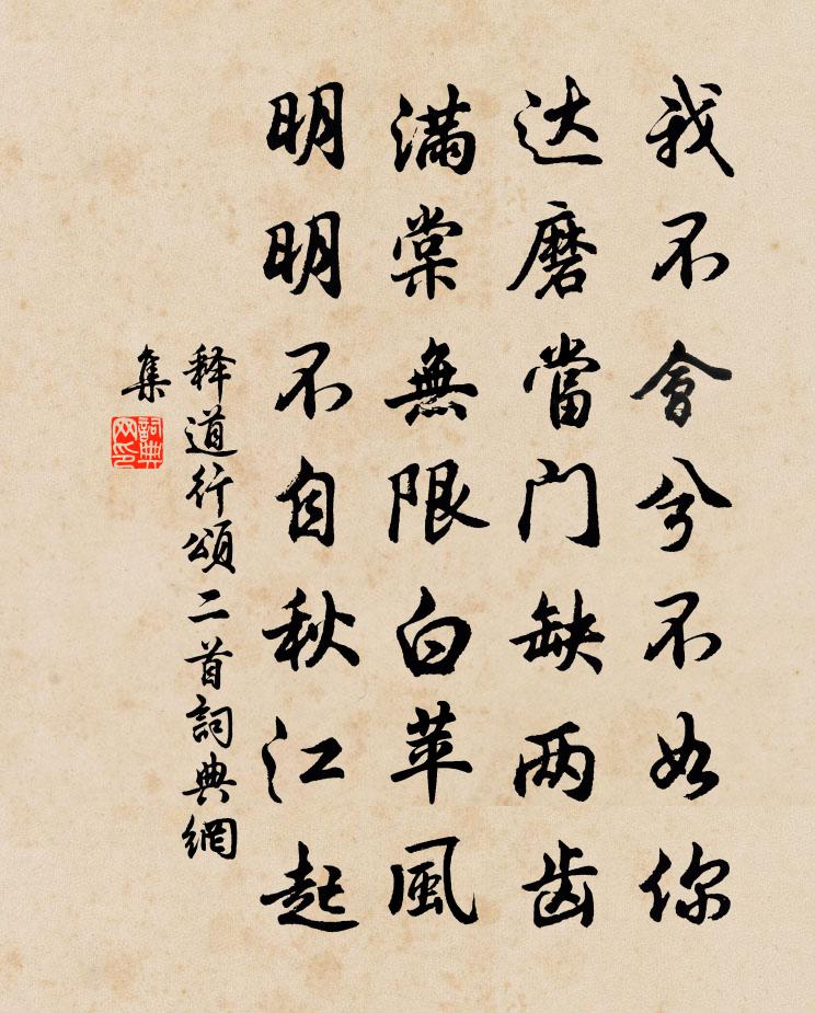 詩詞名句歷史字典書法欣賞書法字典國語詞典說文解字康熙字典古漢語字典標 題 作 者 詩 句 頌二首作者:釋道行 朝代:宋代頌二首原文我不會兮不如你,達磨當門缺兩齒。滿棠無限白苹風,明明不自秋江起。詩詞問答問:頌二首的作者是誰?答:釋道行問:頌二首寫於哪個朝代?答:宋代釋道行頌二首書法欣賞頌二首書法作品詩詞推薦和陶與殷晉安別蘇軾〔宋代〕孤生知永棄,末路嗟長勤。久安儋耳陋,日與雕題親。海國此奇士,官居我東鄰。卯酒無虛日,夜棋有達晨。小瓮杯泉徐集孫〔宋代〕一方石甃溜涓涓,扁以杯稱萬古傳。名利醉人醲似酒,誰甘恬澹酌清泉。登大半山李穎〔明代〕方仞雲峰護一山,九天風露透衣寒。固知仙境多靈跡,莫向枰棋著意看。敬宗睿武昭愍孝皇帝輓歌三首劉禹錫〔唐代〕寶曆方無限,仙期忽有涯。事親崇漢禮,傳聖法殷家。晚出芙蓉闕,春歸棠棣華。玉輪今日動,不是畫雲車。任賢菩薩蠻·滿宮明月梨花白溫庭筠〔唐代〕滿宮明月梨花白,故人萬里關山隔。金雁一雙飛,淚痕沾繡衣。小園芳草綠,家住越溪曲。楊柳色依依,燕歸君不用李參政韻並錄寄舟峰師四首曹勛〔宋代〕昔年壯氣激腸肝,錦帶吳鉤鄙隱岩。喜試輕裘裁白紵,笑追落日試重銜。愁隨草色人千里,誰附文期信一緘。會待奉酬臞菴李侍郎白玉蟾〔宋代〕全是山林居士風,不知位重更官穹。名書玉幾金甌內,心在 * 紙帳中。題湯柏紀程文劉克莊〔宋代〕詔書選後宮,眾女競媒致。拂鏡濃畫眉,臨風高綰髻。朝猶東鄰居,夕已金屋貴。彼姝絕代姿,綽約乘雲氣。箴史金谷園蘇拯〔唐代〕積金累作山,山高小於址。栽花比綠珠,花落還相似。徒有敵國富,不能買東市。徒有絕世容,不能樓上死。只此有所思(一作古有所思行)李白〔唐代〕我思仙人乃在碧海之東隅。海寒多天風,白波連山倒蓬壺。長鯨噴涌不可涉,撫心茫茫淚如珠。西來青鳥東飛去,宮詞王仲修〔宋代〕吾君聖學自通神,匪但書看逸少親。妙絕長江春色麗,一時同賜紫樞臣。十月十七日大椿堂小集胡從周季懷以予目疾皆周必大〔宋代〕畏疾甚畏威,目昏口止酒。爾來時一中,免使論薄厚。儀康業廢祀,釀具散莫糾。採藥山已焚,種秫時轉後。門稀題中團寺柱趙蕃〔宋代〕向來不識中團寺,一自移家得屢過。縱使山僧真厭客,淡然相對有維摩。西江月佚名〔宋代〕要識真鉛汞,都來只一根源。烹前火候妙中玄。不是知音難辨。採取莫差時日,仍分弦後弦前。玉爐一霎火燒天。風流子·東風吹碧草秦觀〔宋代〕東風吹碧草,年華換、行客老滄洲。見梅吐舊英,柳搖新綠,惱人春色,還上枝頭,寸心亂,北隨雲黯黯,東逐水荒徑釋文珦〔宋代〕幽徑任蓬蒿,衡門閉亦牢。駒寒宜在谷,鶴倦懶鳴皋。老樹根流髓,重岩石長膏。樵童更閒靜,聽我讀離騷。梨花陳允平〔宋代〕流鶯偷入未央宮,望斷昭陽信不通。寂寞雨聲寒食夜,一枝香淚泣東風。餘姚祗役奉簡鮑參軍嚴維〔唐代〕童年獻賦在皇州,方寸思量君與侯。萬事無成新白首,兩春虛擲對滄流。歌詩盛賦文星動,簫管新亭晦日游。知己舊遊一絕蘇籀〔宋代〕慨悵秦關舊儕侶,綾袍韘{左韋右占}火鐮囊。南來放馬遵舟楫,鱸鱖西風號本鄉。寄鄭谷郎中齊己〔唐代〕人間近遇風騷匠,鳥外曾逢心印師。除此二門無別妙,水邊松下獨尋思。名句推薦自昔佳人多薄命,對古來、一片傷心月。辛棄疾《賀新郎·用前韻送杜叔高》 青山相待,白雲相愛,夢不到紫羅袍共黃金帶宋方壺《山坡羊·道情》 不戚戚於貧賤,不汲汲於富貴。陶淵明《五柳先生傳》 身後有餘忘縮手,眼前無路想回頭。曹雪芹《紅樓夢·第二回》 即從巴峽穿巫峽,便下襄陽向洛陽。杜甫《聞官軍收河南河北》 白日登山望烽火,黃昏飲馬傍交河。李頎《古從軍行》 荊江日落陣雲低,橫戈躍馬今何時。納蘭性德《送蓀友》 應憐屐齒印蒼苔,小扣柴扉久不開。葉紹翁《遊園不值》 凡傷寒之病,多從風寒得之。始表中風寒,入里則不消矣。張仲景《傷寒論·傷寒例》 松排山面千重翠,月點波心一顆珠。白居易《春題湖上》