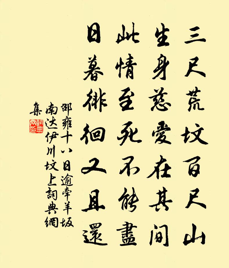 詩詞名句歷史字典書法欣賞書法字典國語詞典說文解字康熙字典古漢語字典標 題 作 者 詩 句 十八日逾牽羊坂南達伊川墳上作者:邵雍 朝代:宋代原文三尺荒墳百尺山,生身慈愛在其間。此情至死不能盡,日暮徘徊又且還。詩詞問答問:《十八日逾牽羊坂南達伊川墳上》的作者是誰?答:邵雍問:該詩寫於哪個朝代?答:宋代書法欣賞十八日逾牽羊坂南達伊川墳上書法作品詩詞推薦感皇恩魏了翁〔宋代〕三峽打頭風,吹回荊步。坎止流行謾隨遇。須臾風靜,重踏西來舊武。世間憂喜地,分明覷。喜事雖新,憂端依舊竹林傷田家易士達〔宋代〕陰陰沈沈雨霏霏,農夫把秧妻抱兒。前村後村歌相答,上畝下畝泥正肥。新谷登場腹不飽,新絲出盎身不絲。膏粱句諶祜〔宋代〕天開暝色雲千里,雨洗秋空月十分。詩一首周燾〔宋代〕東山蠟屣壞車輪,小草青知山外春。園柳鳴禽喚幽夢,惠連詩句更何人。句邵伯溫〔宋代〕自昔充城號奧區,蜀人喚作小成都。紈扇連文鳳〔宋代〕露冷飄零半幅紈,傷心不見女乘鸞。歌殘春院桃花暖,愁殺秋庭木葉寒。滿地飛塵何處避,舊時明月向誰看。應思嘲鷺方岳〔宋代〕曾有詩矜白鷺閒,一生詩眼乞山漫。朝來更覺忙於我,雪沍蒼溪不道寒。成性吟邵雍〔宋代〕成性存存,用志不分。又何患乎,不到古人。豆腐詩王老者〔宋代〕朝朝只與磨為親,推轉我邊無 * 。碾出一團真白玉,將歸回向未來人。泊吳江寄胡武平蔡襄〔宋代〕遙夜吳江瀕,露坐鬚成葆。天空不帶雲,野逈正收潦。徘徊波上月,灩漾浮光好。清風送炎歊,翻覺秋氣早。乃問逍遙詠宋太宗〔宋代〕五色雲銷黯,方知大道深。華池玄妙理,龍虎本同音。金鼎鉛中作,紅花洞裡尋。求真如得路,返少老山岑。次韻答陣夢錫十首陳造〔宋代〕續經發冢古今病,示容灼膚防瘡疣。決知蕭蘭異根葉,始議溟渤包眾流。雜詠五言八首劉克莊〔宋代〕有劍彈歡鋏,無金築隗台。孝王雖貴介,猶解客鄒枚。至揚州文天祥〔宋代〕吾戴吾頭向廣陵,仰天無告可憐生。爭如負命投東海,猶會乘風近玉京。次韻孔彥常舍人曝書秦觀〔宋代〕上帝圖書府,傳觀詔特容。嘉賓蒼佩玉,盛饌紫駝峰。散帙牙籤亂,開函錦襲重。君羹如可請,願備北堂供。寄鄭維忠葉雲叟諸友黃榦〔宋代〕村村簫鼓競龍舟,萸菊岩前倚晚秋。老懶焚香書一卷,淡煙疎竹月侵樓。牛山之木四趙友直〔宋代〕牛山之木,於彼空谷。悠悠我思,孰雲勿谷。送王昌齡李頎〔唐代〕漕水東去遠,送君多暮情。淹留野寺出,向背孤山明。前望數千里,中無蒲稗生。夕陽滿舟楫,但愛微波清。舉酒次韻楊廷秀待制二首周必大〔宋代〕十年不侍殿東頭,臨水登山隱者流。一眼瞳方無異相,三層勾曲有巍樓。幸殊王粲非吾土,何事龐公不入州。至後水火吟邵雍〔宋代〕水火得其御,交而成既濟。水火失其御,焚溺可立至。不止水與火,萬事盡如此。只知用水火,不知水火義。名句推薦無論作何等人,總不可有勢利氣王永彬《圍爐夜話·第三五則》 枯藤老樹昏鴉,小橋流水人家,古道西風瘦馬。馬致遠《天淨沙·秋思》 萬壑樹參天,千山響杜鵑。王維《送梓州李使君》 遠看山有色,近聽水無聲王維《畫》 狡兔死,走狗烹;飛鳥盡,良弓藏;敵國破,謀臣亡。司馬光《資治通鑑·漢紀三》 美女渭橋東,春還事蠶作。李白《陌上桑》 然而其持之有故,其言之成理。荀子《荀子·非十二子》 渭北春天樹,江東日暮雲。杜甫《春日憶李白》 政者正也。君為正,則百姓從政矣。戴聖《禮記·哀公問》 白頭宮女在,閒坐說玄宗。元稹《行宮》