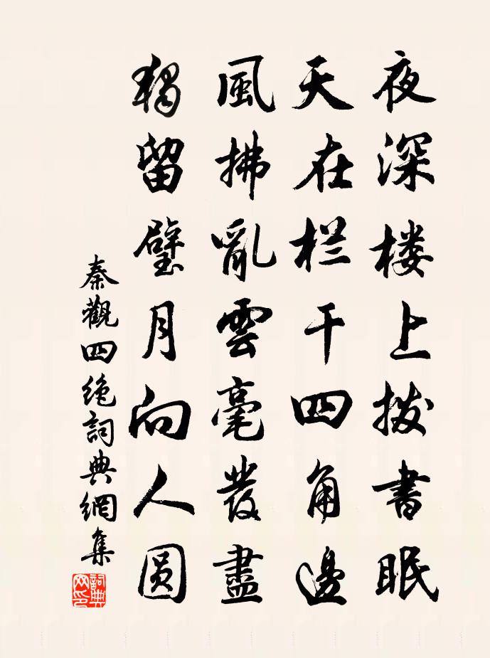 詩詞名句歷史字典書法欣賞書法字典國語詞典說文解字康熙字典古漢語字典標 題 作 者 詩 句 四絕作者:秦觀 朝代:宋代四絕原文夜深樓上撥書眠,天在欄乾四角邊。風拂亂雲毫髮盡,獨留璧月向人圓。詩詞問答問:四絕的作者是誰?答:秦觀問:四絕寫於哪個朝代?答:宋代問:秦觀的名句有哪些?答:秦觀名句大全秦觀四絕書法欣賞四絕書法作品詩詞推薦龍泓洞楊蟠〔宋代〕六月千里旱,偷泉心亦卑。不煩山老祝,神物久無思。送黃竑葉適〔宋代〕有客家住寶劍窟,將身自比夜明簾。見我立談盡肝膈,駭視世俗徒沾沾。千年豪傑供指使,笑撻胡虜如奴鉗。嗟予【仙呂】賞花時_風情春透天喬吉〔元代〕風情春透天台醉碧桃,月滿雲窗聽紫簫。鶯燕友鳳鸞交。幽期密約,不許外人瞧。【麼】打不覺頭毒如睡馬杓,粘旅泊翁卷〔宋代〕幾日溪篷下,低垂困水程。喜因山縣泊,略向岸汀行。聞笛生羈思,看松減宦情。遙知此夜月,必照故山明。積雨作寒范成大〔宋代〕壓屋雨雲晝暗,環城霖潦夏寒。西池半沒荷柄,南蕩平沉芡盤。乙巳三月十五日監察御史王東溪節宿戒方回萬方回〔宋代〕年年時節美春三,誰識湖山綠似藍。萬戶棟樑雙語燕,千村桑柘兩眠蠶。鼓鐘下竺寺連上,香火北高峰勝南。除卻端午帖子太上皇后閣周必大〔宋代〕暑衣初進滿宮床,霧縠雲綃五月涼。化洽周南無一事,尚吟絺綌葛覃章。寓寺八首張耒〔宋代〕平曉春雲失半山,蒙蒙小雨暗江乾。寺樓倚遍消殘醉,只有春愁伴薄寒。謝橘洲人寄橘齊己〔唐代〕洞庭栽種似瀟湘,綠繞人家帶夕陽。霜裛露蒸千樹熟,浪圍風撼一洲香。洪崖遣後名何遠,陸績懷來事更長。藏貯忝役湘州與宣城吏民別詩謝朓〔南北朝〕羽齡倦簪履。薄晚忝華奧。閒沃盡地區。山泉諧所好。幸遇昌化穆。惇俗罕驚暴。四時從偃息。三省無侵冒。下車挽柯東海劉克莊〔宋代〕不持寸鐵霸斯文,疇昔曾將膽許君。撰出騷詞奴宋玉,寫成帖字婢羊欣。喪無歸費人爭賻,詩有高名虜亦聞。昨覽韋蟾(一作寄懷韋蟾)李商隱〔唐代〕謝家離別正淒涼,少傅臨岐賭佩囊。卻憶短亭回首處,夜來煙雨滿池塘。曉過南宮聞太常清樂陸贄〔唐代〕南宮聞古樂,拂曙聽初驚。煙靄遙迷處,絲桐暗辨名。節隨新律改,聲帶緒風輕。合雅將移俗,同和自感情。遠音挽崇憲靖王詩虞儔〔宋代〕詔書催喚袞衣歸,富貴誰知已息機。北闕恩榮寧久戀,東山雅志肯相違。傷心水月人安在,回首湖山事亦非。他日汪漕使即梅圃作浮月亭追和古詩餘亦補和魏了翁〔宋代〕一元播群卉,其氣清以馥。詩人競稱許,胡然於梅獨。黃宮播雷鞀,玉管動葭轂。惟梅命於陽,清 * 朴蔌。正冬蜀城懷古劉希夷〔唐代〕蜀土繞水竹,吳天積風霜。窮覽通表里,氣色何蒼蒼。舊國有年代,青樓思艷妝。古人無歲月,白骨冥丘荒。寂歷題高縉之劍室二首陳造〔宋代〕皇家威德憺遐荒,何物樓蘭尚頡頏。想見詩人欹枕處,雲霄中夜有光芒。雲山杜甫〔唐代〕京洛雲山外,音書靜不來。神交作賦客,力盡望鄉台。衰疾江邊臥,親朋日暮回。白鷗元水宿,何事有餘哀。萬空歌悟空〔明代〕天也空,地也空,人生渺渺在其中。日也空,月也空,東升西落為誰功?金也空,銀也空,死後何曾在手中!妻也霜天曉角(詠梅)趙長卿〔宋代〕香來不歇。誰把南枝折。的礫疏花初破,都因是、夜來雪。清絕。十分絕。孤標難細說。獨立野塘清淺,誰作伴、名句推薦風暖有人能作伴,日長無事可思量。楊基《浣溪沙·上巳》 君子遺人以財,不若善言。佚名《孔子家語·六本》 布衣菜飯,可樂終身沈復《浮生六記·閨房記樂》 風起,雪飛炎海變清涼。蘇軾《定風波·南海歸贈王定國侍人寓娘》 六月禾未秀,官家已修蒼。聶夷中《田家》 勿貪意外之財,勿飲過量之酒。朱柏廬《朱子家訓·全文》 居後而望前,則為前;居前而望後,則為後。姚思廉《陳書·列傳·卷二十四》 山外青山樓外樓,西湖歌舞幾時休?林升《題臨安邸》 落盡梨花春又了。滿地殘陽,翠色和煙老。梅堯臣《蘇幕遮·草》 相望試登高,心隨雁飛滅。孟浩然《秋登蘭山寄張五》