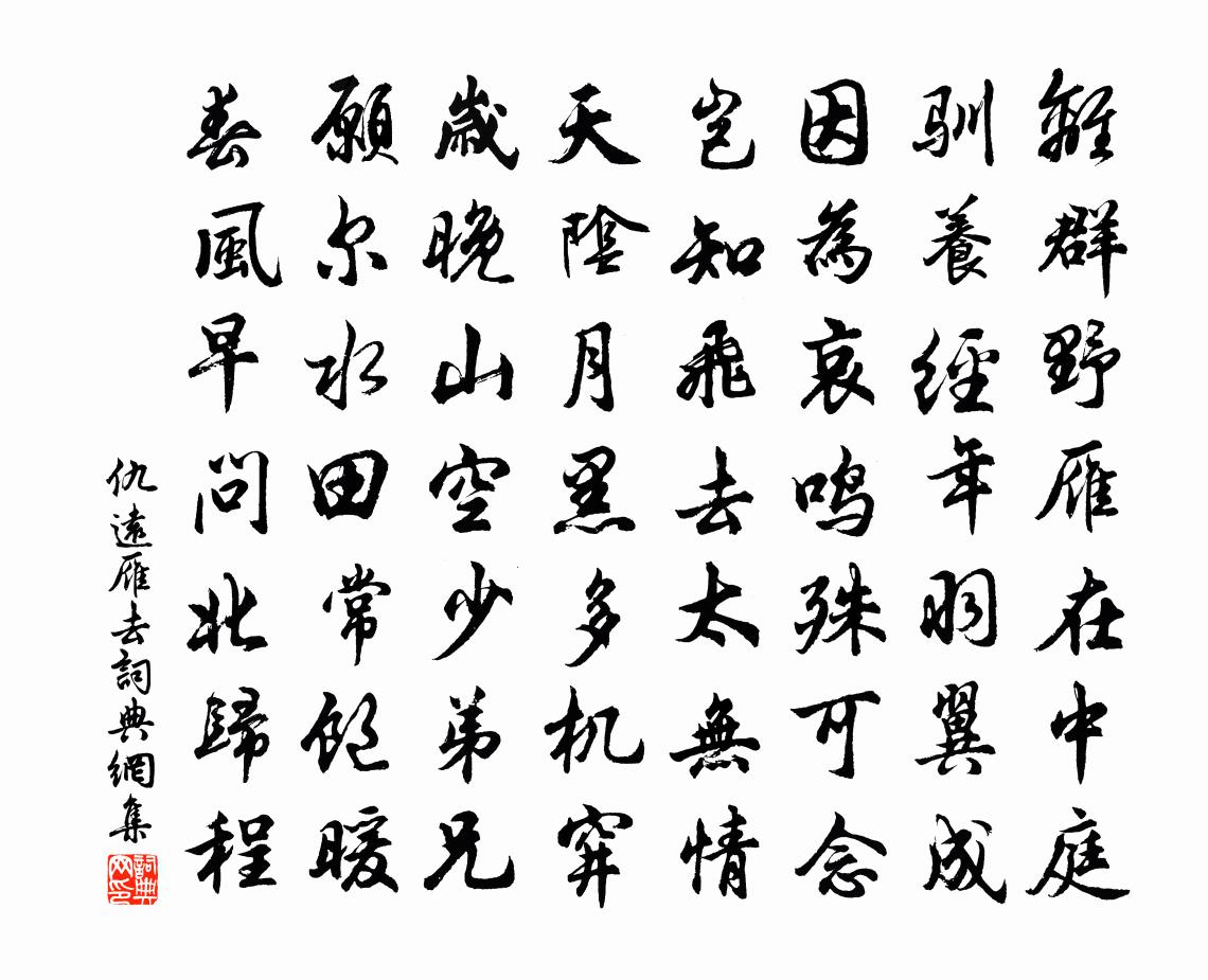 詩詞名句歷史字典書法欣賞書法字典國語詞典說文解字康熙字典古漢語字典標 題 作 者 詩 句 雁去作者:仇遠 朝代:宋代雁去原文離群野雁在中庭,馴養經年羽翼成。因為哀鳴殊可念,豈知飛去太無情。天陰月黑多機穽,歲晚山空少弟兄。願爾水田常飽暖,春風早問北歸程。詩詞問答問:雁去的作者是誰?答:仇遠問:雁去寫於哪個朝代?答:宋代仇遠雁去書法欣賞雁去書法作品詩詞推薦山中方岳〔宋代〕寂寂門無長者車,穿深逗密愜幽居。花能紅白錦相似,山自青蒼畫不如。鶴骨政應先狗馬,雛孫殊未辨龍豬。皇天懷高東溪二首陳景肅〔宋代〕諤諤東溪士, * 澗谷春。一別阻雲水,相思勞夢魂。五湖秋夜月,三島春空雲。璚標月夜見,玉唾雲閒聞。何當題畫竹扇寄友蒲壽宬〔宋代〕明月二千里,清風一萬竿。相思寫不得,寫出夢來看。將赴京留題山莊西壁蔡襄〔宋代〕禁林京尹荷恩光,三上螭頭乞郡章。貧薄奉親須仰祿,此心安敢系軒裳。初冬快晴陪宣卿叔夏遊石頭庵過三生藏窮深極胡寅〔宋代〕大明遺甃已荊生,列宿名橋但板橫。宅險跨色能幾日,空教狐兔飽經行。立秋日聞蟬楊萬里〔宋代〕老火薰人慾破頭,喚秋不到得人愁。夜來一雨將秋至,今晚蟬聲始報秋。陳遺至孝劉義慶〔南北朝〕陳遺至孝。母好食鐺底焦飯,遺作郡主簿,恆裝一囊,每煮食,輒貯收焦飯,歸以遺母。後值孫恩掠郡,郡守袁山讀玉局集喻良能〔宋代〕曉讀蘇仙集,披翻未覺勞。衙官視宋玉,奴僕命離騷。赤壁清風遠,黃樓逸興高。獨嗟生苦晚,不得侍揮毫。社日醉起趙蕃〔宋代〕醉狀初右春水船,夢成蝴蝶更翩翩。覺來已是情無奈,那更急風吹雨顛。懷元度四首王安石〔宋代〕秋水才深四五尺,扁舟斗轉疾於飛。可憐物色阻攜手,正是歸時君不歸。幽居即事陸游〔宋代〕日鑄歲幾何,苞苴遍權門。野人求其類,金墺實弟晜。超然高世韻,何獨驅睡昏。安得如吾宗,坐致顧渚園?贈翰林賈島〔唐代〕清重無過知內制,從前禮絕外庭人。看花在處多隨駕,召宴無時不及身。馬自賜來騎覺穩,詩緣見徹語長新。應憐予十年間兩坐斥罪雖擢髮莫數而詩為首謂之嘲陸游〔宋代〕扁舟又向鏡中行,小草清詩取次成。放逐尚非餘子比,清風明月入台評!南郊大禮慶成詩五首右賜赦宣德門蘇頌〔宋代〕帝陟圜丘,天降之祜。嘉與士民,均承福祚。還御端闈,躬布皇度。雞星驗占,鵠書臚句。慶浹天淵,恩霏雨露。須菩提贊釋智遇〔宋代〕持貝葉,倚瘦藜。解空未盡,說是說非。無端引惹憍屍。古井鄭獬〔宋代〕百尺青梧桐,下有寒泉井。分明古鏡中,照見梧桐影。朝汲水花清,暮汲水花冷。願持沆瀣杯,遠寄蓬山頂。琵琶洲汪應辰〔宋代〕塞外風煙能記否,天涯落日自心知。眼中景物參差是,只欠江州司馬詩。送徐殿院回鄉林霆龍〔宋代〕三十年來人委靡,如今勁節似秋橫。三條鯁亮為時重,一葉翩翾去國輕。莘老不還司諫職,廖公應顯 * 名。遐沖酬任疇協律夏中苦雨見寄姚合〔唐代〕銀漢波瀾溢,經旬雨未休。細聽宜隔牖,遠望憶高樓。風急飄還斷,雲低落更稠。走童驚掣電,飢鳥啄浮漚。絲網五十六字庸以告未知野夫者程珌〔宋代〕寧須山澤論高平,但要曾餐石決明。三世擊鐘敲石磬,十年學劍斮銅釘。倘知狐祖天邊去,肯向蠻奴腳底行。更許名句推薦山色遙連秦樹晚,砧聲近報漢宮秋。韓翃《同題仙遊觀》 梨花自寒食,進節只愁余。楊萬里《寒食上冢》 浮雲暮南征,可望不可攀。杜甫《前出塞九首》 盈盈一水間,脈脈不得語。佚名《迢迢牽牛星》 言以足志,文以足言。左丘明《左傳·襄公·襄公二十五年》 楚天千里清秋,水隨天去秋無際。辛棄疾《水龍吟·登建康賞心亭》 不誘於譽,不恐於誹。荀子《荀子·非十二子》 禮以行義,義以生利,利以平民,政之大節也。左丘明《左傳·成公·成公二年》 山上層層桃李花,雲間煙火是人家。劉禹錫《竹枝詞九首·其九》 庸德之行,庸言之謹;有所不足,不敢不勉子思《中庸·第十三章》