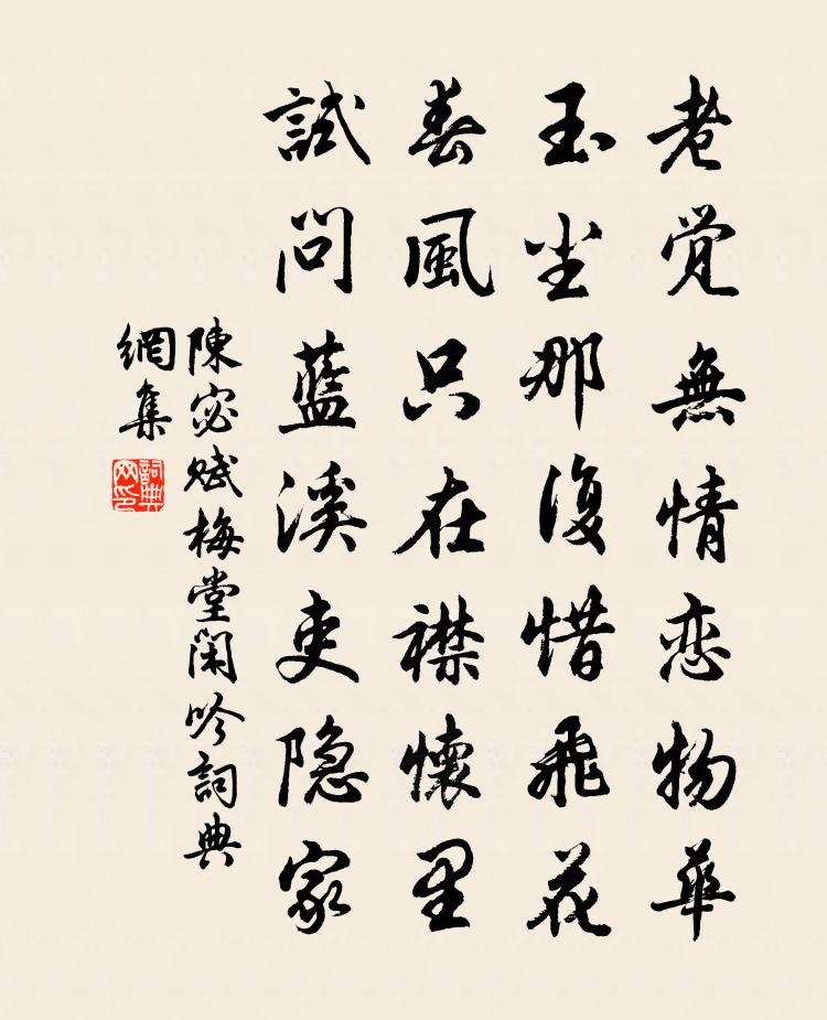 詩詞名句歷史字典書法欣賞書法字典國語詞典說文解字康熙字典古漢語字典標 題 作 者 詩 句 賦梅堂閒吟作者:陳宓 朝代:宋代賦梅堂閒吟原文老覺無情戀物華,玉塵那復惜飛花。春風只在襟懷裡,試問藍溪吏隱家。詩詞問答問:賦梅堂閒吟的作者是誰?答:陳宓問:賦梅堂閒吟寫於哪個朝代?答:宋代陳宓賦梅堂閒吟書法欣賞賦梅堂閒吟書法作品詩詞推薦風人體曹鄴〔唐代〕出門行一步,形影便相失。何況大堤上,驄馬如箭疾。夜夜如織婦,尋思待成匹。郎只不在家,在家亦如出。將金題龍溪橋王洋〔宋代〕放出清泉疊舊蹊,行人但渡不沾泥。與君暫濯紅塵足,留我長澆白玉畦。千古蜿蜒潛窟穴,他年頭角上雲梯。信知贈邵堯夫司馬光〔宋代〕家雖在城闕,蕭瑟似荒郊。遠去名利窟,自稱安樂巢。雲歸白石洞,鶴立碧松梢。得喪非吾事,何須更解嘲。連昌宮詞二首階陸龜蒙〔唐代〕草沒苔封疊翠斜,墜紅千葉擁殘霞。年年直為秋霖苦,滴陷青珉隱起花。故右散騎常侍舒國公褚公輓詞蘇頲〔唐代〕陽翟疏豐構,臨平演慶源。學筵尊授幾,儒服寵乘軒。審諭留中密,開陳與上言。徂暉一不借,空有賜東園。第一百五十九文天祥〔宋代〕人生無家別,親故傷老醜。剪紙招我魂,何時一樽酒。六言詩孔融〔兩漢〕郭李分爭為非。遷都長安思歸。瞻望關東可哀。夢想曹公歸來。景龍中嘲宰相歌佚名〔唐代〕禮賢不解開東閣,燮理惟能閉北門。洛城見賀自真飛升(一作登仙)陳陶〔唐代〕子晉鸞飛古洛川,金桃再熟賀郎仙。三清樂奏嵩丘下,五色雲屯御苑前。朱頂舞低迎絳節,青鬟歌對駐香輧。誰能和李明叔理定道中李師中〔宋代〕幽居日日數歸程,已寫華嚴兩帙經。門外初寒江氣白,嶺頭多雨曉痕青。曾逢飯顆潮山笠,應載鴟夷笑井瓶。客土南遊陳深〔宋代〕驅車登遠道,白日忽西流。宇宙驚新夢,山河感舊遊。雲迷江令宅,月澹庾公樓。已已如何奈,長歌去國愁。十六夜月色佳甚對酒效樂天體招酒伴賞月舒岳祥〔宋代〕八月十六夜,清涼明月天。新酒雖未熟,陳酒喜未乾。早稻有餘飯,輕衫未為寒。傍人見我醉,胸中故朗然。有詩酬和元九東川路詩十二首。山枇杷花二首白居易〔唐代〕萬重青嶂蜀門口,一樹紅花山頂頭。春盡憶家歸未得,低紅如解替君愁。葉如裙色碧綃淺,花似芙蓉紅粉輕。若使村舍雜書陸游〔宋代〕我本杞菊家,桑薴亦吾宗。種藝日成列,喜過萬戶封。今年夏雨足,不復憂螟蟲。歸耕殆有相,所願天輒從。題柱二首陳師道〔宋代〕桃李摧殘風雨春,天孫河鼓隔天津。主恩不與妍華盡,何限人間失意人。如夢令(五之三)秦觀〔宋代〕幽夢匆匆破後。妝粉亂痕沾袖。遙想酒醒來,無奈玉銷花瘦。回首。回首。繞岸夕陽疏柳。桃源憶故人朱敦儒〔宋代〕玉笙吹徹清商後。寂寞弓彎舞袖。巧畫遠山不就。只為眉長皺。靈犀望斷星難透。立到淒涼時候。今夜月明如晝。看梅呈同游東閣清源劉植〔宋代〕此對何年向此栽,孤根低倚佛樓台。不嫌幽壑逢春晚,獨在空庭立雪來。一段精神肪玉潤,數松掩映翠屏開。知心雨中花令程垓〔宋代〕舊日愛花心未了。緊消得、花時一笑。幾日春寒,連宵雨悶,不道幽歡少。記得去年深院悄。□梁畔,一枝香裊。寄題用之太丞真意閣李石〔宋代〕真醫曾活水中龍,三卷奇書玉笈中。酒熟定應登傑閣,與龍對酌海螺紅。名句推薦菡萏香連十頃陂,小姑貪戲採蓮遲。皇甫松《採蓮子·菡萏香蓮十頃陂》 惟上惟己,去表求實,奸者自見矣。來俊臣《羅織經·察奸卷第八》 漢家君臣歡宴終,高議雲台論戰功。王維《少年行四首》 湛湛長江去,冥冥細雨來。杜甫《梅雨》 霧冷笙簫,風輕環佩,玉鎖無人掣朱敦儒《念奴嬌·插天翠柳》 馬上離魂衣上淚,各自個、供憔悴程垓《酷相思·月掛霜林寒欲墜》 養心須淡泊,凡足以累吾心者勿為也。王永彬《圍爐夜話·第九八則》 記得綠羅裙,處處憐芳草。賀鑄《綠羅裙·東風柳陌長》 曉雞驚樹雪,寒鶩守冰池。李商隱《幽居冬暮》 不知近水花先發,疑是經冬雪未銷。張謂《早梅》