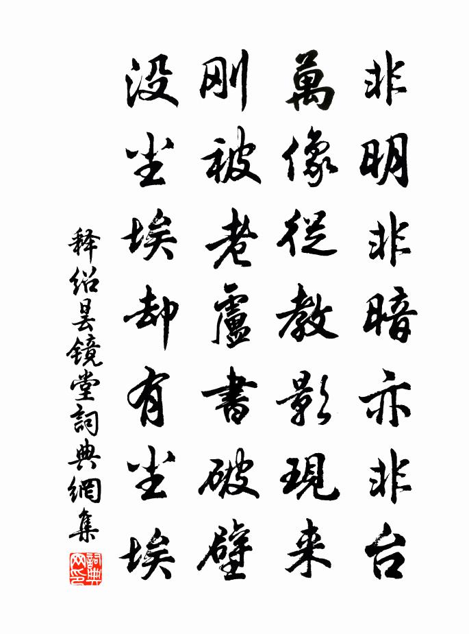 詩詞名句歷史字典書法欣賞書法字典國語詞典說文解字康熙字典古漢語字典標 題 作 者 詩 句 鏡堂作者:釋紹曇 朝代:宋代鏡堂原文非明非暗亦非台,萬像從教影現來。剛被老盧書破壁,沒塵埃卻有塵埃。詩詞問答問:鏡堂的作者是誰?答:釋紹曇問:鏡堂寫於哪個朝代?答:宋代釋紹曇鏡堂書法欣賞鏡堂書法作品詩詞推薦文淵閣賜茶乾隆〔清代〕層閣文華殿後峨,昨春慶宴覺無何。具瞻楠架四庫貯,且喜芸編三面羅。十載春秋成不日,極天淵海尚餘波。待鈔鄒公輓辭二首楊時〔宋代〕一伏青蒲上,三年瘴海濱。泉甘不出戶,客醉豈無神。報國心長在,知恩志未伸。追懷垂絕語,空有淚盈巾。奉和江沖陶居二十韻汪炎昶〔宋代〕青冥風露淒,玉笙浮縹緲。石蘚蝕秋花,羅月淡清曉。留別王掾元胥賀鑄〔宋代〕之子貫東牟,青衫試宦遊。顛非小賀比,爽自阿戎流。未即芸香拜,俄先瓜戍秋。孤蓬別夜思,霜月滿滄洲。葛覃解張載〔宋代〕葛蔓青長谷鳥遷,女工興記憶歸安。不將貴盛驕門族,容使親心得盡歡。菩薩蠻梅窗〔宋代〕折來初步東溪月。月溪東步初來折。香處是瑤芳。芳瑤是處香。蘚花浮暈淺。淺暈浮花蘚。清對一枝瓶。瓶枝一對水調歌頭(和尹存吾)劉辰翁〔宋代〕造物反乎覆,白首困耆英。吟風賞月石上,一笑再河清。一百八盤道路,二十四橋歌舞,身世夢堪驚。獨酌未能醉贈剡縣過頊秘丞陳襄〔宋代〕賢哉過縣尹,德政是吾師。萬事無鋒穎,一惦惟孝慈。家貧因客冗,發白為民飢。誰刻前山石,令人去後思。王十五前閣會杜甫〔唐代〕楚岸收新雨,春台引細風。情人來石上,鮮膾出江中。鄰舍煩書札,肩輿強老翁。病身虛俊味,何幸飫兒童。壺中天/念奴嬌佚名〔宋代〕古來稀有,只聞道、是個人生七十。還遇小春梅蕊綻,對景裝排綺席。雲帔拖霞,朱顏暈酒,瑞氣明南極。瑤池歡久不作詩詩思甚涸春物日盛漫興三章用常德棗趙蕃〔宋代〕庭行看萌芽,檐立聽呼應。在物且云然,於我可不競。青衫戀五斗,白髮間三徑。是豈人之為,絕知吾有命。浣溪沙(新安驛席上留別)范成大〔宋代〕送盡殘春更出遊。風前蹤跡似沙鷗。淺斟低唱小淹留。月見西樓清夜醉,雨添南浦綠波愁。有人無計戀行舟。次韻子云春日雜興五首韓元吉〔宋代〕瓦盆傾酒未全貧,歲歲田家肯負春。不恨酒醒花落去,花開酒盡最愁人。窗前種小梅樹今年未著花但春來綠陰亂眼每過鄭剛中〔宋代〕水邊移得竹邊栽,樹小條新花未開。綠葉參差須細看,尚疑低處有青梅。和段相公登武擔寺西台姚向〔唐代〕開閣錦城中,餘閒訪梵宮。九層連晝景,萬象寫秋空。天半將身到,江長與海通。提攜出塵土,曾是穆清風。滿庭芳 贈宋何二先生馬鈺〔元代〕舍家學道,爭奈心魔。心中憎愛尤多。心意如猿如馬,如走如梭。心生塵情競起,縱頑心、不肯消磨。心念惡罪,寄碭山主簿朱九齡王禹偁〔宋代〕閒思蓬島會群仙,二百同年最少年。利市襴衫拋白紵,風流名紙寫紅牋。歌樓夜宴停銀燭,柳巷春泥污錦韉。今日太常引(壽南澗)辛棄疾〔宋代〕君王著意履聲間。便令押、紫宸班。今代又尊韓。道吏部、文章泰山。一杯千歲,問公何事,早伴赤松閒。功業後張仲通追賦洛中雜題和嘗歷覽者六章其一伊川梅堯臣〔宋代〕山斷瀉伊流,灘聲朝暮急。東渡馬將登,西堤人已立。日看東西舟,爭途如不及。誰見捕魚郎,寒蓑雨中濕。禪人並化主寫真求贊釋正覺〔宋代〕性不疏通,機不捷敏。頹慵陋見聞,急快失容忍。一默清秋兮芙蓉華開,萬態浩春兮葛藤蔓引。名句推薦靈台無計逃神矢,風雨如磐暗故園。魯迅《自題小像》 一念慈祥,可以醞釀兩間和氣;寸心潔白,可以昭垂百代清芬。洪應明《菜根譚·概論》 長江如虹貫,蟠繞其下。宋濂《閱江樓記》 上善若水,水善利萬物而不爭。老子《老子·道經·第八章》 把吳鉤看了,欄桿拍遍,無人會,登臨意。辛棄疾《水龍吟·登建康賞心亭》 林外鳴鳩春雨歇,屋頭初日杏花繁。歐陽修《田家》 乃知兵者是兇器,聖人不得已而用之。李白《戰城南》 君子必在己者,不必在人者也。呂不韋《呂氏春秋·覽·孝行覽》 情知已被山遮斷,頻倚闌乾不自由。辛棄疾《鷓鴣天·晚日寒鴉一片愁》 北風夜卷赤亭口,一夜天山雪更厚。岑參《天山雪歌送蕭治歸京》