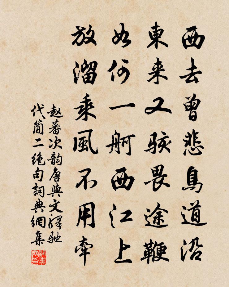 詩詞名句歷史字典書法欣賞書法字典國語詞典說文解字康熙字典古漢語字典標 題 作 者 詩 句 次韻唐與文驛馳代簡二絕句作者:趙蕃 朝代:宋代次韻唐與文驛馳代簡二絕句原文西去曾悲鳥道沿,東來又駭畏途鞭。如何一舸西江上,放溜乘風不用牽。詩詞問答問:次韻唐與文驛馳代簡二絕句的作者是誰?答:趙蕃問:次韻唐與文驛馳代簡二絕句寫於哪個朝代?答:宋代趙蕃次韻唐與文驛馳代簡二絕句書法欣賞次韻唐與文驛馳代簡二絕句書法作品詩詞推薦少婦詞竇鞏〔唐代〕坐惜年光變,遼陽信未通。燕迷新畫屋,春識舊花叢。夢繞天山外,愁翻錦字中。昨來誰是伴,鸚鵡在簾櫳。官滿寓濟川館得葉嘉仲和朱宰梅花詩次韻雲作戴栩〔宋代〕經年一會面,危坐擁寒灰。絕勝對餘子,一朝來百回。巫山一段雲 勸世尹志平〔元代〕道顯清虛妙,釋明智慧深。仲尼仁義古通今。三聖一般心。不認忘名默悟。只解分門別戶。一朝合眼見前程。悔恨送撫州通判袁世弼寺丞梅堯臣〔宋代〕帆疏疏,纖綠蒲,二十四幅輕江湖。高秋逆水上天去,朝過瓜步暮濡須。長風沙頊問鯉魚,大孤山側鳴寒烏。魚腹客夢徐集孫〔宋代〕人生總總汩浮榮,勘破令人厭宦情。竹屋無時功結夢,秫田何日遂歸耕。雨侵藥灶莓苔長,秋透書台筆硯清。漸老正月三日宿范氏莊四首楊萬里〔宋代〕野踐得幽詠,不吐聊自味。健步忽傳呼,雲有遠書至。開緘秪暄涼,此外無一事。奇懷坐消泯,追省寧復記。方驩已亥雜詩 175龔自珍〔清代〕瓊林何不積緡錢,物自低昂人自變。我與徐公籌到此,朱提山竭異無權。蝶戀花 予將南邁度間贈合曲張氏夫婦盧摯〔元代〕前度歸田菘下住。野店荒村,撫掌琵琶女。忽聽梨園新樂府,離鸞別鶴清如許。歌管聲殘弦解語。玉*春泉,心手宋著作寄鳳茶梅堯臣〔宋代〕春雷未出地,南土物尚凍。呼噪助發生,萌穎強抽{上艹下共}。團為蒼玉璧,隱起雙飛鳳。獨應近臣頒,豈得常曉入東谷文同〔宋代〕振纓效王官,釋耒去鄉縣。十年始還此,景物覺盡變。東谷素所愛,乍到若創見。煙雲引晨策,數里入蔥蒨。明霞採蓮曲王鎡〔宋代〕羅裙濺濕鬢雲偏,搖落香風滿畫船。忽憶夜來憔悴夢,怨央正在藕花邊。題鄒惟中西樓劉永之〔元代〕西樓遠對鼎山斜,野客來尋駕鹿車。竹嶼暝煙浮翠黛,石田秋雨潤銀沙。清尊未酌心先醉,往事重論鬢欲華。肯借詠德上太原李尚書歐陽詹〔唐代〕那以公方郭細侯,并州非復舊并州。九重帝宅司丹地,十萬兵樞擁碧油。鏘玉半為趨閤吏,腰金皆是走庭流。王褒行香子趙元〔元代〕潦倒無聞。坐慣家貧。眼昏花,心口猶存。人皆笑我,我盡教人。┾醉吟風,閒釣月,困眠雲。邂逅交親。語款情頌古一○一首釋子淳〔宋代〕等閒應問豈安排,一句全提隱顕該。薄霧依依籠古徑。孤峰終不露崔嵬。次琬妹月夕思親之什追錄利登〔宋代〕緩作行程早作歸,倚門親語苦相思。白頭親老今多病,不似當初別汝時。減字木蘭花韋驤〔宋代〕帝城春媚。綠柳參天花照地。共樂昇平。處處樓台歌板聲。香輪玉鐙。馳驟芳郊爭選勝。妙舞輕謳。擾亂春風卒未熙寧望祭岳鎮海瀆十七首佚名〔宋代〕盛德惟木,勾芒御神。沂貸淮海,厥功在民。爰熙壇坎,主對庶神。於以歆格,靈貽具臻。小童薛陽陶吹觱栗歌(和浙西李大夫作)白居易〔唐代〕剪削乾蘆插寒竹,九孔漏聲五音足。近來吹者誰得名?關璀老死李袞生。袞今又老誰其嗣?薛氏樂童年十二。指點送監丞弟元亨參江陵閫柴望〔宋代〕北虜才聞郭子儀,上流決有退師期。諸公但釃臨江酒,老子只圍別墅棋。露布夜傳誅韃靼,蠟丸便遞破符離。書生名句推薦風回小院庭蕪綠,柳眼春相續。李煜《虞美人·風回小院庭蕪綠》 處世不必邀功,無過便是功;與人不要感德,無怨便是德。洪應明《菜根譚·概論》 春風不解禁楊花,濛濛亂撲行人面。晏殊《踏莎行·小徑紅稀》 不畏浮雲遮望眼,自緣身在最高層。王安石《登飛來峰》 不惜千金買寶刀,貂裘換酒也堪豪。秋瑾《對酒·不惜千金買寶刀》 雁聲遠過瀟湘去,十二樓中月自明。溫庭筠《瑤瑟怨》 知過必改,得能莫忘。周興嗣《千字文·全文》 手如柔荑,膚如凝脂佚名《碩人》 騮馬新跨白玉鞍,戰罷沙場月色寒。王昌齡《出塞二首》 教化之行,興於學校。脫脫《金史·列傳·卷三十七》