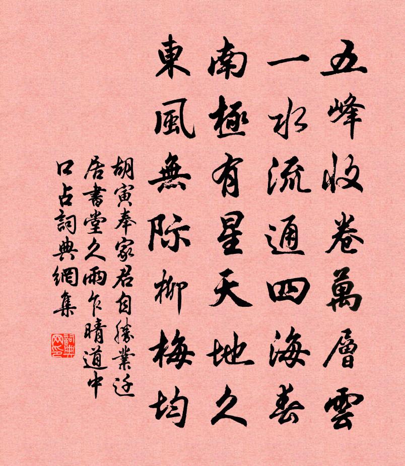 詩詞名句歷史字典書法欣賞書法字典國語詞典說文解字康熙字典古漢語字典標 題 作 者 詩 句 奉家君自勝業遷居書堂久雨乍晴道中口占作者:胡寅 朝代:宋代原文五峰收卷萬層雲,一水流通四海春。南極有星天地久,東風無際柳梅均。詩詞問答問:《奉家君自勝業遷居書堂久雨乍晴道中口占》的作者是誰?答:胡寅問:該詩寫於哪個朝代?答:宋代書法欣賞奉家君自勝業遷居書堂久雨乍晴道中口占書法作品詩詞推薦答子勉三首蘇軾〔宋代〕歐倩腰支柳一渦,小梅催拍大梅歌。舞余片片梨花落,爭奈當塗風物何。送入為閩宰司馬光〔宋代〕萬里東甌外,溪山秀出群。鄉人皆嗜學,太守復工文。正用茲良化,居無牒訴紛。誰雲遠京國,佳政日相聞。桂湖五首曾國藩〔清代〕點綴須人力,招尋信妙緣。使君殊不俗,把酒竟茫然。萋兮吟劉禹錫〔唐代〕天涯浮雲生,爭蔽日月光。窮巷秋風起,先摧蘭蕙芳。萬貨列旗亭,恣心註明璫。名高毀所集,言巧智難防。勿謂懷希晉此山二友釋行海〔宋代〕長思石色草堂前,更有梅花曲水邊。昨夜珊瑚枝上月,照人何事不團圓。和方叔載留別吳芾〔宋代〕臨別殷勤贈我詩,一披何喜得如之。怪來筆下能高妙,元是胸中自崛奇。長悵頃時才一面,方欣今歲殿雙眉。明年閣學袁侍郎以朝鯉豢龍兩圖見寄索和豢龍魏了翁〔宋代〕乾坤包萬有,納納百囊罟。人位乎兩間,利與害為御。一氣貫四時,五風偕十雨。神龍以為畜,擾御不予侮。河有讀杜集張耒〔宋代〕風雅不復興,後來誰可數。陵遲數百歲,天地實生甫。假之虹與霓,照耀蟠肺腑。奪其富貴樂,激使事言語。遂令十報恩 勉門人馬鈺〔元代〕道人活計不相侵。各自衣餐各自尋。莫為閒言閒鬥氣,休爭俗事俗縈心。搜玄絕慮龍隨虎,索隱記機水養金。清淨歸來陳必復〔宋代〕小笠輕蓑臥短蓬,曉歌楚曲和漁翁。片帆自識歸來路,借得清江一釣風。留別子肅趙蕃〔宋代〕欲雪不雪雲雨愁,將行未行心口謀。問胡不去良有由,故人伏枕關我憂。自心初識十年游,不作世人新白頭。抱關祖傳禪人求贊釋宗杲〔宋代〕藞苴全似川僧,蕭灑渾如浙客。偏向情未生時,拈出報慈一隔。尊性不定,莫可窺測。見小時嫌蟭螟眼太寬。見大書情寄詩友李中〔唐代〕默默誰知我,裴回野水邊。詩情長若舊,吾事更無先。芳草人稀地,殘陽雁過天。靜思吟友外,此意復誰憐。鄭櫻桃歌李頎〔唐代〕石季龍,僭天祿,擅雄豪,美人姓鄭名櫻桃。櫻桃美顏香且澤,娥娥侍寢專宮掖。後庭卷衣三萬人,翠眉清鏡不得送懷玉之越謁秋房使君胡仲弓〔宋代〕紛紛人少強,有客面如鐵。前日方游吳,今日又走越。一身天地間,行役勞歲月。問子去何為,豈是事乾謁。往訪藻侄比課五言詩,已有意趣,老懷甚喜,因吟陳師道〔宋代〕舊歲連新歲,涼床又暖床。山川屏里畫,時刻篆中香。畏壘安吾土,支離飽太倉。若教身再健,鶴背入維揚。挽周希舜二首吳芾〔宋代〕傾蓋如前日,分攜忽累年。我方來舊治,公已辟新阡。宿草荒三徑,寒雲慘一川。善人無復見,回首已茫然。雲莊耕者李呂〔宋代〕莘野樂堯舜,谷口豈其鄉。自是不可掩,區區非近名。曉寒二首楊萬里〔宋代〕春光喚入百花叢,寒力平歁兩鬢蓬。吹亂眾紅還復整,海棠卻不怕春風。人家看花王建〔唐代〕年少狂疏逐君馬,去來憔悴到京華。恨無閒地栽仙藥,長傍人家看好花。名句推薦洛陽城東西,長作經時別。范雲《別詩》 青鳥不傳雲外信,丁香空結雨中愁。李璟《攤破浣溪沙·手卷真珠上玉鉤》 道人庭宇靜,苔色連深竹。柳宗元《晨詣超師院讀禪經》 台榭空濛煙柳暗,白鳥銜魚欲舞。納蘭性德《摸魚兒·午日雨眺》 山上層層桃李花,雲間煙火是人家。劉禹錫《竹枝詞九首·其九》 把酒祝東風,且共從容。歐陽修《浪淘沙·把酒祝東風》 思親堂上茱初插,憶妹窗前句乍裁。秋瑾《九日感賦》 細讀離騷還痛飲,飽看修竹何妨肉。辛棄疾《滿江紅·山居即事》 晨起開門雪滿山,雪晴雲淡日光寒。鄭燮《山中雪後》 知者樂水,仁者樂山。孔子弟子《論語·雍也篇》