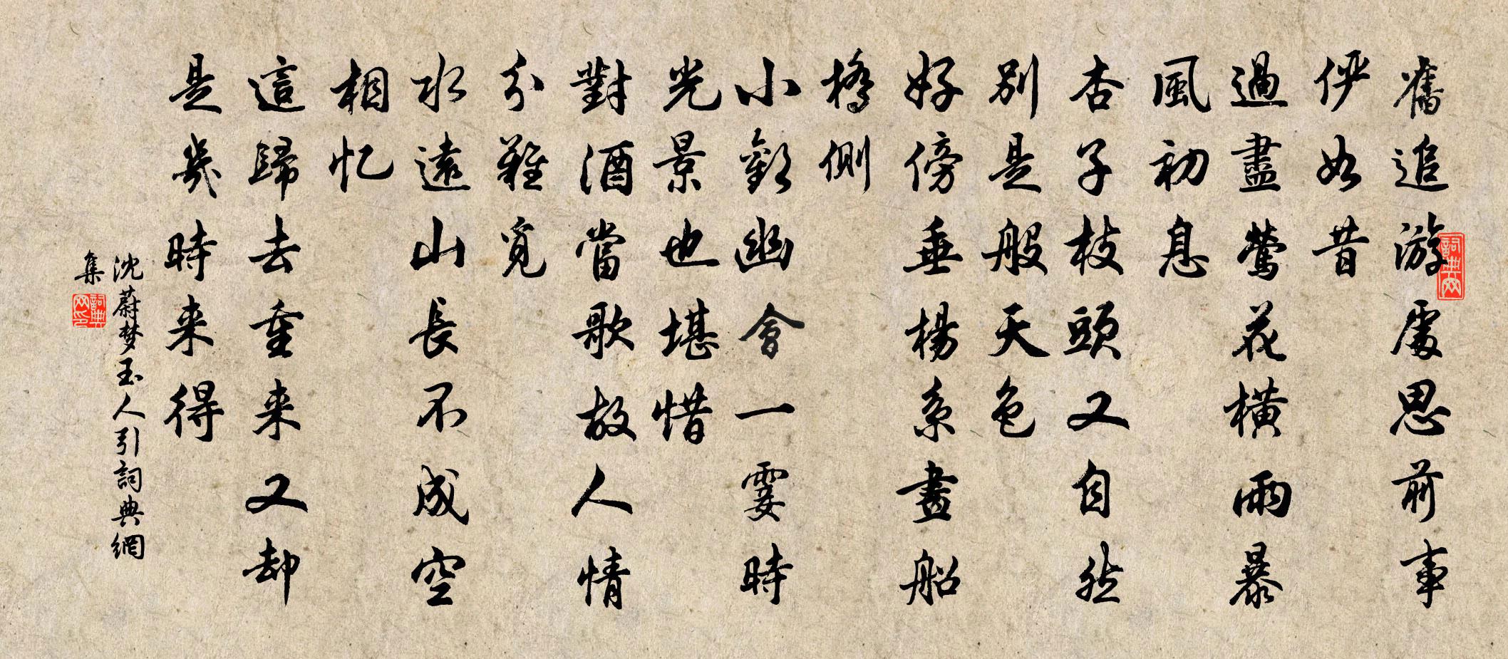 詩詞名句歷史字典書法欣賞書法字典國語詞典說文解字康熙字典古漢語字典標 題 作 者 詩 句 夢玉人引作者:沈蔚 朝代:宋代夢玉人引原文舊追游處,思前事、儼如昔。過盡鶯花,橫雨暴風初息。杏子枝頭,又自然、別是般天色。好傍垂楊,系畫船橋側。小歡幽會,一霎時、光景也堪惜。對酒當歌,故人情分難覓。水遠山長,不成空相憶。這歸去重來,又卻是、幾時來得。詩詞問答問:夢玉人引的作者是誰?答:沈蔚問:夢玉人引寫於哪個朝代?答:宋代問:夢玉人引是什麼體裁?答:詞沈蔚夢玉人引書法欣賞夢玉人引書法作品詩詞推薦僧房避暑嚴維〔唐代〕支公好閒寂,庭宇愛林篁。幽曠無煩暑,恬和不可量。蕙風清水殿,荷氣雜天香。明月談空坐,怡然道術忘。浣溪沙歐陽修〔宋代〕燈燼垂花月似霜。薄簾映月兩交光。酒醺紅粉自生香。雙手舞余拖翠袖,一聲歌已釂金觴。休回嬌眼斷人腸。秋日郊居陸游〔宋代〕車盪比鄰例饋魚,流涎對此四腮鱸。北窗雨過涼如水,消得先生一醉無?題胡氏南園精舍黎廷瑞〔宋代〕平泉竹石墮荒蕪,金谷池台莽廢墟。今古茫茫竟誰屋,乾坤吶吶有吾廬。溪山圍座醉留客,燈火隔林聞讀書。此樂秋夜吳錫疇〔宋代〕寂寂虛堂風露涼,邊聲驚聽雁南翔。短筇夢涉秋三逕,長笛思乘月一航。老眼添昏如濁鏡,吟懷多感類寒螿。久知寄何立可提刑劉克莊〔宋代〕故人握節守齊安,聞說邊頭事愈難。赤手募丁修險隘,白頭擐甲御風寒。半腰城甫包圍畢,一把兵皆點摘殘。收得奉和聖制夏日游石淙山張易之〔唐代〕六龍驤首曉駸駸,七聖陪軒集潁陰。千丈松蘿交翠幕,一丘山水當鳴琴。青鳥白雲王母使,垂藤斷葛野人心。山中謝蔡十八丈相示詩卷李覯〔宋代〕昔年多幸枉高軒,示我新詩累百篇。使君即時還趙璧,夢魂今尚憶鈞天。據鞍馬援誰雲老,陋巷顏回始是賢。桂樹閒中口占數絕觀書困甚鄭清之〔宋代〕眼欲觀書身欲眠,斜拖黃捲曲肱邊。不須身眼爭然否,試待醒來問孝先。黃樓陳師道〔宋代〕樓以風流勝,情緣貴賤移。屏亡老畢篆,市發大蘇碑。更覺江山好,難忘父老思。只應千載後,覽古勝當時。即事陸游〔宋代〕雲起山容改,湖生浦面寬。寒鴉先雁到,烏桕後楓丹。年邁狐裝帽,時新豆搗團。非關嗜溫飽,更事耐悲歡。南山白雲陳著〔宋代〕一片白雲飛入山,須臾又出在人閒。我歸十年不復出,說道雲閒我更閒。夜思方回〔宋代〕夜氣侵寒薄寢衣,回頭六十二年非。直能欹枕思時透,始覺挑燈得處微。百{共下加蟲}漸侵床畔語,一螢忽入帳後溪二首華岳〔宋代〕蓬窗夜雨短長夢,啼鳥喚人新舊愁。萬里論文一樽酒,醉和明月一扁舟。神靜師院韋應物〔唐代〕青苔幽巷遍,新林露氣微。經聲在深竹,高齋獨掩扉。憩樹愛嵐嶺,聽禽悅朝暉。方耽靜中趣,自與塵事違。皆山夜起趙文〔宋代〕上田下田水嘵嘵,南嶺北嶺蟲啁啁。如此月明誰管領,可憐滿壁海棠梢。雜詠一百首甘羅劉克莊〔宋代〕函谷非無士,登庸乳臭兒。空令園綺輩,頭白不逢時。次韻四叔父寄賀二叔父少監入館並見寄詩晁補之〔宋代〕琅邪太守魯儒英,典校還高劉更生。已似諸荀並才子,復如群竇占詩名。尚吟河水憐孤侄,應與鄉人痛伯兄。老鶴松江曲王令〔宋代〕松江深處 * 尺,去眼百里長風波。吾山井泉廢不汲,一泓不知深幾何。君家自無千尺綆,那知江深不如井。林下書懷寄建州李頻員外曹松〔唐代〕一從諸事懶,海上跡宜沉。吾道不當路,鄙人甘入林。雲垂方覓鶴,月濕始收琴。水石南州好,誰陪刻骨吟。名句推薦殷勤昨夜三更雨,又得浮生一日涼。蘇軾《鷓鴣天·林斷山明竹隱牆》 別浦今朝暗,羅帷午夜愁李賀《七夕》 黃昏獨倚朱闌。西南新月眉彎。馮延巳《清平樂·雨晴煙晚》 修己而不責人左丘明《左傳·閔公·閔公二年》 冰,水為之,而寒於水。荀子《勸學》 少年辛苦終身事,莫向光陰惰寸功。杜荀鶴《題弟侄書堂》 凡有血氣,皆有爭心左丘明《左傳·昭公·昭公十年》 夜寒不近流蘇,只憐他、後庭梅瘦。毛滂《上林春令·十一月三十日見雪》 湘江兩岸花木深,美人不見愁人心。盧仝《有所思》 人生一世,草長一春。佚名《增廣賢文·上集》