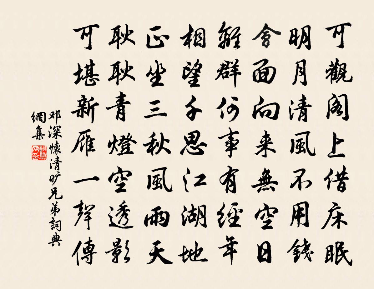 詩詞名句歷史字典書法欣賞書法字典國語詞典說文解字康熙字典古漢語字典標 題 作 者 詩 句 懷清曠兄弟作者:鄧深 朝代:宋代懷清曠兄弟原文可觀閣上借床眠,明月清風不用錢。會面向來無空日,離群何事有經年。相望千思江湖地,正坐三秋風雨天。耿耿青燈空透影,可堪新雁一聲傳。詩詞問答問:懷清曠兄弟的作者是誰?答:鄧深問:懷清曠兄弟寫於哪個朝代?答:宋代鄧深懷清曠兄弟書法欣賞懷清曠兄弟書法作品詩詞推薦濯纓亭趙處澹〔宋代〕兩派清溪合,回波到此間。危峰衡古石,幽洞隔塵寰。雲影高低樹,嵐光遠近山。先賢遺蹟在,盍挽舊風還。西山桐十詠桐徑陳翥〔唐代〕時人羨桃李,下自成蹊徑。而我愛梧桐,亦以成乎性。中平端隊道,還往非遼夐。直入無欹斜,橫延亦徑挺。月夕和芙蓉和尚四句偈頌死蛇驚出草釋慧暉〔宋代〕金鞭遙指玉堂寒,驚起將軍夜出關。三尺鏌鋣清四海,攙槍一掃絕痴頑。頌古三十八首釋慧方〔宋代〕生邪不道,死邪不道,一片清風鬧浩浩。一時漏泄道吾機,反著襴衫倒頂帽。滿江紅(重九與張舍人)韓玉〔宋代〕正欲登臨,何處好、登臨眺望。君約我、今朝攜酒,古台同上。風靜秋郊渾似洗,碧空淡覆玻璃盎。夕照外、渺渺攬鏡曾豐〔宋代〕直上沖天髯欲虯,斜飛控地鬢還彪。目中已決行藏策,贏得從今不倚樓。寄樞密富丈李彌遜〔宋代〕誤入眾香國,山深人境移。松筠秋色老,樓殿午雲低。東閣傳書密,西郊去路遲。須煩造化手,為展菊花期。送選兄歸天台曹勛〔宋代〕一笠彌天亦大奇,選公訪我索新詩。赤城歸去應相憶,十里松風月上時。失調名黃庭堅〔宋代〕舊家楊柳依依綠,長鎖春來庭院。點絳唇(月夜獨坐賞岩桂)姚述堯〔宋代〕夜桂飄香,西風淅淅寒窗悄。素娥相照。倍覺秋光好。花本無情,剛被詩情惱。知音少。為花歌笑。醉向花前倒。思四明所居與桃紅渡相對晁說之〔宋代〕今朝旅恨到何處,軒窗直對桃花渡。桃花渡上風吹雨,道人芒屩誰來去。月山諸峰喻良能〔宋代〕平生固寡好,嗜石如奇章。家無千金產,舁致窮澗岡。壽星來金華,衣冠何昂藏。屈肘據膝坐,風雨鬚眉蒼。松石晚秋遊興釋文珦〔宋代〕余英山中楓葉赤,龜溪溪上蘋花白。野翁杖屨往來頻,為愛溪山好色。白叟虬髯眼深碧,邂逅相歡坐苔石。語終長彭繡使平叛卒後除經略小詩陳利害戴復古〔宋代〕廣東經略使,今古幾人賢。陛下用一士,民間有二天。清風排瘴雨,廉德照貪泉。龍節生光彩,鸞車奏凱旋。津禪人出化盞橐乞頌釋正覺〔宋代〕喫茶去語落諸方,聚首商量柄把長。相席是渠能打令,同塵輸爾解和光。舌頭狤獠明無骨,鼻孔累垂暗有香。盞橐禪人並化主寫真求贊釋正覺〔宋代〕無心之心,妙超古今。無相之相,不存情量。葉落木而秋開,月度山而潮上。柳絮之風隨,葵華之日向。金國賀會慶節使人到闕集英殿宴致語口號崔敦詩〔宋代〕盛節簪紳宴玉京,紅雲深護赭袍明。寶花合座天香滿,仙羽分陳御斝行。原隰有光交信睦,廟堂無事樂和平。歡心送喻鳧校書歸毗陵姚合〔唐代〕主人庭葉黑,詩稿更誰書。闕下科名出,鄉中賦籍除。山春煙樹眾,江遠晚帆疏。吾亦家吳者,無因到弊廬。菩薩蠻毛滂〔宋代〕溪山不盡知多少。遙峰秀疊寒波渺。攜酒上高台。與君開壯懷。枉做悲秋賦。醉後悲何處。白髮幾黃花。官裘付酒次韻答舒教授觀余所藏墨蘇軾〔宋代〕異時長笑王會稽,野鶩膻腥污刀幾。暮年卻得庾安西,自厭家雞題六紙。二子風流冠當代,顧與兒童爭慍喜。秦王名句推薦燕子欲歸時節,高樓昨夜西風。晏殊《破陣子·燕子欲歸時節》 悲霜雪之俱下兮,聽潮水之相擊。屈原《九章》 家貧思良妻,國亂思良相。司馬光《資治通鑑·周紀·周紀一》 步轉迴廊,半落梅花婉娩香。蘇軾《減字木蘭花·春月》 歡宴良宵好月,佳人修竹清風。吳文英《風入松·麓翁園堂宴客》 成事不說,遂事不諫,既往不咎。孔子弟子《論語·八佾篇》 相思一夜窗前夢,奈個人、水隔天遮。王沂孫《高陽台·和周草窗寄越中諸友韻》 換我心,為你心,始知相憶深。顧夐《訴衷情·永夜拋人何處去》 相思處、青年如夢,乘鸞仙闕。文天祥《滿江紅·和王夫人滿江紅韻以庶幾後山妾薄命之意》 花明柳暗繞天愁,上盡重城更上樓。李商隱《夕陽樓》