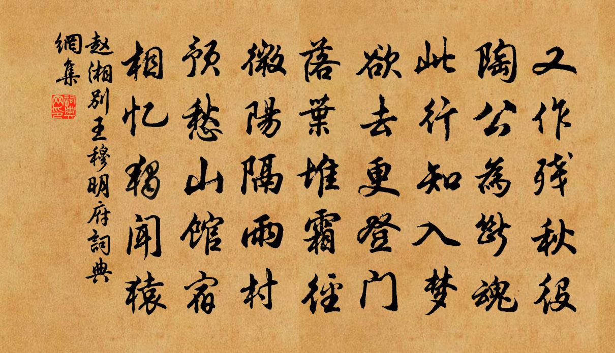 詩詞名句歷史字典書法欣賞書法字典國語詞典說文解字康熙字典古漢語字典標 題 作 者 詩 句 別王穆明府作者:趙湘 朝代:唐代別王穆明府原文又作殘秋役,陶公為斷魂。此行知入夢,欲去更登門。落葉堆霜徑,微陽隔雨村。預愁山館宿,相憶獨聞猿。詩詞問答問:別王穆明府的作者是誰?答:趙湘問:別王穆明府寫於哪個朝代?答:唐代趙湘別王穆明府書法欣賞別王穆明府書法作品詩詞推薦春夕宋祁〔宋代〕捲幔星河近,嚴城鐘漏遲。飛蟲集暗牖,棲鵲忌明枝。弱柳兼風困,高花戰露危。迴腸正無賴,仍此臥遙帷。史氏南軒梅堯臣〔宋代〕庭中碧石盎,上結三重山。飛光入酒杯,舞翠生髻鬟。竹林眠黃麞,莎徑欠白鷳。主人無倦情,窗戶不須關。春陌二首韋莊〔唐代〕滿街芳草卓香車,仙子門前白日斜。腸斷東風各回首,一枝春雪凍梅花。嫩煙輕染柳絲黃,句引花枝笑憑牆。馬上和堯夫先生安樂窩中好打乖吟王拱辰〔宋代〕安樂窩中名隱君,腹藏經笥富多聞。一廛水竹為生計,三徑琴觴混世紛。婉畫舊嘗辭幕府,少微今已應星文。了心詠杜若詩沈約〔南北朝〕生在窮絕地。豈與世相親。不顧逢採擷。本欲芳幽人。南歌子趙希蓬〔宋代〕玉立亭亭樹,水澌小小池。園林遍地幻珍奇。戰罷奇鱗無數、滿天飛。雲凍風威慘,天低月色微。紅綃暖帳淺斟時謁金門·楊花落李清臣〔宋代〕前遍,潤一橫字,已續二十五字寫之雲楊花落。燕子橫穿朱閣。常恨春醪如水薄。閒愁無處著。綠野帶江山絡角。贈粉鼻陸游〔宋代〕連夕狸奴磔鼠頻,怒髯噀血護殘囷。問渠何似朱門裡,日飽魚餐睡錦茵?過褐山磯值風梅堯臣〔宋代〕山口風偏急,磯頭水似煎。喧聲殊倦聽,逆上正難牽。暗石誰愁礙,長途未擬前。江心看白浪,捲起大於船。次見泌韻陳著〔宋代〕門外風塵付一吁,何妨稼圃學樊須。由由本自人難浼,皎皎奚憂我易污。仙岩行白玉蟾〔宋代〕醉攜七尺霜前行,雲錦山前灣幾曲。溪頭秋雨添寒綠,蛟龍冷浸一壺玉。蓼花錦岸紅欲流,稻田高下鋪棋局。碧岩春夜劉兼〔唐代〕薄薄春雲籠皓月,杏花滿地堆香雪。醉垂羅袂倚朱欄,小數玉仙歌未闋。李子權屢求所居江月亭浴沂齋詩老病未能作坐周必大〔宋代〕姚皇去後幾菲菲,湘水依然從二妃。雙淚一時紅作鬣,連枝千載綠為衣。檻前斑竹應同伴,波面文鴛欲共飛。吟遍曇花亭供茶戲作二首韓元吉〔宋代〕問訊高真此住家,伊蒲未辦且煎茶。故應一笑來迎我,五百瓶中總是花。春日(一作齊梁體)溫庭筠〔唐代〕柳岸杏花稀,梅梁乳燕飛。美人鸞鏡笑,嘶馬雁門歸。楚宮雲影薄,台城心賞違。從來千里恨,邊色滿戎衣。僧舍小泊葉茵〔宋代〕屏息小胡床,心魔已受降。香留煙出戶,雲過雨來窗。自許參禪觀,誰能折慢幢。山童求說偈,竹景落寒江。送張大師白玉蟾〔宋代〕自從汝離武夷來,險阻艱難歷幾回。江左旅中連值雨,春深路上滑成苔。烏啼花片落流水,風慘猿聲嘯古台。舉眼小孤廟李石〔宋代〕喚作孤姑恐未訛,寄名櫟社不爭多。但云龍女來行水,免使牛郎暗渡河。定風波蘇軾〔宋代〕閒臥藤床觀社柳。再次韻陳造〔宋代〕平日四方念,見謂石作腸。即今還家夢,絆驥首屢驤。不作垂橐嘆,藏書頗青箱。此燈可無傳,兒孫共翁長。名句推薦留連光景惜朱顏,黃昏獨倚闌。李煜《阮郎歸·呈鄭王十二弟》 宮粉雕痕,仙雲墮影,無人野水荒灣。吳文英《高陽台·落梅》 春夢醒來么?對春帆細雨,獨自吟喔。譚嗣同《望海潮·自題小影》 十有五而志於學,三十而立,四十而不惑,五十而知天命,六十而耳順,七十而從心所欲,不逾矩。孔子弟子《論語·為政篇》 君子以見善則遷,有過則改。佚名《易傳·象傳下·益》 天外鳳凰誰得髓?無人解合續弦膠。杜牧《讀韓杜集》 鴛鴦俱是白頭時,江南渭北三千里。賀鑄《惜余春·急雨收春》 犯刑若履虎,不畏落爪牙。李白《秦女休行》 綠衣監使守宮門,一閉上陽多少春。白居易《上陽白髮人》 水至清則無魚,人太急則無智。佚名《增廣賢文·上集》