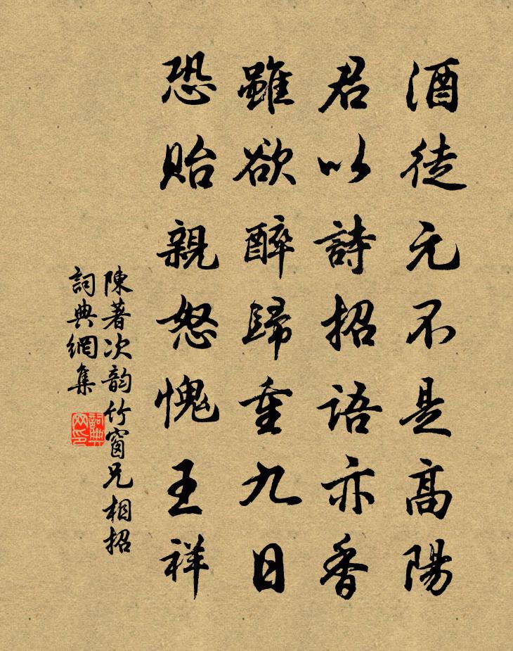 詩詞名句歷史字典書法欣賞書法字典國語詞典說文解字康熙字典古漢語字典標 題 作 者 詩 句 次韻竹窗兄相招作者:陳著 朝代:宋代次韻竹窗兄相招原文酒徒元不是高陽,君以詩招語亦香。雖欲醉歸重九日,恐貽親怒愧王祥。詩詞問答問:次韻竹窗兄相招的作者是誰?答:陳著問:次韻竹窗兄相招寫於哪個朝代?答:宋代陳著次韻竹窗兄相招書法欣賞次韻竹窗兄相招書法作品詩詞推薦三十年吟邵雍〔宋代〕三十年間更一世,其間堪笑復堪愁。天生天殺何嘗盡,人是人非殊未休。善偶鴛鴦頭早白,能啼杜宇血先流。須知留題熙春亭張登〔唐代〕熙春亭建為民安,要識熙熙本不難。一日但能先克復,百年雖久亦勝殘。滿城和氣薰天地,終歲長春忘暑寒。斯道依韻和杜相公謝蔡君謨寄茶梅堯臣〔宋代〕天子歲嘗龍焙茶,茶官催摘雨前牙。聞香已入中都府,團品爭傳太傅家。小石冷泉留早味,紫泥新品泛春華。吳中呂宣徽輓歌二首司馬光〔宋代〕奕世台衡貴,盈門拔冕榮。遐方流惠化,殊俗讋威聲。宥密資忠力,安平寄老成。遽騎箕尾去,何以慰蒼生。寄員外黃君釋重顯〔宋代〕碧岫層層列杳冥,漣漪環繞賁寒青。韜藏未識古君子,空仰嘉聲過洞庭。禪人寫真求贊釋正覺〔宋代〕不以律拘,不以禪縛。說法口窄,默游步闊。草木陽春來,池塘明月落,何妨處處相安著。元夕雨李揆〔宋代〕山縣逢元夕,東風雨濺燈。漁篝臨遠浦,鬼火附寒藤。酒市可羅雀,官僚皆曲肱。狂歌吾老矣,猶記舊時能。西山戲題武昌王居士並引蘇軾〔宋代〕予往在武昌,西山九曲亭上有題一句云:玄鴻橫號黃槲峴。九曲亭即吳王峴山,一山皆槲葉,其旁即元結陂湖也,隔簾聽(林鐘商)柳永〔宋代〕咫尺鳳衾鴛帳,欲去無因到。蝦須窣地重門悄。認繡履頻移,洞房杳杳。強語笑。逞如簧、再三輕巧。梳妝早。琵蔡州孔武仲〔宋代〕亭下湖光凝不流,銀燈玉斝綴綢繆。主人今是真黃霸,民譽仍推郭細侯。倦尋芳(郭頤堂寒食無家之感,為賦)陳紀〔宋代〕滿簪霜雪,一帽塵埃,消幾寒食。手拈梨花,還是年時岑寂。簌簌落紅春似夢,萋萋柔綠愁如織。怪東君、太匆匆立秋後作陸游〔宋代〕宋玉悲鞦韆載後,詩人例有早秋詩。老夫自笑心如石,三日秋風漫不知。九月初十日值宿玉堂七絕劉克莊〔宋代〕制書揮就進明光,天筆批還墨尚香。芥本偶然無貼改,非關臣億怕商量。菩薩蠻張元乾〔宋代〕微雲紅襯餘霞綺。明星碧浸銀河水。猗枕畫檐風。愁生草際蛩。雁行離塞晚。不道衡陽遠。歸恨隔重山。樓高莫憑衰病陸游〔宋代〕衰病不浪出,閉門煙雨中。葦花添絮暖,葑火試爐紅。仕宦螘窠夢,功名馬耳風。山翁但更事,人看作神通。族叔祖彥通所居,宛在水中央。名之曰:「小楊萬里〔宋代〕儂愛南溪不減公,南溪親公卻疏儂。為儂只作一兩曲,為公繞盡雲邊屋。屋後有竹前有花,斷橋才整已半斜。客來頌古釋道顏〔宋代〕江西一喝動乾坤,大用全機是滅門。三日耳聾風過樹,累他黃檗喪兒孫。江南曲張耒〔宋代〕平湖碧玉煙波闊,芰荷風起秋香發。採蓮女兒紅粉新,舟中笑語隔煙聞。高系紅裙袖雙卷,不惜浮萍沾皓腕。爭先滿庭芳侯善淵〔元代〕萬物之中,為人最貴,記憶體一點精微。至靈至聖,日用有誰知。隱顯存亡順化,方圓應、曲直投機。從伊變,行居柳絮楊萬里〔宋代〕寒勒花遲卻速殘,暖將絮過忽吹還。雪翻霽日光風急,球袞迴廊曲榭閒。萬里雲天皆去處,群飛蹤跡恣中間。道渠名句推薦我欲穿花尋路,直入白雲深處,浩氣展虹霓。黃庭堅《水調歌頭·遊覽》 燕簾鶯戶,雲窗霧閣,酒醒啼鴉。張炎《朝中措·清明時節》 天涯地角有窮時,只有相思無盡處。晏殊《玉樓春·春恨》 天下者非一人之天下,唯有道者處之。姜子牙《六韜·武韜·順啟》 一葉度春風,芳芳自相接。蕭衍《芳樹》 三思而後行。孔子弟子《論語·公冶長篇》 脫衣換得商山酒,笑把離騷獨自傾。王禹偁《清明日獨酌》 乃幽武置大窖中,絕不飲食。天雨雪。班固《蘇武傳(節選)》 不畏浮雲遮望眼,自緣身在最高層。王安石《登飛來峰》 下馬飲君酒,問君何所之?王維《送別》