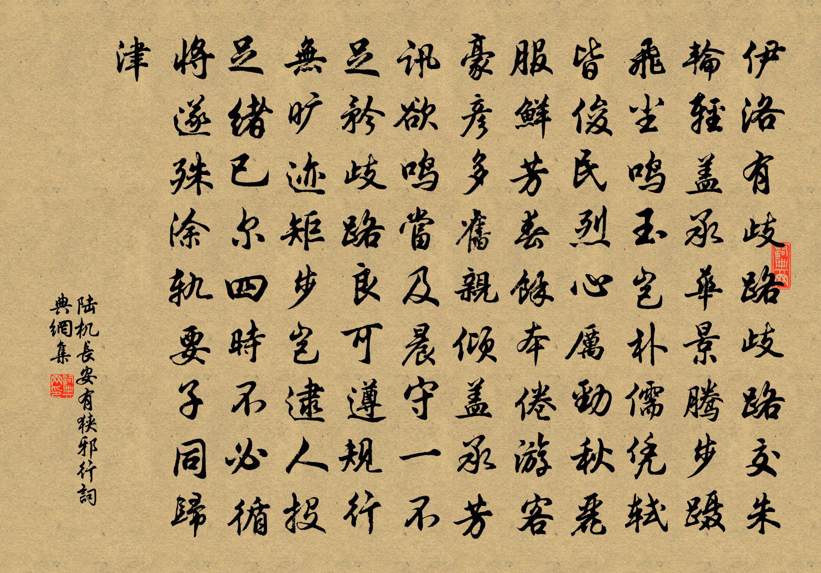 詩詞名句歷史字典書法欣賞書法字典國語詞典說文解字康熙字典古漢語字典標 題 作 者 詩 句 長安有狹邪行作者:陸機 朝代:魏晉長安有狹邪行原文伊洛有歧路。歧路交朱輪。輕蓋承華景。騰步躡飛塵。鳴玉豈朴儒。憑軾皆俊民。烈心厲勁秋。麗服鮮芳春。余本倦遊客。豪彥多舊親。傾蓋承芳訊。欲鳴當及晨。守一不足矜。歧路良可遵。規行無曠跡。矩步豈逮人。投足緒已爾。四時不必循。將遂殊塗軌。要子同歸津。詩詞問答問:長安有狹邪行的作者是誰?答:陸機問:長安有狹邪行寫於哪個朝代?答:魏晉問:長安有狹邪行是什麼體裁?答:樂府陸機長安有狹邪行書法欣賞長安有狹邪行書法作品詩詞推薦送友人之辰州覲省樂雷發〔宋代〕跕鳶東畔瘴雲低,山徑如梯去馬遲。正則自吟皇樹頌,廣微惟誦白華詩。春風采藥桃花國,落日尋碑薏苡祠。覓得挽方躬明運使孫應時〔宋代〕經濟書生意,功名世路難。三言能有虎,一簣不成山。春雨淮田沃,秋風楚塞單。空餘公認頃,往事杳誰攀。借榻趙處澹〔宋代〕簾卷薰風透骨香,月移花影上迴廊。客游不作安居計,漫借高齋一榻涼。秋雨嘆三首杜甫〔唐代〕雨中百草秋爛死,階下決明顏色鮮。著葉滿枝翠羽蓋,開花無數黃金錢。涼風蕭蕭吹汝急,恐汝後時難獨立。堂上聽蜀僧濬彈琴 / 聽蜀僧浚彈琴李白〔唐代〕蜀僧抱綠綺,西下峨眉峰。為我一揮手,如聽萬壑松。客心洗流水,餘響入霜鍾。不覺碧山暮,秋雲暗幾重。悼亡毛直方〔宋代〕從事龜山亦偶然,寧知長別恨終天。當時去就商量錯,不似牛衣十八年。定風波(夜賞海棠)王質〔宋代〕曲曲闌乾曲曲池。萬紅繚繞錦相圍。花到黃昏思欲睡。休睡。眼前都是好相知。銀燭轉添花轉好,人在,花深深處行役縣西喜雨寄任公漸大夫黃庭堅〔宋代〕行役勞人望縣齋,心如枯井喜塵埃。青燈簾外蕭蕭雨,破夢山根殷殷雷。新麥欲連天際好,濃雲猶傍日邊來。田歌新秋對月寄樂天劉禹錫〔唐代〕月露發光彩,此時方見秋。夜涼金氣應,天靜火星流。蛩響偏依井,螢飛直過樓。相知盡白首,清景復追游。次韻邢季允梅花蘇泂〔宋代〕懷想西湖一樹冰,有誰人似此花清。何當共泛波微綠,更得同看月正盈。送田(一作沈)光鄭谷〔唐代〕九陌低迷誰問我,五湖流浪可悲君。著書笑破蘇司業,賦詠思齊鄭廣文。理棹好攜三百首,阻風須飲幾千分。耒陽閒居秋日書事文同〔宋代〕秋雨晚蕭蕭,端居閒寂寥。雀飢爭配穗,蟬病落寒條。雲過茶煙沒,風歸硯水搖。惟當{言左右尼}圖史,閒日底和穎仲山行即事李彌遜〔宋代〕平蕪新綠占封圻,橫路遊絲網落暉。同徑人 * 窈窕,禪扉春盡老芳菲。緩行照水知魚樂,隨意穿花見蝶飛。二了鄭北山之元孫扁其樓王適莊為書北山之英四字金履祥〔宋代〕嗟我思公,去之百歲。思莫見之,見其後裔。代挽前人二首劉宰〔宋代〕反匶逾千里,平生念母慈。煙霞連傑觀,星斗下平池。地勝呈金像,神思伏寶龜。庭前雙玉樹,昌大可前知。柯君振相別三十餘年為言親喪不能舉請賦此詩葉適〔宋代〕上淺難藏夢裡身,春花秋草幾悲辛。無人為買南山麓,月戶風欞作好隣。瑞鶴仙吳潛〔宋代〕小亭山半枕。又一番園林,春事整整。微陰護輕冷。早蜂狂蝶浪,褪黃消粉。闌乾日永。數花飛、殘崖斷井。仗何次韻答斌老病起獨游東園二首黃庭堅〔宋代〕萬事同一機,多慮乃禪病。排悶有新詩,忘蹄出兔徑。蓮花生淤泥,可見嗔喜性。小立近幽香,心與晚色靜。山中即景四首趙友直〔宋代〕趁此清和景,荷筩酒一吞。圍棋開北墅,羽扇取南薰。蘭雨清傳馥,鷗波綠漲紋。枕書鼾睡處,忽夢到陶君。友人惠筍豉吳可〔宋代〕野稅那知筍豉香,伊蒲淡泊喜初嘗。自憐老去能忘肉,誰謂朝來已徹姜。膾玉有名污淨供,蓴絲無味誑枯腸。此君名句推薦泥融飛燕子,沙暖睡鴛鴦。杜甫《絕句二首》 常思某人境界不及我,某人命運不及我,則可以知足矣王永彬《圍爐夜話·第六一則》 青春須早為,豈能長少年。孟郊《勸學》 天命之謂性;率性之謂道子思《中庸·第一章》 晚風收暑,小池塘荷淨。劉光祖《洞仙歌·荷花》 阿婆還似初笄女,頭未梳成不許看。袁枚《遣興》 相逢不用忙歸去,明日黃花蝶也愁。蘇軾《九日次韻王鞏》 窈窕淑女,君子好逑。佚名《關雎》 愁絕行人天易暮,行向鷓鴣聲里住納蘭性德《菊花新·用韻送張見陽令江華》 獨自立瑤階,透寒金縷鞋。納蘭性德《菩薩蠻·隔花才歇廉纖雨》