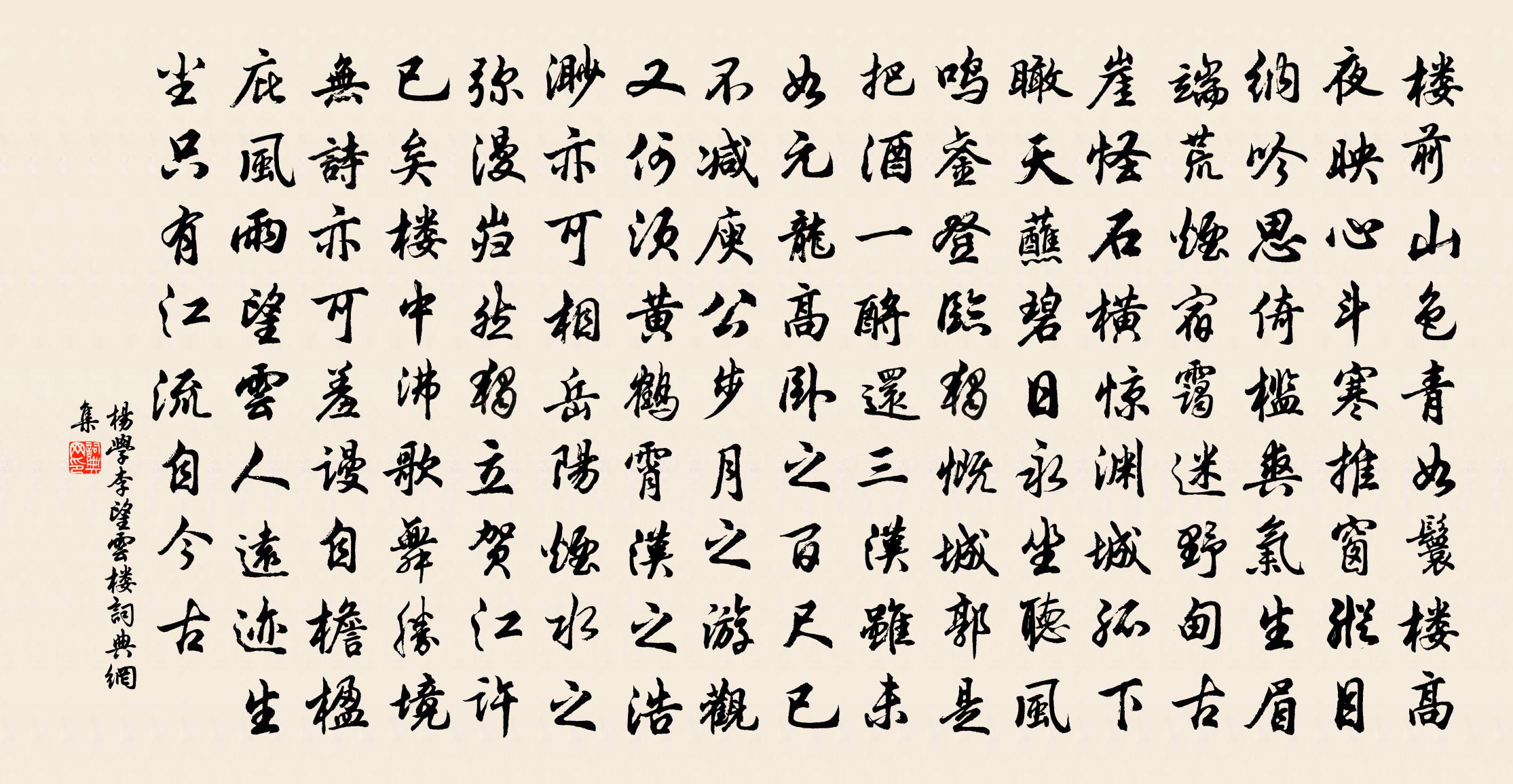 詩詞名句歷史字典書法欣賞書法字典國語詞典說文解字康熙字典古漢語字典標 題 作 者 詩 句 望雲樓作者:楊學李 朝代:宋代望雲樓原文樓前山色青如鬟,樓高夜映心斗寒。推窗縱目納吟思,倚檻爽氣生眉端。荒煙宿靄迷野甸,古崖怪石橫驚淵。城孤下瞰天蘸碧,日永坐聽風鳴鑾。登臨獨慨城郭是,把酒一酹還三漢。雖未如元龍高臥之百尺,已不減庾公步月之游觀。又何須黃鶴霄漢之浩渺,亦可相岳陽煙水之瀰漫。巋然獨立賀江許,已矣樓中沸歌舞。勝境無詩亦可羞,謾自檐楹庇風雨。望雲人遠跡生塵,只有江流自今古。詩詞問答問:望雲樓的作者是誰?答:楊學李問:望雲樓寫於哪個朝代?答:宋代楊學李望雲樓書法欣賞望雲樓書法作品詩詞推薦同薛員外誼久旱感懷寄兼呈上楊使君皎然〔唐代〕皇天鑒不昧,愐想何亢極。絲雨久愆期,綺霞徒相惑。陰雲舒又卷,濯枝安可得。涸井不累瓶,乾溪一憑軾。赤地孤憤吟十三首高斯得〔宋代〕阜錄新書幸已成,名山藏去復傳人。毋令十載編摩苦,竟與家書共厄秦。念良朋之難得嘆俗學之失真因成二絕胡宏〔宋代〕章句紛紛似世塵,一番空誤一番人。讀書不貴苟有說,離得語言才是真。擬古蘇泂〔宋代〕煌煌庭中菊,秋後各已花。玄霜下蒼葉,憔翠同凡葩。采之或傷生,不採謂我遐。遺賤詎不然,無已安其家。蕭條子規羅隱〔唐代〕銅梁路遠草青青,此恨那堪枕上聽。一種有冤猶可報,不如銜石疊滄溟。瓊花蘇泂〔宋代〕一樹婆娑種月華,夜闌依舊護風沙。今年不往揚州過,曾看夫人廟裡花。秋晚雜書三十首方回〔宋代〕游山酒不必眾,酒邂逅三五酒人。酌酒不在酒多,淺深十許巡。高可登即登,不復拘日辰。可飲即與飲,無問芻牧寄題江渙長官南園茅齋蘇轍〔宋代〕白髮章勤困小邦,塵勞坐使壯心降。河陽罷後成南圃,彭澤歸來臥北窗。畦畔草生親荷鍤,床頭酒熟自傾缸。因君春日舟中書所見武衍〔宋代〕共外風來夾膩香,片雲誰遣下巫陽。不須回首頻相雇,彼此傷春易斷腸。浪淘沙·莫上玉樓看韓疁〔宋代〕莫上玉樓看。花雨斑斑。四垂羅幕護朝寒。燕子不知人去也,飛認闌乾。回首幾關山。後會應難。相逢祗有夢魂間西鄰桑間有隙地從可五丈其橫五分之一荒蔓瓦鄭剛中〔宋代〕荒園茅塞閉牆隈,多謝西鄰借我開。力課頑僮移斷甓,小通幽徑養蒼苔。種雲無處容榿木,遮日聊須買竹栽。十畝世事釋斯植〔宋代〕世事皆浮雲,人間幾朝暮。不知溪上山,猶有桃源路。阮郎歸(春思)嚴仁〔宋代〕鰓花輕拂紫綿香。瓊杯初暖妝。貪憑雕檻看鴛鴦。無心上繡床。風絮亂。恣輕狂。惱人依舊忙。夢隨殘雨下高唐。和月岩趙希逢〔宋代〕涵虛一境絕人煙,掛星貫月棲羽仙。移來海上三島地,喚作人間幾洞天。追游有客驂鸞鳳,滿座清樂隊延兔蟾。舉題汪水雲詩卷十首胡斗南〔宋代〕詩家冷淡作生涯,有客相過旋煮茶。斫去梅花除去柳,繞隄只合種桑麻。無題蘇軾〔宋代〕簾卷窗穿戶不扃,隙塵風葉任縱橫。幽人睡足誰呼覺,攲枕床前有月明。題崇明寺魯千之〔宋代〕心情稍覺難如舊,勝跡依然日月新。鶴怨猿驚嗟往事,再來山色似迎人。寄集慶開山釋智愚〔宋代〕如意來屍釋梵宮。雨花狼藉濕春風。自慚老矣無靈骨,日在深雲聽講鍾。念奴嬌(賞芍藥)曾覿〔宋代〕人生行樂,算一春歡賞,都來幾日。綠暗紅稀春已去,贏得星星頭白。醉里狂歌,花前起舞,拚罰金杯百。淋漓宮迷仙引關詠〔宋代〕春陰霽。岸柳參差,裊裊金絲細。畫閣晝眠鶯喚起。煙光媚。燕燕雙高,引愁人如醉。慵緩步,眉斂金鋪倚。嘉景名句推薦嘆寄與路遙,夜雪初積。姜夔《暗香疏影》 雨蓑煙笠嚴陵近,慚愧清流照客顏查慎行《雨過桐廬》 紫泉宮殿鎖煙霞,欲取蕪城作帝家。李商隱《隋宮》 精於物者以物物,精於道者兼物物。荀子《荀子·解蔽》 白雲映水搖空城,白露垂珠滴秋月。李白《金陵城西樓月下吟》 喪不過三年,示民有終也。孔子及其弟子《孝經·喪親》 遇沉沉不語之士,且莫輸心;見悻悻自好之人,應須防口。洪應明《菜根譚·概論》 江間波浪兼天涌,塞上風雲接地陰。杜甫《秋興八首·其一》 民之難治,以其智多。故以智治國,國之賊;不以智治國,國之福。老子《老子·德經·第六十五章》 愁凝處,渺渺殘照紅斂吳文英《宴清都·秋感》