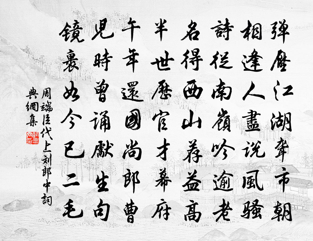 詩詞名句歷史字典書法欣賞書法字典國語詞典說文解字康熙字典古漢語字典標 題 作 者 詩 句 代上劉郎中作者:周端臣 朝代:宋代代上劉郎中原文彈壓江湖聾市朝,相逢人盡說風騷。詩從南嶺吟逾老,名得西山薦益高。半世歷官才幕府,午年還國尚郎曹。兒時曾誦先生句,鏡裹如今已二毛。詩詞問答問:代上劉郎中的作者是誰?答:周端臣問:代上劉郎中寫於哪個朝代?答:宋代周端臣代上劉郎中書法欣賞代上劉郎中書法作品詩詞推薦花心動 劍浦有感張翥〔元代〕花信風寒,綺窗深、匆匆禁菸時節。燕子乍來,宿雨才晴,滿樹海棠如雪。黛眉準擬明朝畫,燈花翦、妝奩雙疊。滿路花(和秋風吹渭水)黃裳〔宋代〕乾坤生古意,草木起秋聲。移人名利境,夢中驚。便尋靈寶,鳳髓與龜精。密報黃芽就,紫府門開,道情有個鶯鶯金塔黃叔美〔宋代〕金溪有金源,昔我未嘗造。因逢吳道士,言此山水好。金僧來自蜀,所至事幽討。地名適相符,結茅遂棲老。一朝醉後戲與趙歌兒岑參〔唐代〕秦州歌兒歌調苦,偏能立唱濮陽女。座中醉客不得意,聞之一聲淚如雨。向使逢著漢帝憐,董賢氣咽不能語。鳳棲梧 寄同道王丹桂〔元代〕世事紛紛何事苦。死去生來,輪販無停住。有幸高真開法宇。引人同上無生路。路上行人當聽屬。屬付虔誠,念道錦池汎舟贈莊器之二首張鎡〔宋代〕翠舫迎涼避日行,只隨風去不須撐。雲移茂樹添層影,魚喜新荷角嫩莖。客有何人從遠至,天憐吾輩太清生。功名詩應璩〔魏晉〕不悞牽朱絲。三署來相尋。【雙調】湘妃怨_楚天空闊楚阿魯威〔元代〕楚天空闊楚天長,一度懷人一斷腸。此心只在肩輿上,倩東風過武昌,助離愁煙水茫茫。竹上雨湘妃淚,樹中禽蜀詠史陸次雲〔清代〕儒冠儒服委丘墟,文採風流化土苴。尚有陸生坑不盡,留他馬上說詩書。牛渚曲王遂〔宋代〕岷江赴東海,牛渚鎮中流。古來濟渡處,落日迷滄洲。江東名勝士,清談付悠悠。氛埃更五閏,毒烈遍九州。六龍句章得象〔宋代〕萬頃波心露一拳,不知星落是何年。小重山 女歸寧還襄陽姚燧〔元代〕江渚蒹葭白露系。雲間渾未有、早鴻飛。人情難在別庭闈。攜諸幼、孤艇溯流歸。七十古來稀。乃翁筋力,尚未送趙子野歸劉宰〔宋代〕秦淮契闊幾經春,釣月臨風入夢頻。萬灶無嘩新號令,一樽相屬舊殷勤。綠波南浦予回棹,落日孤城子問津。聚散送祖印忠師南歸蘇頌〔宋代〕擾擾京華客,營營不自間。胡為丘壑者,亦到市朝間。孤月無留影,歸雲靡定山。東南清勝處,羨子一舟還。賀皇太子九月四日生辰十首楊萬里〔宋代〕光堯初御六龍天,上直維參大火躔。天意分明昌宋德,誕辰三世總丁年。趙提荊輓詞樓鑰〔宋代〕客授早登龍,襟期一笑同。門清心似水,論正氣如虹。近問書猶濕,重來跡遂空。無因送丹旐,老淚灑西風。明發西館晨炊藹岡四首楊萬里〔宋代〕人家爭住水東西,不是臨溪即背溪。拶得一家無去處,跨溪結屋更清奇。雪後東園午望楊萬里〔宋代〕天色輕陰小齋中,晝眠初醒未惺松。梅橫破屋無多雪,雲放東山第一峰。不道風光虧此老,將何功業答殘冬。土羔梅山弟來同飲醉書本堂陳著〔宋代〕誰將糟粕視詩書,兄弟何妨做拙儒。流水青山同醉處,清風明月幾歸途。樵歌相與為吟友,草市誰教見瑞夫。宇宙偈二十二首釋子淳〔宋代〕曉風吹散碧天支,日上長空景象分。寂照含虛無內外,當明一句若為論。名句推薦學之染人,甚於丹青。房玄齡《晉書·列傳·第五十二章》 事窮勢蹙之人,當原其初心;功成行滿之士,要觀其末路。洪應明《菜根譚·概論》 日出江花紅勝火,春來江水綠如藍。白居易《憶江南·江南好》 篳路藍縷,以啟山林。左丘明《左傳·宣公·宣公十二年》 喧啾百鳥群,忽見孤鳳凰。韓愈《聽穎師彈琴》 涼風起天末,君子意如何。杜甫《天末懷李白》 颯颯東風細雨來,芙蓉塘外有輕雷。李商隱《無題·颯颯東風細雨來》 圓荷浮小葉,細麥落輕花。杜甫《為農》 極目離離,遍地濛濛,官橋野塘。陳維崧《沁園春·詠菜花》 好水好山看不足,馬蹄催趁月明歸。岳飛《池州翠微亭》