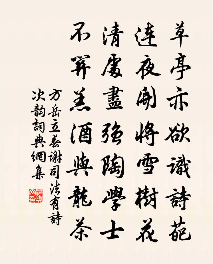詩詞名句歷史字典書法欣賞書法字典國語詞典說文解字康熙字典古漢語字典標 題 作 者 詩 句 立春謝司法有詩次韻作者:方岳 朝代:宋代立春謝司法有詩次韻原文草亭亦欲識詩葩,連夜開將雪樹花。清處盡強陶學士,不關羔酒與龍茶。詩詞問答問:立春謝司法有詩次韻的作者是誰?答:方岳問:立春謝司法有詩次韻寫於哪個朝代?答:宋代方岳立春謝司法有詩次韻書法欣賞立春謝司法有詩次韻書法作品詩詞推薦田家劉學箕〔宋代〕稻熟田間笑老農,咚咚村鼓樂時豐。新芻自酌花瓷碗,醉倒扶攜夕照中。宣上人病中相尋聯句李益〔唐代〕策杖迎詩客,歸房理病身。閒收無效藥,遍寄有情人。[廣宣]草木分千品,方書問六陳。還知一室內,爾我即天憶秦娥楊無咎〔宋代〕情難足。不堪黃帽催行速。催行速。扁舟一葉,別愁千斛。津亭送客驚相囑。舉杯欲唱眉先蹙。眉先蹙。背人掩面直鉤和韻徐儼夫〔宋代〕一曲湖邊一釣磯,桃花風定柳綿飛。漁人豈識濠梁趣,只解沙頭盡醉歸。南歌子(呈葉憲)洪适〔宋代〕多病都緣老,寒陰可惜春。栽桃種竹怕因循。移轉藍輿藤杖、未開門。真率須如約,安排欲效顰。莫將箏笛損精神虛谷志歸十首方回〔宋代〕園林百種花,更著竹交加。徑別君臣藥,畦連子母瓜。老夫元是我,長息最憐他。擬賣嚴州宅,歸來共一家。久雨劉克莊〔宋代〕晴旭常難保,春寒未易禁。鋒交馬旋濘,室毀燕巢林。民望兵如雨,人言潦屬陰。何當抉雲霧,放出太陽臨。疾風宋庠〔宋代〕天陸箕躔動,林簫萬籟空。扶搖莊海北,悲眩魯門東。貪誡詩人隧,清思賦客雄。何因知勁草,霜陌盡飛蓬。送夏侯校書歸上都韓翃〔唐代〕後輩傳佳句,高流愛美名。青春事賀監,黃卷問張生。暮雪重裘醉,寒山匹馬行。此回將詣闕,幾日諫書成。逍遙詠宋太宗〔宋代〕世利貪拘束,欺心自不知。一真求意在,四敘絕參差。頓悟超諸聖,娛情改換痴。生前如似夢,願重細推之。偈頌二十一首釋堅璧〔宋代〕金葉銀莖報有秋,明珠萬斛堂中收。自從一飽家田飯,不用埋頭向外求。玉蹀躞/解蹀躞曹勛〔宋代〕雨過池台秋靜,桂影涼清晝。槁葉喧空,疏黃滿堤柳。風外殘菊枯荷,憑闌一餉,猶喜冷香襟袖。少歡偶。人道消和孔純老按屬邑六首王之道〔宋代〕雲濤雪浪渺無邊,一簇溪橋客聚船。輿衛欲休紅日下,幾家茅舍起炊煙。金陵十二釵又副冊——晴雯曹雪芹〔清代〕霽月難逢,彩雲易散。心比天高,身為 * 。風流靈巧招人怨。壽夭多因誹謗生,多情公子空牽念!將游東都留別包諫議戴叔倫〔唐代〕衰客慚墨綬,素舸逐秋風。雲雨恩難報,江湖意已終。縣當仙洞口,路出故園東。唯有新離恨,長留夢寐中。八冬苦雨禱晴幸應劉若訥惠詩為賀因次其韻韓元吉〔宋代〕麥田秋過未休工,{左禾右罷}稏如雲白雨中。乞得晴明三十日,披襟可詠快哉風。讀王伯大都承奏疏王邁〔宋代〕曳紫腰金滿闕庭,被渠喚作集瓜蠅。適從何處來居此,面目人嫌鬼亦憎。送琴遂還楚東方岳〔宋代〕腳根踏地袈裟破,鼻孔撩天拄杖橫。歸掃秋雲趺足坐,荻花半落晚風晴。挽戚虛中華岳〔宋代〕夢裹匡廬興未闌,轉頭世事已辛酸。肥家有術疑非藥,漉酒從人笑不冠。雁序向人群已失,鳳雛過眼影何單。不堪江樓二首韓偓〔唐代〕夢啼嗚咽覺無語,杳杳微微望煙浦。樓空客散燕交飛,江靜帆飛日亭午。魚是魚苦筍香味新,楊柳酒旗三月春。風名句推薦霰雪紛其無垠兮,雲霏霏而承宇。屈原《九章》 縱使文章驚海內,紙上蒼生而已。龔自珍《金縷曲·癸酉秋出都述懷有賦》 夜來南風起,小麥覆隴黃。白居易《觀刈麥》 紫菊氣,飄庭戶,晚煙籠細雨。李煜《謝新恩·冉冉秋光留不住》 漫江碧透,百舸爭流。 * 《沁園春·長沙》 用人物,須明求。儻不問,即為偷。李毓秀《弟子規·謹》 雖使鬼神請亡,此猶可以合歡聚眾,取親於鄉里。墨子《墨子·31章 明鬼(下)》 故聲聞過情,君子恥之。孟子《孟子·離婁章句下·第十八節》 厚祿故人書斷絕,恆飢稚子色淒涼。杜甫《狂夫》 弈之為數,小數也;不專心致志,則不得也。孟子《孟子·告子章句上·第九節》