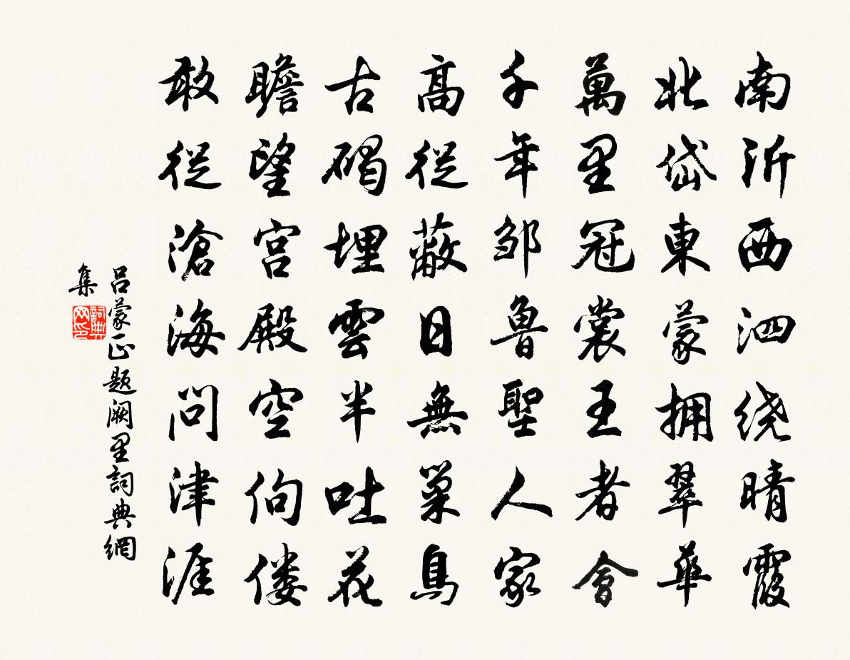 詩詞名句歷史字典書法欣賞書法字典國語詞典說文解字康熙字典古漢語字典標 題 作 者 詩 句 題闕里作者:呂蒙正 朝代:宋代題闕里原文南沂西泗繞晴霞,北岱東蒙擁翠華。萬里冠裳王者會,千年鄒魯聖人家。高從蔽日無巢鳥,古碣埋雲半吐花。瞻望宮殿空佝僂,敢從滄海問津涯。詩詞問答問:題闕里的作者是誰?答:呂蒙正問:題闕里寫於哪個朝代?答:宋代呂蒙正題闕里書法欣賞題闕里書法作品詩詞推薦勸學張詠〔宋代〕大化不自言,委之在英才。玄門非有閉,苦學當自開。世上百代名,莫遣寒如灰。晨雞固自勉,男子胡為哉。胸中即事李流謙〔宋代〕畏熱客不來,習懶我倦出。愛閒閒不徹,一日如兩日。晚風生微涼,佳月掛西壁。誰為無事人,共此可憐夕。午日三首梅堯臣〔宋代〕百草堪為藥,舟行不及收。岸旁蕭與艾,從聽到寒休。第一百七十五文天祥〔宋代〕小人困馳驟,後生血氣豪。世事固堪論,我何隨汝曹。水龍吟(壽白蘭谷)陳深〔宋代〕此翁疑是香山,老來愈覺才情富。天孫借與,金刀玉尺,裁雲縫霧。一曲陽春,樽前惟欠,柳蠻櫻素。對蒼松翠竹送汲助教醫博釋子淳〔宋代〕未到毗耶城,不識維摩病。有客兮良醫,妙術通神聖。金鍼鍼起髑髏吟,此曲千年誰與並。題高雲客舍皇甫冉〔唐代〕孤興日自深,浮雲非所仰。窗中西城峻,樹外東川廣。晏起簪葛巾,閒吟倚藜杖。阮公道在醉,莊子生常養。五柳頌古一○一首釋子淳〔宋代〕偶爾垂言借問伊,知音爭使落今時。胡笳不犯宮商曲,玉備橫時劫外吹。送元八游汝南劉長卿〔唐代〕元生實奇邁,幸此論疇昔。刀筆素推高,鋒芒久無敵。縱橫濟時意,跌宕過人跡。破產供酒錢,盈門皆食客。田園驅馬張耒〔宋代〕駸駸驅馬去,秋晚思悠哉。日暖禾黍熟,霜晴鴻雁來。晚篁經雨出,幽菊犯寒開。官冷無拘束,尋山首易回。叔父惠鉢三首陳師道〔宋代〕 * 未有祖師意,洗鉢何曾識趙州。萬里空歸君解否,老胡端為我能留。連昌宮詞二首階陸龜蒙〔唐代〕草沒苔封疊翠斜,墜紅千葉擁殘霞。年年直為秋霖苦,滴陷青珉隱起花。樂府詩曹叡〔魏晉〕昭昭素明月。暉光燭我床。憂人不能寐。耿耿夜何長。微風沖閨闥。羅帷自飄揚。攬衣曳長帶。屣履下高堂。東西雜感陸游〔宋代〕側帽垂鞭小陌東,名花迎笑一枝紅。啼鶯驚斷尋春夢,惆悵新霜點鬢蓬。因過張郎中識孫才翁教授時徐衡仲亦在坐成四張鎡〔宋代〕邂逅如相約,新交會舊知。軒窗渾未暑,賓主總能詩。小草浮冰楮,初篁映錦葵。星郎風韻殺,我輩盍幽期。巫山廟蘇轍〔宋代〕山中廟堂古神女,楚巫婆娑奏歌舞。空山日落悲風吹,舉手睢盱道神語。神仙潔清非世人,瓦盎傾醪薦麋脯。子知三月三十日微雨偶成詩二十四韻書懷獻留守開司馬光〔宋代〕春盡少歡意,昏昏睡思添。正憂花氣索,更用雨聲兼。乍語鶯喉澀,慵飛柳絮黏。落英紅沒砌,茂草碧侵簾。寶相雁門胡人歌崔顥〔唐代〕高山代郡東接燕,雁門胡人家近邊。解放胡鷹逐塞鳥,能將代馬獵秋田。山頭野火寒多燒,雨里孤峰濕作煙。聞道帝子歌李賀〔唐代〕洞庭帝子一千里,涼風雁啼天在水。九節菖蒲石上死,湘神彈琴迎帝子。山頭老桂吹古香,雌龍怨吟寒水光。沙浦秋來瘦甚而益健戲作陸游〔宋代〕莫笑形羸不自支,清虛正與老人宜。矛頭淅米誰能食,甑里生塵卻自奇。獨釣又逢秋晚後,安眠常到日高時。邇來名句推薦獨自下層樓,樓下蛩聲怨。程垓《卜運算元·獨自上層樓》 朝屯雪山下,暮宿青海旁。韋元甫《木蘭歌》 手攜稚子夜歸院,月冷空房不見人。白居易《為薛台悼亡》 恨無千日酒,空斷九迴腸。劉彤《臨江仙·千里長安名利客》 金樽清酒斗十千,玉盤珍羞直萬錢。李白《行路難·其一》 治國無法則亂,守法而弗變則悖,悖亂不可以持國。呂不韋《呂氏春秋·覽·慎大覽》 繡嶺宮前鶴髮翁,猶唱開元太平曲李洞《繡嶺宮詞》 故人江海別,幾度隔山川。司空曙《雲陽館與韓紳宿別》 一寸柔腸情幾許?薄衾孤枕,夢回人靜,徹曉瀟瀟雨。惠洪《青玉案·絲槐煙柳長亭路》 人之情多矯,世之俗多偽,豈可信乎?來俊臣《羅織經·閱人卷第一》
