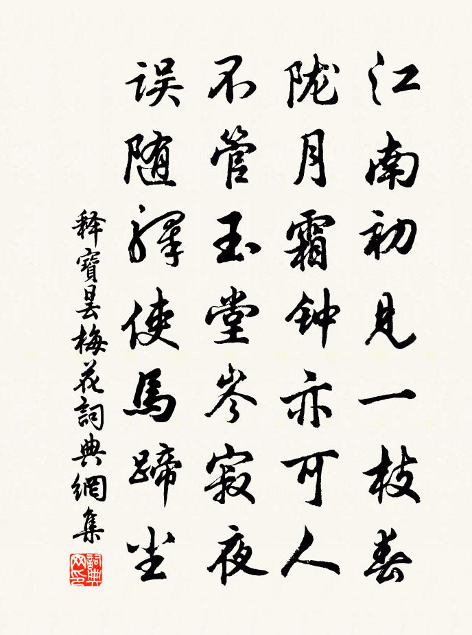 詩詞名句歷史字典書法欣賞書法字典國語詞典說文解字康熙字典古漢語字典標 題 作 者 詩 句 梅花作者:釋寶曇 朝代:宋代梅花原文江南初見一枝春,隴月霜鍾亦可人。不管玉堂岑寂夜,誤隨驛使馬蹄塵。詩詞問答問:梅花的作者是誰?答:釋寶曇問:梅花寫於哪個朝代?答:宋代釋寶曇梅花書法欣賞梅花書法作品詩詞推薦菩薩蠻 題錢德鈞水村圖 珊瑚木難卷二陸祖允〔元代〕當年圖畫知何處。如今身向滄洲住。吾亦愛吾廬。芸窗幾卷書。青山天際小。目送飛鴻杳。試問釣魚船。蘆花淺水東澗為余序後稿余以國帖唐碑古壺潤筆反成□劉克莊〔宋代〕玄晏欣然托序行,緼袍被袞豈非榮。家徒四壁窮難諱,空答三縑禮尚輕。金薤銀鉤俱妙絕,石泉香餅太清生。如何戲效樂天體張鎡〔宋代〕去日不可再,來日焉可虛。直待百事足,漫把四大拘。黃河幾曾清,白髮莫旋烏。全福貴安然,真樂難強圖。樸直句蕭德藻〔宋代〕乾坤生長我,貧病怨尤誰。初食雞頭有感歐陽修〔宋代〕六月京師暑雨多,夜夜南風吹芡嘴。凝祥池鎖會靈園,僕射荒陂安可擬。爭先園客采新苞,剖蚌得珠從海底。都城趙戶自任所抵烏駐用前韻見示和之陳宓〔宋代〕自昔桐城別,於今兩閱秋。暌違嗟地遠,聚散似萍浮。獨發皇都道,同登烏駐舟。人生非苟合,誰謂雨能留。雨望方岳〔宋代〕前溪雨埋村,咫尺不我過。雷霆但濛鴻,林莽亦掀簸。竟微一飄灑,起此北窗臥。對面自胡越,孰為天宇大。得非在伯用沅陵韻見貽次韻趙蕃〔宋代〕一代數人君有傳,九原可作我無緣。頗思燈火親餘暇,卻恨江湖枉過年。載辱新詩為永好,絕知高義有哀憐。官閒龍巖寺孫懋〔宋代〕蒼林翠碧龍巖寺,縣令三年兩度來。從此岩前花與草,只今時與夢徘徊。次韻林太淵二首劉克莊〔宋代〕時賢多以刻為明,撫字催科鮮並行。聞舊吏民皆向化,喜新令尹不求贏。察簾外事非中道,立路傍碑亦近名。莫比江上逢春張均〔唐代〕離憂耿未和,春慮忽蹉跎。擇木猿知去,尋泥燕獨過。驚花翻霽日,垂柳拂煙波。激意屢怡賞,無如鄉念何。酬元十二武元衡〔唐代〕偶尋烏府客,同醉習家池。積雪初迷徑,孤雲遂失期。風前勞引領,月下重相思。何必因尊酒,幽心兩自知。答李景文見寄孔武仲〔宋代〕金沙會面慰飄蓬,況得連朝笑語商。縱飲不知明月墮,納涼尤愛小軒東。郵亭送別淒涼後,江郭憑欄悵望中。兩幅好事近曾覿〔宋代〕霽雪好風光,恰是相逢時節。酒量不禁頻勸,便醉倒人側。嚴城更漏夜厭厭,應有斷腸客。莫問落梅三弄,喜一枝西亭曾鞏〔宋代〕團扇頻揮到此亭,他鄉愁坐思冥冥。空羞避俗無高節,轉覺逢人惡獨醒。歲月淹留隨日老,乾坤狼狽幾時寧。欲知郁山主贊釋師範〔宋代〕收得蚌蛤珠,誇張無價數。我儂不怪他,他是村山主。送吳顯道五首王安石〔宋代〕滕王高閣臨江渚,東邊日出西邊雨。十五年前此會同,天際張帷列樽俎。公今此去何時歸,我今停杯一問之。春風魏倉曹東堂檉樹李頎〔唐代〕愛君雙檉一樹奇,千葉齊生萬葉垂。長頭拂石帶煙雨,獨立空山人莫知。攢青蓄翠陰滿屋,紫穗紅英曾斷目。洛陽雜詩李復〔宋代〕先王急民事,分吏察壠畝。田荒宅 * ,置法責粟布。壤壤一歲勤,暴暴三年聚。農政久不修,幾家有禾黍。送李節推挈內歸寧池陽並李察推往南康軍嫁妹梅堯臣〔宋代〕江上雙畫舸,風帆或先後。晚共泊蘆洲,欣同幕中友。一過長風沙,一住貴池口。當時驄馬客,今是憑熊守。每憐名句推薦風緊雁行高,無邊落木蕭蕭。納蘭性德《河瀆神·風緊雁行高》 一點殘紅欲盡時。乍涼秋氣滿屏幃。周紫芝《鷓鴣天·一點殘紅欲盡時》 嘆寄與路遙,夜雪初積。姜夔《暗香疏影》 好事不出門,壞事傳千里。佚名《增廣賢文·上集》 資之深,則取之左右逢其原。孟子《孟子·離婁章句下·第十四節》 明妃一朝西入胡,胡中美女多羞死。李白《于闐採花》 黯與山僧別,低頭禮白雲。李白《秋浦歌十七首》 時不可失,喪不可久左丘明《國語·晉語·里克殺奚齊而秦立惠公》 情似遊絲,人如飛絮。淚珠閣定空相覷。周紫芝《踏莎行·情似遊絲》 洛陽城裡見秋風,欲作家書意萬重。張籍《秋思》