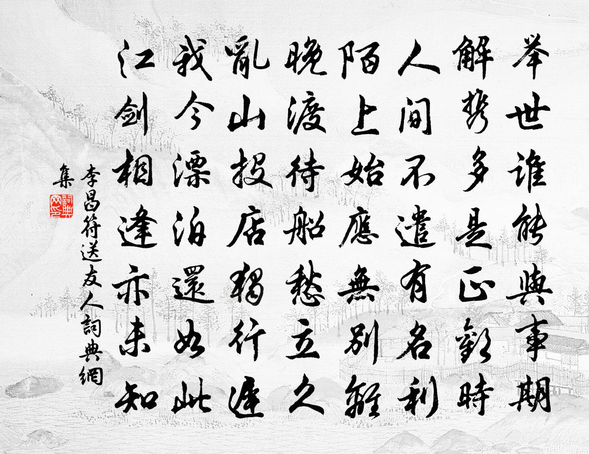 詩詞名句歷史字典書法欣賞書法字典國語詞典說文解字康熙字典古漢語字典標 題 作 者 詩 句 送友人作者:李昌符 朝代:唐代送友人原文舉世誰能與事期,解攜多是正歡時。人間不遣有名利,陌上始應無別離。晚渡待船愁立久,亂山投店獨行遲。我今漂泊還如此,江劍相逢亦未知。詩詞問答問:送友人的作者是誰?答:李昌符問:送友人寫於哪個朝代?答:唐代問:送友人是什麼體裁?答:七律李昌符送友人書法欣賞送友人書法作品注釋全唐詩:卷601-25詩詞推薦聞李安下第因有所感魏野〔宋代〕客攜春榜至,開處倚柴荊。未看御題目,先尋君姓名。本期鄰狀首,敢嘆滯文明。不會玄穹意,默然空愴情。山樵王崈〔宋代〕山樵竹里居,略彴才堪渡。落日澹平疇,牛羊點寒暮。詠雜花詩何遜〔南北朝〕井上發新花。誰言不經染。已如薄紫拂。復似濃紅點。狀錦無裁縫。依霞有舒斂。太行范成大〔宋代〕西北浮雲卷暮秋,太行南麓照封丘。橫峰側嶺知多少,行到燕山翠未休。贈龍王山庵秀上人趙蕃〔宋代〕道人學易更參禪,一住江頭已六年。勸我小留殊小顧,那知風雪有回船。夜泊龍廟回望建康有感陸游〔宋代〕我醉行水上,身輕如飛煙。魚龍互悲嘯,伴我夜不眠。羽扇揮浮雲,月掛牛斗間。河漢橫復斜,風露方浩然。坡陀頌古十六首釋心月〔宋代〕問處赤心片片,答處不負來機。今有問靈隱如,何是實際理地。頌古四十四首釋師範〔宋代〕一柄無情雪刃刀,當鋒誰敢犯送毫。馬師父子親提掇,血噴千山怒號。高宗明堂前朝獻景靈宮十首真宗〔宋代〕德惟聲香,升聯八方。奧神之從,璨然有光。驂飛乘蒼,啾啾蹌蹌。消搖從容,顧予不忘。胡人走馬行孔武仲〔宋代〕天街極目如平水,胡人走馬天街裹。南宮宴罷晚色深,宿雨初乾塵不起。胡巾滿插漢京花,胡鞍一簇濃如霞。千蹄目痛一月未愈自和前九首劉克莊〔宋代〕乍可頻看短劍,渠肯高張長檠。已與鷗盟浩蕩,都忘鵠立通明。鷓鴣天辛棄疾〔宋代〕著意尋春懶便回,何如信步兩三杯?山才好處行還倦,詩未成時雨早催。攜竹杖,更芒鞋,朱朱粉粉野蒿開。誰家不寐范成大〔宋代〕春宵似暖非暖,曉夢欲成未成。風竹時驚雀噪,月窗誰伴梅橫?重遊洛川邵雍〔宋代〕買石尚饒雲,買山當從水。雲可致無心,水能為鑑止。性以無心明,情由鑒止已。二者不可失,出彼而入此。登鸛雀樓耿湋〔唐代〕久客心常醉,高樓日漸低。黃河經海內,華岳鎮關西。去遠千帆小,來遲獨鳥迷。終年不得意,空覺負東溪。上已游惠泉和趙國興韻陳文蔚〔宋代〕閒倚欄桿覺句時,此身如在浣花溪。草迷芳徑王孫醉,花滿春山杜宇啼。酒罷啜茶留石井,舉餘隨月步江堤。清泉寄題臨江玉實齋司戶百花洲宋伯仁〔宋代〕錦囊詩裹識花洲,何日清江得醉游。百畝故園重餖飣,四賢遺像愈風流。香浮紅樹春應早,雪壓寒梅月想留。我有贈劉子卿時劉將赴官鎮江並以道別三首趙蕃〔宋代〕江驛頻臨我,林園屢過公。只言成遂別,何意復來同。有用期思勉,無詩枉坐窮。舊聞京口酒,準擬醉孤蓬。題桃源佚名〔宋代〕忽入桃源景可猜,莫非道士亦曾栽。舟行泝水沿溪進,花映清流夾岸開。石澗有岐封碧草,洞門無俗長蒼苔。方知宿齋太乙宮答李寺丞次韻楊億〔宋代〕泰畤齋居肅,梧楸蔭繚垣。露葵深得味,風鐸乍成喧。綠髮松喬侶,丹經黃老言。心期阻良久,蝶夢繞朱門。名句推薦眾人助之以力,近者結之以成,遠者譽之以名,尊者載之以勢。韓非及後人《韓非子·功名》 黃塵清水三山下,更變千年如走馬。李賀《夢天》 食必常飽,然後求美;衣必常暖,然後求麗劉向《說苑·反質》 冰肌玉骨,自清涼無汗。蘇軾《洞仙歌·冰肌玉骨》 戰陣之間,不厭詐偽。韓非及後人《韓非子·難一》 別來半歲音書絕,一寸離腸千萬結。韋莊《應天長·別來半歲音書絕》 宦情羈思共淒淒,春半如秋意轉迷柳宗元《柳州二月榕葉落盡偶題》 君子成人之美,不成人之惡;小人反是。孔子弟子《論語·顏淵篇》 東籬把酒黃昏後,有暗香盈袖。李清照《醉花陰·薄霧濃雲愁永晝》 私勿與人,謀必辟。來俊臣《羅織經·治下卷第三》