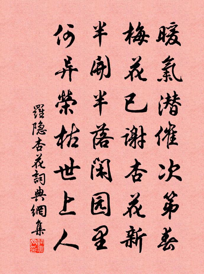 詩詞名句歷史字典書法欣賞書法字典國語詞典說文解字康熙字典古漢語字典標 題 作 者 詩 句 杏花作者:羅隱 朝代:唐代杏花原文暖氣潛催次第春,梅花已謝杏花新。半開半落閒園裡,何異榮枯世上人?詩詞問答問:杏花的作者是誰?答:羅隱問:杏花寫於哪個朝代?答:唐代問:杏花是什麼體裁?答:七絕問:羅隱的名句有哪些?答:羅隱名句大全羅隱杏花書法欣賞杏花書法作品譯文和注釋譯文暖風吹來,帶來了春天的氣息。盛開的梅花此時已經凋謝,但杏花正一朵朵的盛開。園裡的杏花一半正開一半已落,這和世上人的榮枯差別何其相似。注釋次第:依次。標籤:春天,寫花詩詞推薦春日秦國懷古周朴〔唐代〕荒郊一望欲消魂,涇水縈紆傍遠村。牛馬放多春草盡,原田耕破古碑存。雲和積雪蒼山晚,煙伴殘陽綠樹昏。數里人日立春盧仝〔唐代〕春度春歸無限春,今朝方始覺成人。從今克己應猶及,顏與梅花俱自新。喜春來·攜將玉友尋花寨元好問〔金代〕攜將玉友尋花寨,看褪梅妝等杏腮,休隨劉阮到天台。仙洞窄,且唱喜春來。木蘭花慢 西湖送春 詞品卷六梁曾〔元代〕問花花不語,為誰落,為誰開。算春色三分,半隨流水,半入塵埃。人生能幾歡笑,但相逢、尊酒莫相催。千古幕謁金門·春半朱淑真〔宋代〕春已半。觸目此情無限。十二闌乾閒倚遍。愁來天不管。 好是風和日暖。輸與鶯鶯燕燕。滿院落花簾不捲。斷腸魚遊春水·秦樓東風裡佚名〔宋代〕秦樓東風裡,燕子還來尋舊壘。餘塞猶峭,紅日薄侵羅綺。嫩草方抽玉茵,媚柳輕窣黃金蕊。鶯囀上林,魚遊春水殘花李清照〔宋代〕花開花落花無悔,緣來緣去緣如水。花謝為花開,花飛為花悲。花悲為花淚,花淚為花碎。花舞花落淚,花哭花瓣永遇樂·舟中感舊徐燦〔清代〕無恙桃花,依然燕子,春景多別。前度劉郎,重來江令,往事何堪說。逝水殘陽,龍歸劍杳,多少英雄淚血。千古蝶戀花·準擬春來消寂納蘭性德〔清代〕準擬春來消寂寞。愁雨愁風,翻把春擔閣。不為傷春情緒惡,為憐鏡里顏非昨。畢竟春光誰領略。九陌緇塵,抵死送蜀客雍陶〔唐代〕劍南風景臘前春,山鳥江風得雨新。莫怪送君行較遠,自緣身是憶歸人。寓言三首·其三李白〔唐代〕長安春色歸,先入青門道。綠楊不自持,從風欲傾例。海燕還秦宮,雙飛入簾櫳。相思不相見,託夢遼城東。點絳唇·梅朱翌〔宋代〕流水泠泠,斷橋橫路梅枝亞。雪花飛下,渾似江南畫。白璧青錢,欲 * 無價。歸來也,風吹平野,一點香隨馬。春日田園雜興范成大〔宋代〕柳花深巷午雞聲,桑葉尖新綠未成。坐睡覺來無一事,滿窗晴日看蠶生。土膏欲動雨頻催,萬草千花一餉開;舍後蝶戀花·和漱玉詞王士禎〔清代〕涼夜沉沉花漏凍,欹枕無眠,漸覺荒雞動。此際閒愁郎不共,月移窗罅春寒重。 憶共錦衾無半縫,郎似桐花,南湖早春白居易〔唐代〕風回雲斷雨初晴,返照湖邊暖復明。亂點碎紅山杏發,平鋪新綠水蘋生。翅低白雁飛仍重,舌澀黃鸝語未成。不道減字木蘭花·立春蘇軾〔宋代〕春牛春杖。無限春風來海上。便丐春工。染得桃紅似肉紅。 春幡春勝。一陣春風吹酒醒。不似天涯。捲起楊花似謁金門·雙喜鵲王庭筠〔宋代〕雙喜鵲,幾報歸期渾錯。盡做舊愁都忘卻,新愁何處著?瘦雪一痕牆角,青子已妝殘萼。不道枝頭無可落,東風猶仲春郊外王勃〔唐代〕東園垂柳徑,西堰落花津。物色連三月,風光絕四鄰。鳥飛村覺曙,魚戲水知春。初晴山院裡,何處染囂塵。瑞鶴仙·悄郊原帶郭周邦彥〔宋代〕悄郊原帶郭,行路永,客去車塵漠漠。斜陽映山落,斂餘紅、猶戀孤城闌角。凌波步弱,過短亭、何用素約。有流望海潮·洛陽懷古秦觀〔宋代〕梅英疏淡,冰澌溶泄,東風暗換年華。金谷俊游,銅駝巷陌,新晴細履平沙。長憶誤隨車,正絮翻蝶舞,芳思交加名句推薦道傍榆莢仍似錢,摘來沽酒君肯否。岑參《戲問花門酒家翁》 篇之彪炳,章無疵也;章之明靡,句無玷也;句之清英,字不妄也。劉勰《文心雕龍·章句》 算明朝、未了重陽,紫萸應耐看。吳文英《霜花腴·重陽前一日泛石湖》 婿為燕國王,身被詔獄加。李白《秦女休行》 文章是山水化境,富貴乃煙雲幻形。王永彬《圍爐夜話·第一二二則》 襄陽古道灞陵橋,詩興與秋高。完顏璹《朝中措·襄陽古道灞陵橋》 一朵江梅春帶雪。玉軟雲嬌,姑射肌膚潔。趙鼎《蝶戀花·一朵江梅春帶雪》 壯歲從戎,曾是氣吞殘虜。陸游《謝池春·壯歲從戎》 接葉巢鶯,平波卷絮,斷橋斜日歸船。張炎《高陽台·西湖春感》 三歲為婦,靡室勞矣。夙興夜寐,靡有朝矣。佚名《氓》