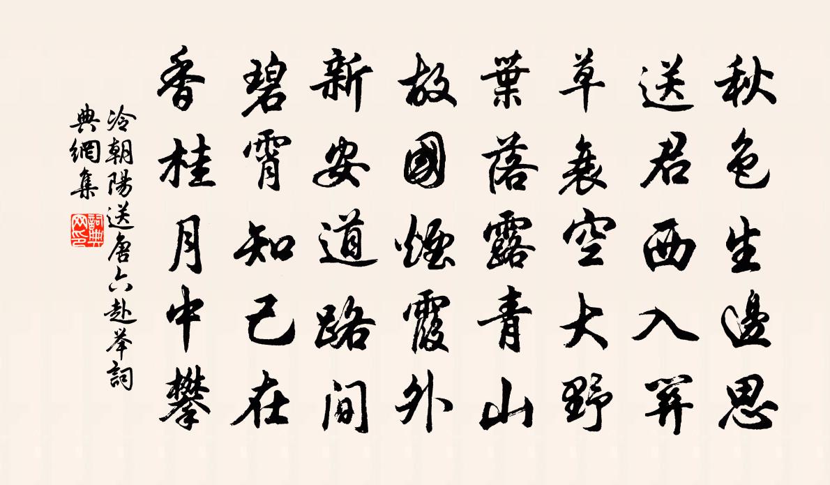 詩詞名句歷史字典書法欣賞書法字典國語詞典說文解字康熙字典古漢語字典標 題 作 者 詩 句 送唐六赴舉作者:冷朝陽 朝代:唐代送唐六赴舉原文秋色生邊思,送君西入關。草衰空大野,葉落露青山。故國煙霞外,新安道路間。碧霄知己在,香桂月中攀。詩詞問答問:送唐六赴舉的作者是誰?答:冷朝陽問:送唐六赴舉寫於哪個朝代?答:唐代問:送唐六赴舉是什麼體裁?答:五律冷朝陽送唐六赴舉書法欣賞送唐六赴舉書法作品注釋全唐詩:卷305-30詩詞推薦乾道乙酉鬻田訓子有作孫介〔宋代〕顏回猶自給糜飦,蘇子初無二頃田。知慕聖師瞠若後,豈令恭嫂倨如前。筆耕得利寧分地,學祿中居總藉天。卜相南華五十韻朱翌〔宋代〕鄉里黃梅接,家居祖剎鄰。常聞肉身佛,甘作磑坊人。堅有懸腰石,空無拂鏡塵。已舂諸米熟,自識本心真。拄杖次韻李參政見寄三首魏了翁〔宋代〕自失鷗邊約,應羞鶴上人。竹荒青翼短,書遠墨題親。世事方嘗膽,時賢謾飲醇。國疑誰為嗣,公子爭振振。題二妃廟李群玉〔唐代〕黃陵廟前春已空,子規啼血滴松風。不知精爽歸何處,疑是行雲秋色中。得故人楊備書宋祁〔宋代〕款款南雲信,相存安穩不。比年常屬疾,茲地幸為州。浩蕩親知隔,奔騰日月遒。暴公初有刺,孫叔竟無謀。黑白題偶愛方岳〔宋代〕每評吾郡佳山水,當以水西為最奇。徑向水西非具眼,不眠偶愛不渠知。青春張耒〔宋代〕青春忽妍好,半嶺麗朝陽。谷鳥喜相見,園花明曉妝。閒居耽道味,吟眺惜風光。扣戶有佳客,悠然三舉觴。夏日四絕潘良貴〔宋代〕錯落星河天未明,太虛涵露氣全清。東方隱約生光耀,便覺林間宿鳥驚。胡程寺二首李呂〔宋代〕上天一何慘,盛夏忽霜飛。竟奪慈母去,焉用此身為。空餘白雲念,無復彩戲時。一恨一灑血,何以報春暉。言行吟邵雍〔宋代〕能言未是難,行得始為艱。須是真男子,方能無厚顏。沈詢佚名〔唐代〕莫打南來雁,從他向北飛。打時雙打取,莫遣兩分離。句晃逈〔宋代〕心如蓮花不著水,身似翔鴻不可籠。送從上人馳書至京西釋正覺〔宋代〕衲帔蒙頭自照人,月明堂上轉機輪。肯傳千里鶺鴒語,要作十分棠棣春。雪嶺同風當日事,石頭束篾舊時麟。家林輕薄篇李益〔唐代〕豪不必馳千騎,雄不在垂雙鞬。天生俊氣自相逐,出與鵰鶚同飛翻。朝行九衢不得意,下鞭走馬城西原。忽聞燕雁臨池閒臥白居易〔唐代〕小竹圍庭匝,平池與砌連。閒多臨水坐,老愛向陽眠。營役拋身外,幽奇送枕前。誰家臥床腳,解系釣魚船。慶江檢詳太夫人潛放〔宋代〕見說團欒醉壽觥,椒盤長近歲崢嶸。今年臘里欣逢閏,直待春回卻舉行。玉汝從溧陽來辱李晦庵以詩問訊次韻寄答二首趙蕃〔宋代〕有身真有累,無地亦無錐。遇事頻三北,乾時愧六奇。自嗟寒若此,誰閔病而衰。已辦窮秋去,寧余幾日思。雜詠五言八首劉克莊〔宋代〕斷弦難續矣,讀者尚悲辛。不似窮馮衍,甘為薄倖人。柳李冶〔唐代〕最愛纖纖曲水濱,夕陽移影過青蘋。東風又染一年綠,楚客更傷千里春。低葉已藏依岸棹,高枝應閉上樓人。舞腰張芬見訪郊居作皇甫曾〔唐代〕林中雨散早涼生,已有迎秋促織聲。三徑荒蕪羞對客,十年衰老愧稱兄。秋心自惜江蘺晚,世事方看木槿榮。君若名句推薦粉色全無飢色加,豈知人世有榮華。杜荀鶴《蠶婦》 夢繞邊城月,心飛故國樓。李白《太原早秋》 君似孤云何處歸,我似離群雁。周紫芝《卜運算元·席上送王彥猷》 孤花片葉,斷送清秋節。納蘭性德《清平樂·孤花片葉》 白雲一片去悠悠,青楓浦上不勝愁。張若虛《春江花月夜》 菊暗荷枯一夜霜。新苞綠葉照林光。蘇軾《浣溪沙·詠橘》 絕代有佳人,幽居在空谷。杜甫《佳人》 雲青青兮欲雨,水澹澹兮生煙。李白《夢遊天姥吟留別 / 別東魯諸公》 滿目飛花萬點,回首故人千里,把酒沃愁腸。葛長庚《水調歌頭·江上春山遠》 算翠屏應是,兩眉餘恨倚黃昏。孔夷《南浦·旅懷》