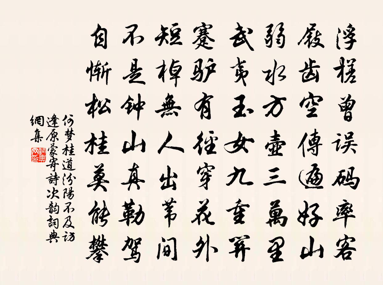 詩詞名句歷史字典書法欣賞書法字典國語詞典說文解字康熙字典古漢語字典標 題 作 者 詩 句 道汾陽不及訪逢原蒙寄詩次韻作者:何夢桂 朝代:宋代原文浮槎曾誤碼率客,屐齒空傳遍好山。弱水方壺三萬里,武夷玉女九重關。蹇驢有徑穿花外,短棹無人出葦間。不是鐘山真勒駕,自慚松桂莫能攀。詩詞問答問:《道汾陽不及訪逢原蒙寄詩次韻》的作者是誰?答:何夢桂問:該詩寫於哪個朝代?答:宋代書法欣賞道汾陽不及訪逢原蒙寄詩次韻書法作品詩詞推薦望月詩庾信〔南北朝〕夜光流未曙。金波影尚賒。照人非七子。含風異九華。蓂新半壁上。桂滿獨輪斜。乘舟聊可望。無假逐仙槎。延平呈潘王二丈陳宓〔宋代〕小樓中峙萬峰環,正值青螺取巧間。坐待清風送明月,等閒高枕對溪山。直指大丹歌呂岩〔唐代〕三清宮殿隱昆巔,日月光浮起紫煙。池沼泓泓翻玉液,樓台疊疊運靈泉。青龍乘火鉛為汞, * 騰波汞作鉛。欲得禹穴林景熙〔宋代〕古蹟微茫久,雲深鎖薜蘿。洞前青壁坼,世外素書多。猿狎垂山木,龍靈起井波。相傳通海眼,魚網得金斜。臨高台三首吳沆〔宋代〕高高軒楹日照東,扶桑柱植西崑侖。上有明真紫霞客,廝征伯僑役羨門。月馭叱前驅,風駟殿後奔。靈衣披披溘晻宿普化庵陳郁〔宋代〕貪玩水雲鄉,來遲到夕陽。艤舡信釣石,欹枕借禪床。衾薄疑秋老,茶多覺夜長。節庵湖海客,語下不尋常。十七夜對月杜甫〔唐代〕秋月仍圓夜,江村獨老身。捲簾還照客,倚杖更隨人。光射潛虬動,明翻宿鳥頻。茅齋依橘柚,清切露華新。送長沙韋明府郎士元〔唐代〕秋入長沙縣,蕭條旅宦心。煙波連桂水,官舍映楓林。雲日楚天暮,沙汀白露深。遙知訟堂里,佳政在鳴琴。同潘丈游東平瀑陳宓〔宋代〕喧天動地作驚霆,生定中扃轉更寧。三疊飛泉凝似霧,卻疑石轉解過靈。途中徐照〔宋代〕隻影微陽外,青山自郁盤。未經千里遠,欲寄一書難。堠碣苔侵字,魚塘水過欄。西風吹樹葉,不部客衣單。琴曲歌辭。宛轉歌二首劉方平〔唐代〕星參差,月二八,燈五枝。黃鶴瑤琴將別去,芙蓉羽帳惜空垂。歌宛轉,宛轉恨無窮。願為波與浪,俱起碧流中。次韻回叔經陳藻〔宋代〕從來剽竊為場屋,直是無繇識古書。屈指罕能官顯達,到頭剩得腹空虛。君今身計非謀祿,地有人耕免荷鋤。高適正月二十八日避難至海陵從先流寓兄弟之招仍晁說之〔宋代〕百困身猶在,尪羸怯鏡看。干戈朝食拙,風雨夜眠難。天際旄頭遠,淮南春首寒。病夫藥裹外,兄弟為謀安。臨川逢陳百年李鹹用〔唐代〕 * 山下逢真士,玄膚碧眼方瞳子。自言混沌鑿不死,大笑老彭非久視。強爭龍虎是狂人,不保元和虛叩齒。桃花悼鄭彥繼書墓亭朱槔〔宋代〕蒼梧翠柏泣西風,尺冢巍然宿草中。寶劍何心求季子,只雞今日過橋公。麟經有味人誰識,鶴陣論功氣自雄。欲拂贈張玉田仇遠〔宋代〕秦川公子謫仙人,布袍落魄餘一身。錦囊香歇玉簫斷,庾郎白髮徒傷春。金台掉頭不肯住,欲把釣竿東海去。故鄉題耕織圖二十四首奉懿旨撰趙孟頫〔元代〕仲夏苦雨乾,二麥先後熟。南風吹隴畝,惠氣散清淑。是為農夫慶,所望實其腹。酤酒醉比鄰,語笑聲滿屋。紛然圓通禪院先君舊遊也四月二十四日晚至宿焉明蘇軾〔宋代〕火豈此祥乎乃作是詩院有蜀僧宣逮事訥長老識先君雲石耳峰頭路接天,梵音堂下月臨泉。此生初飲廬山水,他日徒將至嵩山遠觀瀑布李廌〔宋代〕晚晴紫翠溢平川,三十六峰凝霽煙。匹練依稀分秀嶺,玉虹搖曳舞危巔。寒光定是連明漢,清氣都疑貫九淵。可笑送僧歸霅寺坐夏釋永頤〔宋代〕道會三旬滿,鄉山九夏安,蝶移金鼓夢,龍護寶蓮書。日落沙洲迥,苹香水殿虛。閉門溪上寺,好好自安居。名句推薦萬物靜觀皆自得,四時佳興與人同。程顥《秋日》 似醉煙景凝,如愁月露泫。崔護《五月水邊柳》 仗酒祓清愁,花銷英氣姜夔《翠樓吟·淳熙丙午冬》 雲移雉尾開宮扇,日繞龍鱗識聖顏。杜甫《秋興八首》 表獨立兮山之上,雲容容兮而在下;屈原《九歌》 目前貧富非為準,久後窮通未可知。馮夢龍《醒世恆言·卷一》 萬國奔騰,兩宮幽陷,此恨何時雪。黃中輔《念奴嬌·炎精中否》 相逢一醉是前緣,風雨散、飄然何處。蘇軾《鵲橋仙·七夕》 借問承恩者,雙蛾幾許長?皇甫冉《婕妤怨》 銀鞍照白馬,颯沓如流星。李白《俠客行》