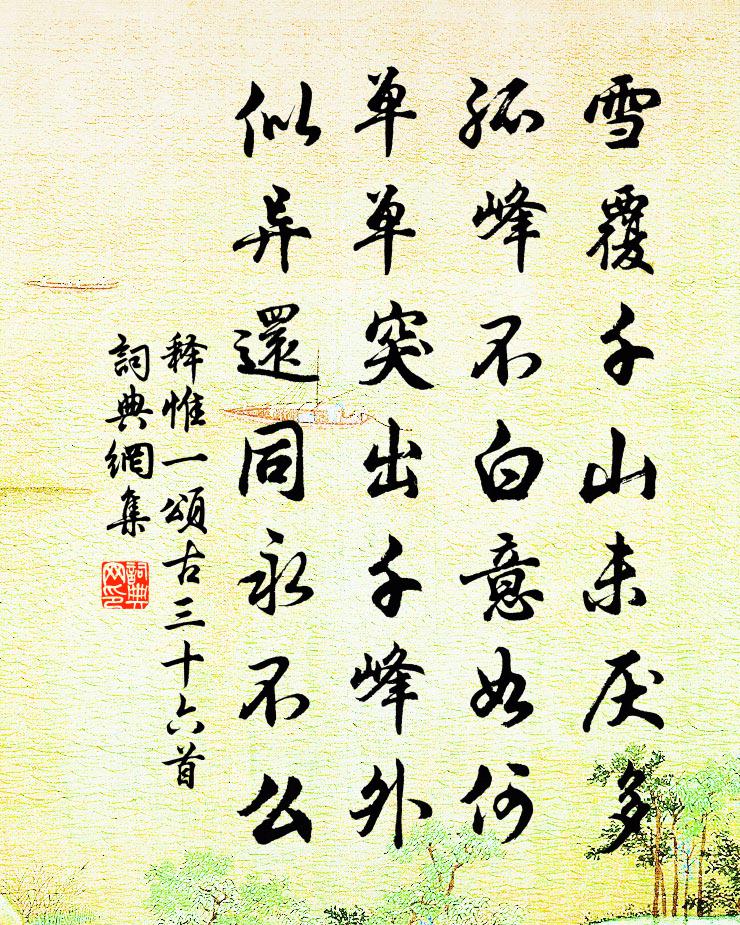 詩詞名句歷史字典書法欣賞書法字典國語詞典說文解字康熙字典古漢語字典標 題 作 者 詩 句 頌古三十六首作者:釋惟一 朝代:宋代頌古三十六首原文雪覆千山未厭多,孤峰不白意如何。單單突出千峰外,似異還同永不么。詩詞問答問:頌古三十六首的作者是誰?答:釋惟一問:頌古三十六首寫於哪個朝代?答:宋代釋惟一頌古三十六首書法欣賞頌古三十六首書法作品詩詞推薦梅花喜神譜欲開八枝宋伯仁〔宋代〕蠻觸國誰雄,戰爭猶未息。由此奪虛名,費盡人間力。和安成彭清老五首彭龜年〔宋代〕鏗鏘金石三千首,吐納雲煙四十年。自有山神回俗駕,不愁大尹觸吟鞭。紹興十三年發皇后冊寶十三首佚名〔宋代〕鏤蒼玉兮,盛德載揚。鑄南金兮,作鎮椒房。虔受賜兮,有燁有光。宜室家兮,朱芾斯皇。又三絕句孔武仲〔宋代〕咫尺齊山不易登,力驅煩冗得身輕。瑤巔珉洞須尋遍,從此乘風上玉京。頌古五十五首釋紹曇〔宋代〕村落誰家醜女兒,家將苕菷畫蛾眉。蓬人掩鼻嫌腥穢,鴉臭當風自不知。寄石橋僧項斯〔唐代〕逢師入山日,道在石橋邊。別後何人見,秋來幾處禪。溪中雲隔寺,夜半雪添泉。生有天台約,知無卻出緣。和盧推官中秋遇雨釋文珦〔宋代〕秋中唯此夕,雨蔽月圓時。握管沉幽思,臨軒失舊期。孤燈花謾落,長會信成虧。宋玉悲潛長,安仁鬢亦衰。檐聲詩謝惠連〔南北朝〕夕坐苦多慮。行歌踐閨中。房櫳引傾月。步檐結春風。孤鴻曲白玉蟾〔宋代〕秋陰薄薄天風淒,黃落滿空孤鴻飛,志在江湖叫何悲。桂枝初花來幾時,得非往者失塤箎,雲情月思哀獨歸。青霄郊廟歌辭享文敬太子廟樂章請神許孟容〔唐代〕觴牢具品,管磬有節。祝道夤恭,神儀昭晰。桐圭早貴,象輅追設。聲達樂成,降歆豐潔。嶺下桃花作澹紅色絕可愛因作絕句張九成〔宋代〕江北桃花色頗穠,不堪凡陋也春風。誰知嶺下新來樣,故作宮妝澹水紅。同胡原仲吳公路游清湍亭賦詩得流字劉子翬〔宋代〕出山曾幾時,桂露颯已秋。興來任兩屐,散此默默憂。嵐光近仍滅,鳥語靜忽流。新亭迥臨危,急潤循岩陬。上有題前定錄贈李伯牖二首黃庭堅〔宋代〕五賊追奔十二宮,白頭寒士黑頭公。明朝一飯先書籍,安用研桑作老翁。相和歌辭。短歌行二首白居易〔唐代〕曈曈太陽如火色,上行千里下一刻。出為白晝入為夜,圜轉如珠住不得。住不得,可奈何,為君舉酒歌短歌。歌聲入廣至贛雪霽天朗聊舒耳目曾豐〔宋代〕數自離家今幾程,半風半雨半陰晴。白雲故作關愁色,烏鵲爭為報喜聲。來耗得梅偷傳送,去途惟柳管將迎。囊中丫頭岩趙崇鉘〔宋代〕煙雨斑斕石蘚春,墜雲誰夢寶花顰。行人總被虛名誤,到得傾城又誤人。送歸使絕句七首羅公升〔宋代〕百年詩禮訓,惟彝仲容賢。慎勿如痴叔,膏明適自煎。次韻楊褒直講攬鏡蘇轍〔宋代〕鬢髮年來日向衰,相寬不用強裁詩。壯心付與東流去,霜蟹何妨左手持。花發黃鸝巧言語,池開楊柳斗腰肢。勸君哭崔二十四常侍白居易〔唐代〕貂冠初別九重門,馬鬣新封四尺墳。薤露歌詞非白雪,旌銘官爵是浮雲。伯倫每置隨身鍤,元亮先為自祭文。莫道送澠池崔主簿韋應物〔唐代〕邑帶洛陽道,年年應此行。當時匹馬客,今日縣人迎。暮雨投關郡,春風別帝城。東西殊不遠,朝夕待佳聲。名句推薦怡然敬父執,問我來何方。問答乃未已,驅兒羅酒漿杜甫《贈衛八處士》 秋靜見旄頭,沙遠席羈愁李賀《塞下曲》 寒蟬鳴處,回首斜陽暮。趙彥端《點絳唇·途中逢管倅》 雪虐風饕愈凜然,花中氣節最高堅。陸游《落梅》 春思遠,誰嘆賞、國香風味。周密《繡鸞鳳花犯·賦水仙》 人有不為也,而後可以有為。孟子《孟子·離婁章句下·第八節》 獨王之國,勞而多禍管仲《管子·形勢》 黃師塔前江水東,春光懶困倚微風。杜甫《江畔獨步尋花·其五》 夫輕諾必寡信,多易必多難。老子《老子·德經·第六十三章》 蜀天常夜雨,江檻已朝晴。杜甫《水檻遣心二首》