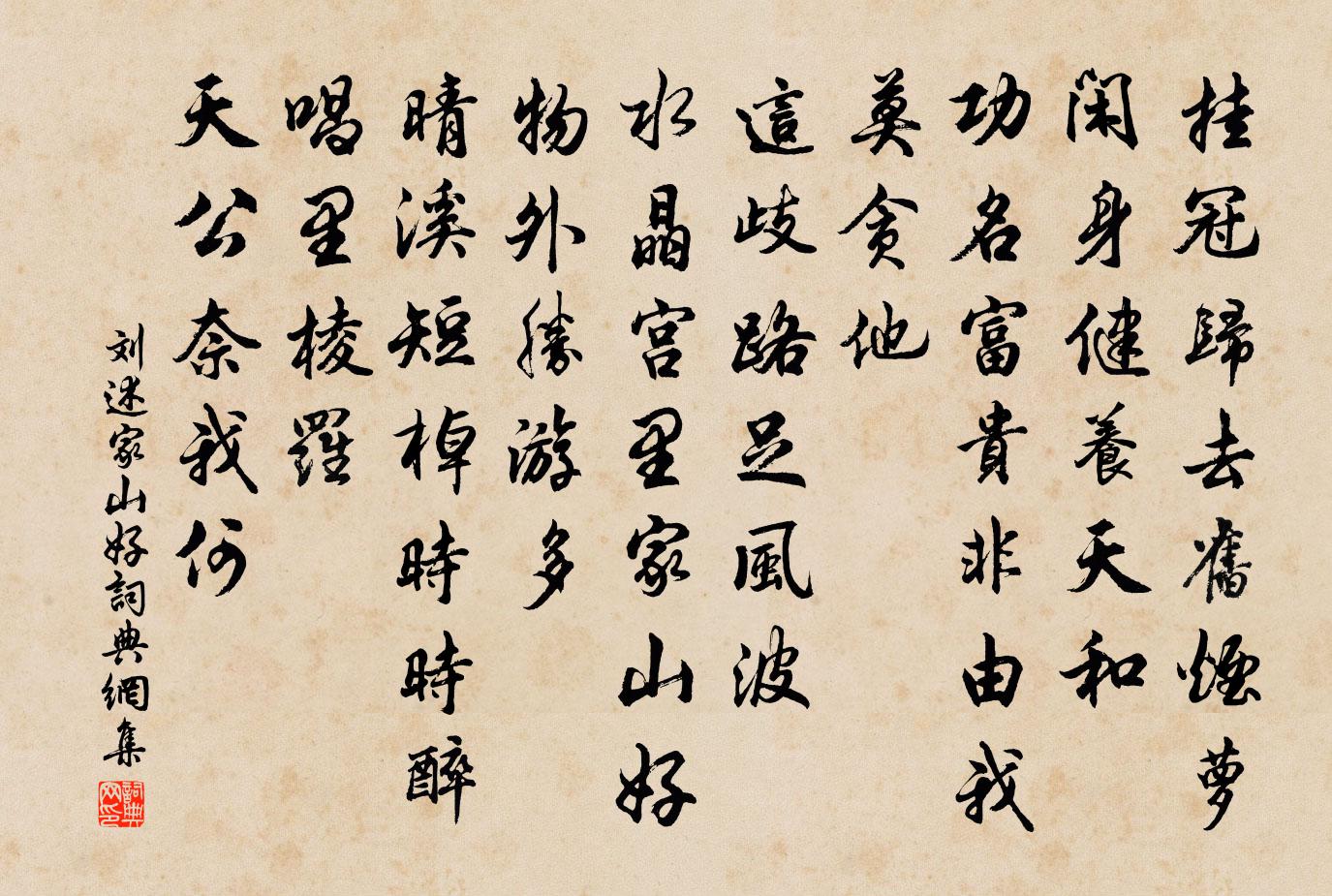 詩詞名句歷史字典書法欣賞書法字典國語詞典說文解字康熙字典古漢語字典標 題 作 者 詩 句 家山好作者:劉述 朝代:宋代家山好原文掛冠歸去舊煙蘿。閒身健,養天和。功名富貴非由我,莫貪他。這歧路、足風波。水晶宮裡家山好,物外勝游多。晴溪短棹,時時醉唱里棱羅。天公奈我何。詩詞問答問:家山好的作者是誰?答:劉述問:家山好寫於哪個朝代?答:宋代問:家山好是什麼體裁?答:詞劉述家山好書法欣賞家山好書法作品詩詞推薦滿江紅慢 勉劉主簿姬翼〔元代〕眩目空花,紛紛盡、如繩緘縛。軟紅塵堆里汩沒,認為真樂。二陸來時忘後患,兩疏見處誰先著。正夢魂、隨蟻到南鄉子朱敦儒〔宋代〕宮樣細腰身。玉帶羅衫穩試新。小底走來宣對御,催頻。曲殿西廂小苑門。歌舞斗輕盈。不許楊花上錦茵。勸得君次韻審知寄贈趙蕃〔宋代〕以我思君見,知君念我還。相逢勞苦外,逕問竹平安。【黃鐘】節節高盧摯〔元代〕題洞庭鹿角廟壁雨晴雲散,滿江明月。風微浪息,扁舟一葉。半夜心,三生夢,萬里別,悶倚篷窗睡些。賈侍郎自會稽使回篇什盈卷兼蒙見寄一首…數事率成十韻劉長卿〔唐代〕江上逢星使,南來自會稽。驚年一葉落,按俗五花嘶。上國悲蕪梗,中原動鼓鼙。報恩看鐵劍,銜命出金閨。風物游石洞徐僑〔宋代〕我來叩石洞,嶄絕何從登。天開一間路,崖列兩連屏。有水泠泠來,委蛇貫中行。五丁修磴道,引步若余迎。昏暮次韻范純仁和郭昌朝寺丞見寄二首宋庠〔宋代〕岷峨秀氣入京華,鵬翼摶風勢莫涯。崑玉照人呈美璞,楚蘭芬畹擢新芽。朝廷遷陟先諸彥,閭里光榮在一家。不鄙雅去鵲來篇劉宰〔宋代〕昨日雅鳴繞庭樹,道上行人色驚懼。試呼行者問如何,身為戶長催殘稅。稅殘自昔稱難理,三年尤非四年比。加之一落索方千里〔宋代〕月影娟娟明秀。簾波吹皺。徘徊空度可憐宵,謾問道、因誰瘦。不見芳音長久。鱗鴻空有。渭城西路恨依然,尚夢送張知錄葉適〔宋代〕門閥飛龍後,家聲入館前。身饒太常長,客欠廣文氈。流落無先譽,遭逢有宿緣。炎洲路多少,謾數去鴻邊。又次鄭性之懸尉韻樓鑰〔宋代〕閔雨才寬又畏風,從朝愁到夕陽舂。誰教官到二千石,不學當年邴曼容。詠蘭趙友直〔宋代〕曉來一雨忽初收,九畹分香繞碧流。裛露靈苗凝淺翠,迎風素質拂輕柔。自甘深谷同巢許,不羨巍階並管周。物類皇帝上平上皇帝壽樂曲群臣酒三行竝用正安崔敦詩〔宋代〕清漏滴彤壺,皇仁雨露濡。遙瞻天一笑,同效岳三呼。御醴傳觴速,宮花覆座敷。欲知歸美意,歌頌在康衢。聞斛斯六官未歸杜甫〔唐代〕故人南郡去,去索作碑錢。本賣文為活,翻令室倒懸。荊扉深蔓草,土銼冷疏煙。老罷休無賴,歸來省醉眠。戊戍八月感事嚴復〔清代〕求治翻為罪,明時誤愛才。伏屍名士賤,稱疾詔書哀。燕市天如晦,宣南雨又來。臨河鳴犢嘆,莫遣才心灰。次韻外舅喜王正仲三丈奉詔禱南嶽回至襄陽舍黃庭堅〔宋代〕語言少味無阿堵,冰雪相看有此君。燈火詩書如夢寐,麒麟圖畫屬浮雲。平章息女能為婦,歡喜兒曹解綴文。憂樂淳熙七年端午帖子詞皇帝合六首崔敦詩〔宋代〕松碧涵風清度曲,梅黃過雨密留陰。翠寒堂上全無暑,定起人間扇暍心。正旦夜夢李士寧過我談說神怪久之草草為具仍蘇轍〔宋代〕先生惠然肯見客,旋買雞豚旋烹炙。人間飲食未須嫌,歸去蓬壺卻無吃。和萬州楊使君四絕句。競渡白居易〔唐代〕競渡相傳為汨羅,不能止遏意無他。自經放逐來憔悴,能校靈均死幾多。從趙彥特求茶李若水〔宋代〕飯余日影轉修廊,欹枕桐花墮小窗。為覓春風洗殘夢,要令詩思敵澄江。名句推薦滿堂唯有燭花紅,歌且從容,杯且從容。辛棄疾《一剪梅·中秋元月》 簾控鉤,掩上珠樓,風雨替花愁喬吉《春閨怨·不系雕鞍門前柳》 涓涓不壅,終為江河佚名《孔子家語·觀周》 總是愁媒,欲訴誰消遣蘇軾《蝶戀花·蝶懶鶯慵春過半》 佇聽寒聲,雲深無雁影。周邦彥《關河令·秋陰時晴漸向暝》 潭州官舍暮樓空,今古無端入望中。李商隱《潭州》 路逢險處須迴避,事到臨頭不自由。佚名《增廣賢文·上集》 有理言自壯,負屈聲必高。馮夢龍《警世通言·卷十五》 西園何限相思樹,辛苦梅花候海棠。元好問《鷓鴣天·候館燈昏雨送涼》 漫惹爐煙雙袖紫,空將酒暈一衫青。納蘭性德《浣溪沙·伏雨朝寒愁不勝》