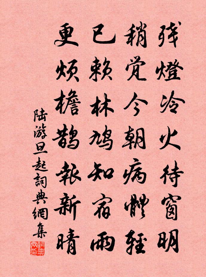 詩詞名句歷史字典書法欣賞書法字典國語詞典說文解字康熙字典古漢語字典標 題 作 者 詩 句 旦起作者:陸游 朝代:宋代旦起原文殘燈冷火待窗明,稍覺今朝病體輕。已賴林鳩知宿雨,更煩檐鵲報新晴。詩詞問答問:旦起的作者是誰?答:陸游問:旦起寫於哪個朝代?答:宋代問:陸游的名句有哪些?答:陸游名句大全陸游旦起書法欣賞旦起書法作品詩詞推薦和竇侍御登涼州七級浮圖之作高適〔唐代〕化塔屹中起,孤高宜上躋。鐵冠雄賞眺,金界寵招攜。空色在軒戶,邊聲連鼓鼙。天寒萬里北,地豁九州西。清興過徐州洪至豐沛作王冕〔元代〕落月蒼涼野色迷,過洪忽聽五更雞。河流東海奔騰去,天近中原漸覺低。敗壘有基棲碧草,古台無石墮青泥。漢家聽雨宋伯仁〔宋代〕凍雨瀟瀟未肯晴,灑窗聲似煮茶聲。山童酤得鄰家酒,炒栗爐頭獨自傾。在邊晁說之〔宋代〕在邊有底適予懷,舒慘無時亦異哉。醉到月前如失去,愁從騷里卻招來。素心偶向三花盡,孤憤難教貳負催。好覓即事陸游〔宋代〕紙潔晴窗暖,粳新午飯香。嗜眠為至樂,省事是奇方。孤蝶弄秋色,亂鴉啼夕陽。詩情隨處有,信筆自成章。陳總領輓詩三首魏了翁〔宋代〕舉頭西日遠,滿扇北塵污。病已關心腹,吾何愛髮膚。彎名逃越難,微服過商都。忽復天開霽,依然只故吾。冬日歸舊山李白〔唐代〕未洗染塵纓,歸來芳草平。一條藤徑綠,萬點雪峰晴。地冷葉先盡,谷寒雲不行。嫩篁侵舍密,古樹倒江橫。白犬天竺寺殿前立石姚合〔唐代〕補天殘片女媧拋,撲落禪門壓地坳。霹靂劃深龍舊攫,屈槃痕淺虎新抓。苔黏月眼風挑剔,塵結雲頭雨磕敲。秋至再和十首劉克莊〔宋代〕君憶東湖不久歸,我思陳跡恍難追。殷勤為報鶯花說,止有詩情似舊時。挽艮岩梅府卿方回〔宋代〕往事括囊坤,元魁罪忍論。鹹淳君蔑有,德佑國能存。委曲都司筆,侵尋亞從門。惟公獨不肯,用板倒桓溫。芹溪八詠葉善夫〔宋代〕芹溪處士古人風,寶劍塵埋未化龍。舊隱至今名不朽,扁題元出紫陽翁。奉使契丹二十八首其二十五次韻張君病起二首蘇轍〔宋代〕壯年得疾勢能支,不廢霜螫左手持。漸喜一杯留好客,未應五斗似當時。口中舌在時聞句,雪裡心安不問師。去臥和鞏興宗題回峰寺贈明山主王之道〔宋代〕江共煙雲遠,山連藪擇長。日從三伏烈,風借九秋涼。休作桃花觀,聊同柏子香。相逢無一事,不必下禪床。詩曹丕〔魏晉〕回頭四向堂。眼中無故人。淡黃賈似道〔宋代〕淡黃生來腿腳白,三樣頭尖如琥珀。初秋鬭間最迷痴,末後逢強絕口敵。先醉元稹〔唐代〕今日樽前敗飲名,三杯未盡不能傾。怪來花下長先醉,半是春風盪酒情。閒中富貴陸游〔宋代〕要信人生各有緣,閒中富貴亦關天。綠窗靜對千梢竹,翠竇新疏一脈泉。愛百衲琴常鎖匣,買雙鉤帖不論錢。箇中次韻林參議小雪快晴喻良能〔宋代〕著地晶瑩月在沙,忍寒聊作短歌夸。暖肌未辦裁駝褐,露趾唯應有革鞾。細點竹梢添爽灑,偶經梅蕊映橫斜。何當戀繡衾林洪〔宋代〕冰肌生怕雪未禁。翠屏前、短瓶滿簪。真箇是、疏枝瘦,認花兒、不要浪吟。等閒蜂蝶都休惹,暗香來、時借水沉成父居於普寧寺鐘樓之下辟以為齋舊名坎止近趙蕃〔宋代〕我有嗜睡癖,衾枕長與偕。晨昏要無失,曷日住君齋名句推薦十月江南天氣好,可憐冬景似春華。白居易《早冬》 袨服華妝著處逢,六街燈火鬧兒童。元好問《京都元夕》 合抱之木,生於毫末;九層之台,起於累土;千里之行,始於足下。老子《老子·德經·第六十四章》 此心隨去馬,迢遞過千峰。方乾《送從兄郜 / 韋郜 / 途中別孫璐》 此心終合雪,去已莫思量。虛中《送遷客》 江流石不轉,遺恨失吞吳。杜甫《八陣圖》 秋風吹地百草乾,華容碧影生晚寒。李賀《開愁歌》 故山知好在,孤客自悲涼。蘇軾《臨江仙·送王緘》 目之於色也,有同美焉。孟子《孟子·告子章句上·第七節》 別來春半,觸目柔腸斷。李煜《清平樂·別來春半》