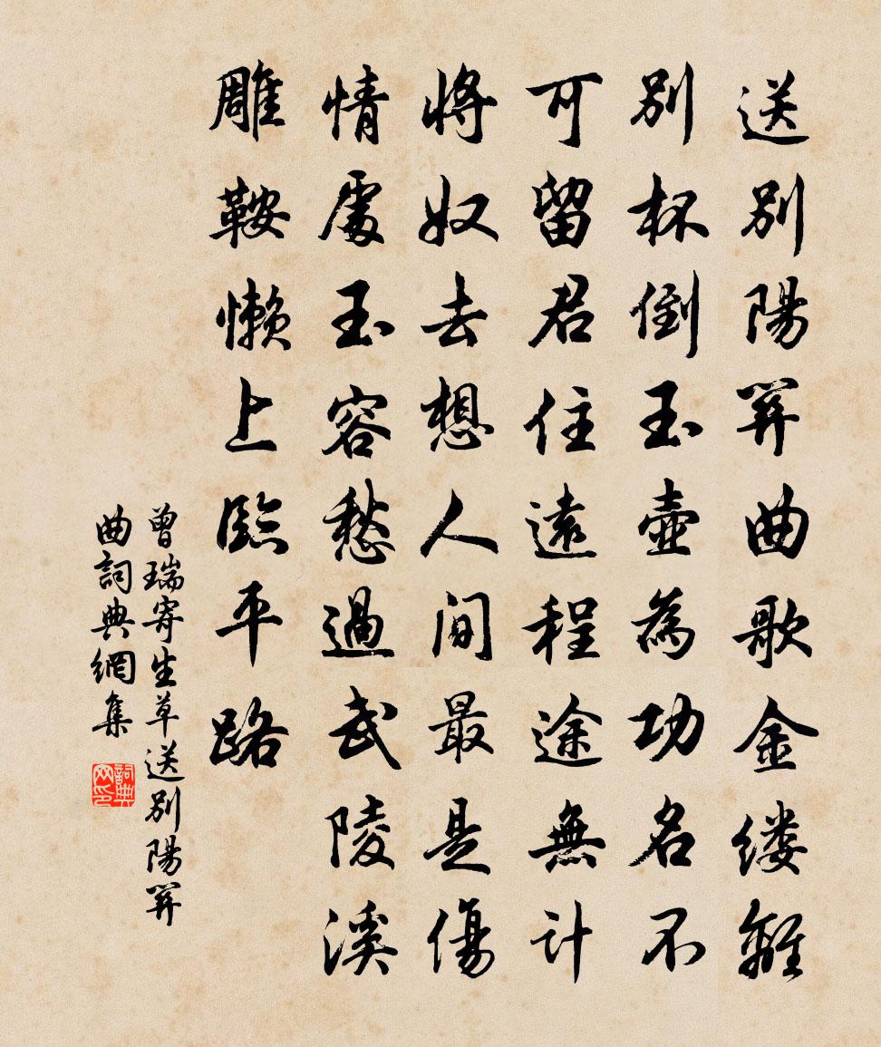 詩詞名句歷史字典書法欣賞書法字典國語詞典說文解字康熙字典古漢語字典標 題 作 者 詩 句 【仙呂】寄生草_送別陽關曲作者:曾瑞 朝代:元代原文送別陽關曲,歌金縷,離別杯,倒玉壺。為功名不可留君住,遠程途無計將奴去,想人間最是傷情處。玉容愁過武陵溪,雕鞍懶上臨平路。詩詞問答問:《【仙呂】寄生草_送別陽關曲》的作者是誰?答:曾瑞問:該詩寫於哪個朝代?答:元代書法欣賞【仙呂】寄生草_送別陽關曲書法作品詩詞推薦李少保輓詩王炎〔宋代〕昭代多諸老,惟公有典刑。上方思舊弼,天亦畀修齡。竟委元成笏,俄傳有道銘。只期麟閣上,遺像拜丹青。傷楊弘貞白居易〔唐代〕顏子昔短命,仲尼惜其賢。楊生亦好學,不幸復徒然。誰識天地意,獨與龜鶴年。陪王尚書泛舟蓮池許渾〔唐代〕蓮塘移畫舸,泛泛日華清。水暖魚頻躍,煙秋雁早鳴。舞疑回雪態,歌轉遏雲聲。客散山公醉,風高月滿城。蔡元度話其子能言前世事江晦叔有詩次韻李復〔宋代〕應感隨緣各有因,一源真寂自無塵。須知此物非他物,能悟前身是後身。叔子探環喬木在,房公發石舊書新。區中日本覺心辰老請贊釋慧開〔宋代〕用迷子映,飛紅爐雪。一喝當鋒,崖崩石裂。化生蛇作活龍,點黃金為生鐵。去縛解粘,舞釘拔楔。更將佛祖不傅送前緱氏韋明府南遊許渾〔唐代〕酒闌橫劍歌,日暮望關河。道直去官早,家貧為客多。山昏函穀雨,木落洞庭波。莫盡遠遊興,故園荒薜蘿。【仙呂】一半兒_秋日宮詞花張可久〔元代〕秋日宮詞花邊嬌月靜妝樓,葉底滄波冷翠溝,池上好風閒御舟。可憐秋,一半兒芙蓉一半兒柳。梅邊枝橫翠竹暮寒別歲蘇軾〔宋代〕故人適千里,臨別尚遲遲。人行猶可復,歲行那可追。問歲安所之,遠在天一涯。已逐東流水,赴海歸無時。東鄰盛京宰單州武城縣楊億〔宋代〕子男印綬諸侯秩,鄒魯閭淨太古風。兔苑勝游拋霰雪,琴台善政繼絲桐。征途朔吹貂裘暖,祖席清歌蟻酒空。令弟醉桃源 貪狼巨門王吉昌〔元代〕杓樞貪巨秉天真。玄皇附耳親。扶持五蘊已通神。都收萬劫塵。寂然定,體清新。溫存一性純。冥冥物外傲長春。書湖陰先生壁二首王安石〔宋代〕茅檐長掃靜無苔,花木成畦手自栽。一水護田將綠繞,兩山排闥送青來。臨江仙(送疊羅菊與趙使君)陳師道〔宋代〕官樣初黃過閨九。鮮妍時更宜寒。挽回人意不成闌。香羅堆葉密,芳意著心單。過與後房歌舞手,輕盈喜色生顏。和襲美悼鶴陸龜蒙〔唐代〕酆都香稻字重思,遙想飛魂去未飢。爭奈野鴉無數健,黃昏來占舊棲枝。誡子弟詞陸九韶〔宋代〕凡聞聲,須有省。照自心,察前境。若方馳騖速回光,悟得昨非由一頃。昔人五觀上時領。偈頌一百零二首釋紹曇〔宋代〕從上爪牙,千差萬別。截鶴續鳧,傷龜恕鱉。拄杖子,不入這保社。顢顢頇頇,跛跛挈挈。有眼如盲,有舌如結。窗前作小土山蓺蘭及玉簪最後得香百合併種之陸游〔宋代〕方蘭移取遍中林,餘地何妨種玉簪。更乞兩叢香百合,老翁七十尚童心。賀陳基載重陽日文同〔宋代〕文酒尋常不厭求,坐中須得買長頭。幸逢九日稱佳節,宜對三嵎賞素秋。歲月但看隨葉落,利名當信與雲浮。憑君送致遠赴耒陽酒官舒邦佐〔宋代〕雲凍長空晝亦昏,誰歟剝啄扣柴門。故人言向瀟湘去,此別應須歲月論。衡岳五峰瞻勝概,耒江千載吊詩魂。舊遊同林潘二先生登舟陳宓〔宋代〕何日長橋一酒船,簑衣擺盡世間緣。乘風弄笛多蓮夏,吹火烹鱸欲雪天。山際煙雲來有底,湖中風月浩無邊。細看得侄訊息二首陳造〔宋代〕甚喜的谷熟,仍聞佳食眠。郡人新過此,鄉主得真傳。社酒浮蛆淥,湖魚割玉鮮。平時計安穩,莫靳里胥錢。名句推薦詩言志,歌永言佚名《尚書·虞書·舜典》 當場不論,過後枉然。佚名《增廣賢文·下集》 後庭花一曲,幽怨不堪聽。劉禹錫《金陵懷古》 記曉葉題霜,秋燈吟雨,曾系長橋過艇。吳文英《十二郎·垂虹橋》 柳岸風來影漸疏,使君家似野人居。杜牧《齊安郡晚秋》 留春不住,費盡鶯兒語。王安國《清平樂·春晚》 何處是歸程?長亭連短亭。李白《菩薩蠻·平林漠漠煙如織》 一夜相思,水邊清淺橫枝瘦。陳亮《點絳唇·詠梅月》 簌簌衣巾落棗花,村南村北響繅車,牛衣古柳賣黃瓜。蘇軾《浣溪沙·簌簌衣巾落棗花》 兩鬢可憐青,只為相思老。晏幾道《生查子·關山魂夢長》