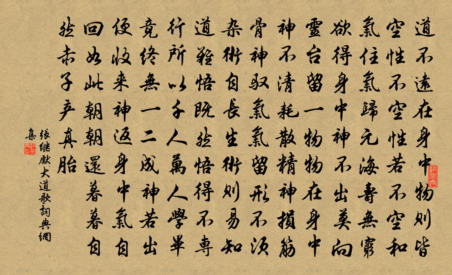詩詞名句歷史字典書法欣賞書法字典國語詞典說文解字康熙字典古漢語字典標 題 作 者 詩 句 大道歌作者:張繼先 朝代:宋代大道歌原文道不遠,在身中,物則皆空性不空。性若不空和氣住,氣歸元海壽無窮。欲得身中神不出,莫向靈台留一物。物在身中神不清,耗散精神損筋骨。神馭氣,氣留形,不須雜術自長生。術則易知道難悟,既然悟得不專行。所以千人萬人學,畢竟終無一二成。神若出,便收來,神返身中氣自回。如此朝朝還暮暮,自然赤子產真胎。詩詞問答問:大道歌的作者是誰?答:張繼先問:大道歌寫於哪個朝代?答:宋代張繼先大道歌書法欣賞大道歌書法作品詩詞推薦閒居吳則禮〔宋代〕阿堵安用多,十年著一冠。且作楚州夢,從人憎鼻鼾。柴桑閒居詩,讀罷始永嘆。鶬鶊幾時鳴,眷此春事闌。何以萬安賴秀才家拾青樓二首周必大〔宋代〕高柳侵檐帶綠煙,平林遙望倚青天。詩人不必工摹寫,留與恩袍色斗鮮。題東山俞烈〔宋代〕文會得吾黨,淨居清書長。平生愛山僻,暇日聊徜徉。風流謝康樂,肥遯計亦良。鐘鼎成淹留,江湖晚相望。山色野飲陸游〔宋代〕農事未興思一笑,春薺可采魚可釣。霏霏小雨忽已晴,堤上相攜踏殘照。村場酒薄亦有力,把醆相娛不辭釂。眼花和黃仲秉喜雨張栻〔宋代〕雨後清泉繞舍流,懸知耘耜遍南州。占相歲事端無恙,勞苦農人亦少休。好句收功經百鍊。彌旬不見便三秋。閒來深靜堂葉抑〔宋代〕亂山蒼蒼溪曲盤,煙林漠漠風生寒。地幽景絕豈易到,中隱蕭寺環峰巒。山僧淳樸寺亦古,築室為堂蔽風雨。深靜西澗種柳韋應物〔唐代〕宰邑乖所願,黽勉愧昔人。聊將休暇日,種柳西澗濱。置鍤息微倦,臨流睇歸雲。封壤自人力,生條在陽春。成陰月袁郊〔唐代〕嫦娥竊藥出人間,藏在蟾宮不放還。后羿遍尋無覓處,誰知天上卻容奸。東峰亭李彌遜〔宋代〕芒鞋著層丘,甘若臥華屋。瞭然非夢覺,似是前境熟。行行上青冥。下視八荒促。回溪綰文練,疊障環群玉,廚煙從軍行戎昱〔唐代〕昔從樓梯李都尉,樓梯雙鞬照馬樓梯蹄。擒生黑山北,殺敵黃雲西。太白沈虜地,邊草復萋萋。歸來邯鄲市,百尺離闕下日感恩李建勛〔唐代〕二年塵冒處中台,喜得南歸退不才。即路敢期皇子送,出關猶有御書來。未知天地恩何報,翻對江山思莫開。斜日次韻晁子與王灼〔宋代〕長貧我欲為巴叟,高詠君能繼洛生。自許一丘成小隱,仰瞻千載立修名。送友人(一作送友人南遊)李端〔唐代〕聞說湘川路,年年古木多。猿啼巫峽夜,月照洞庭波。窮海人還去,孤城雁與過。青山不同賞,來往自蹉跎。金陵雜興二百首蘇泂〔宋代〕石頭城上更高層,與客攜壺試一登。屈曲江流學秦篆,春風應是李陽冰。蝶戀花晏幾道〔宋代〕卷絮風頭寒欲盡。墜粉飄紅,日日香成陣。新酒又添殘酒困。今春不減前春恨。蝶去鶯飛無處問。隔水高樓,望斷學諸進士作精衛銜石填海韓愈〔唐代〕鳥有償冤者,終年抱寸誠。口銜山石細,心望海波平。渺渺功難見,區區命已輕。人皆譏造次,我獨賞專精。豈計可舉長老退休於西山庵賦西山好以送之陳著〔宋代〕西山好,西山好,天開畫閣勝蓬島。千峰盡頭地脈舒,萬頃如掌湖光抱。清風佳月自時節,暖翠晴嵐互昏曉。逢人門箴盧仝〔唐代〕貪殘奸酗,狡佞訐愎,身之八殺。背惠,恃己,狎不肖,妒賢能,命之四孽。有是有此予敢辭,無是無此予之師,矻矻何所思劉黻〔宋代〕矻矻何所思,一默照群妄。門外風雨深,山鳥亦不訪。有書足遮眼,寐寐古人樣。菜根清苦趣,木朽支離狀。深衣無俗念 嘆世王丹桂〔元代〕蟾烏景急,暗催人、兩鬢銀絲如織。終日區區猶不省,蓋為家緣煎逼。蝸角虛名,蠅頭微利,得也成何濟。聞身康名句推薦故先民以時生財,固本而用財,則財足。墨子《墨子·05章 七患》 無限旱苗枯欲盡,悠悠閒處作奇峰。來鵠《雲》 陶潛酷似臥龍豪,萬古潯陽松菊高龔自珍《己亥雜詩·其一百三十》 遲遲鐘鼓初長夜,耿耿星河欲曙天。白居易《長恨歌》 壯心未與年俱老,死去猶能作鬼雄。陸游《書憤五首·其二》 城小賊不屠,人貧傷可憐元結《賊退示官吏》 水滿田疇稻葉齊,日光穿樹曉煙低。徐璣《新涼》 日用必須簡省,杜奢端,即以昭儉德。王永彬《圍爐夜話·第八三則》 千里黃雲白日曛,北風吹雁雪紛紛。高適《別董大二首》 野臣潛隨擊壤老,日下鼓腹歌可封。鮑防《元日早朝行》