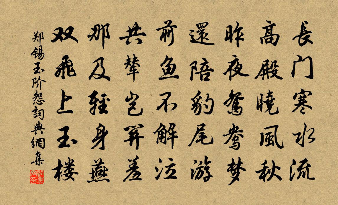 詩詞名句歷史字典書法欣賞書法字典國語詞典說文解字康熙字典古漢語字典標 題 作 者 詩 句 玉階怨作者:鄭錫 朝代:唐代玉階怨原文長門寒水流,高殿曉風秋。昨夜鴛鴦夢,還陪豹尾游。前魚不解泣,共輦豈關羞。那及輕身燕,雙飛上玉樓。詩詞問答問:玉階怨的作者是誰?答:鄭錫問:玉階怨寫於哪個朝代?答:唐代問:玉階怨是什麼體裁?答:五古鄭錫玉階怨書法欣賞玉階怨書法作品注釋全唐詩:卷262_11詩詞推薦立秋日劉言史〔唐代〕商風動葉初,蕭索一貧居。老性容茶少,羸肌與簟疏。舊醅難重漉,新菜未勝鉏。才薄無潘興,便便畫偃廬。大行太皇太后輓詞二首蘇轍〔宋代〕約己心全小,寬叱德有餘。外家恩澤少,先後禮容虛。原廟因前室,中朝避冊書。功名不勝紀,四諡嘆猶疏。雨後李俊民〔元代〕春空靄靄莫雲低,飛過山前雨一犁。明日卻尋歸去路,馬蹄猶踏落花泥。曲江池上雍裕之〔唐代〕殷勤春在曲江頭,全藉群仙占勝游。何必三山待鸞鶴,年年此地是瀛洲。送張無夢歸天台張復〔唐代〕學道探玄務穀神,薜衣疏野見明君。暫來北闕利名地,歸去舊山鸞鶴群。洞壑深藏塵外士,冠裳不系嶺頭雲。赤城歲除唐彥謙〔唐代〕索索風搜客,沈沈雨洗年。殘林生獵跡,歸鳥避窯煙。節物杯漿外,溪山鬢影前。行藏都未定,筆硯或能捐。道失歐陽詢〔唐代〕已惑孔貴嬪,又被辭人侮。花箋一何榮,七字誰曾許。不下結綺閣,空迷江令語。雕戈動地來,誤殺陳後主。清曉升瓊台頂石崖有仙人腳跡高似孫〔宋代〕亂石排天倚嵐壁,苔痕不犯松喬跡。上通群帝集台斗,下鑒十洲通碣石。樹呼清風雜今古,山遺宿潤從開闢。丹翁題玉笥山強處士方乾〔唐代〕酒里藏身岩里居,刪繁自是一家書。世人呼爾為漁叟,爾學釣璜非釣魚。古意俞桂〔宋代〕無言情脈脈,美人久相隔。道阻修且長,春草幾番碧。鳳釵冷鬢雲,鸞鏡輕雲羃。昔為比翼鳥,今作孤飛翮。愁絕久雨文同〔宋代〕寒鳩劬劬屋上鳴,欲使此雨何時晴。山中有客抱幽郁,日日起望東方明。今朝晚霞發光焰,喜極再拜當西楹。須臾送僧歸山劉言史〔唐代〕楚俗翻花自送迎,密人來往豈知情。夜行獨自寒山寺,雪徑泠泠金錫聲。玉女杜蘭香下嫁於張碩曹唐〔唐代〕天上人間兩渺茫,不知誰識杜蘭香。來經玉樹三山遠,去隔銀河一水長。怨入清塵愁錦瑟,酒傾玄露醉瑤觴。遺情春問湖莊曹彥約〔宋代〕問訊湖莊事,經年意若何。為渠魂入夢,老我鬢添皤。雪霽春應好,山明水漸多。遣兒徵僕役,除道莫蹉跎。醉後劉商〔唐代〕春草秋風老此身,一瓢長醉任家貧。醒來還愛浮萍草,漂寄官河不屬人。題致政李子立問月台曾豐〔宋代〕主人詩豪寄於酒,萬象無非酒之友。主人酒豪寄於詩,萬象無非詩之題。若為詩酒興俱發,平時泛愛今一割。不問挽李少卿張耒〔宋代〕幾年林下遠埃塵,儒雅風流誰與鄰。筆尾病來猶壯健,詩情老去更清新。幽齋昔日琴書換,新冢東風草木春。懷想曉解糝潭追和張文潛白沙阻風王之道〔宋代〕江上酒驚風夜穿酒屋,扁舟酒正艤沙頭酒宿。燈寒屢剔短檠青。酒暖孤斟老貧綠。更闌艇子催人起,泥汊而今趁朝送鄉人宗旨上坐章甫〔宋代〕久客不忘歸,相逢喜鄉曲。杖藜時過門,軟語伴幽獨。翩翩別我去,芒鞋踏清秋。二浙富山水,令人懷昔游。我今昭州陶弼〔宋代〕假守昭平郡,詩情比閬仙。蟬聲風葉外,鳥影月池邊。名句推薦仁人之事者,必務求興天下之利,除天下之害。墨子《墨子·16章 兼愛(下)》 秋風夜渡河,吹卻雁門桑。王昌齡《塞下曲·秋風夜渡河》 不求見面惟通謁,名紙朝來滿敝廬。文徵明《拜年》 特君不以為政,而士不以為行故也。墨子《墨子·15章 兼愛(中)》 登車宿遷北,萬頃鋪瓊田。陸文圭《宿遷道中遇雪》 何當金絡腦,快走踏清秋。李賀《馬詩二十三首》 山際見來煙,竹中窺落日。吳均《山中雜詩》 春水別來應到海,小松生命合禁霜李覯《秋晚悲懷》 夢入藍橋,幾點疏星映朱戶。吳文英《荔枝香近·七夕》 哀蟬無留響,叢雁鳴雲霄。陶淵明《己酉歲九月九日》
