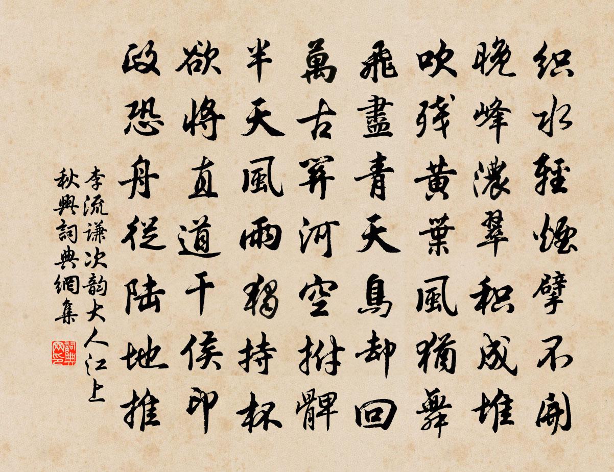 詩詞名句歷史字典書法欣賞書法字典國語詞典說文解字康熙字典古漢語字典標 題 作 者 詩 句 次韻大人江上秋興作者:李流謙 朝代:宋代次韻大人江上秋興原文織水輕煙擘不開,晚峰濃翠積成堆。吹殘黃葉風猶舞,飛盡青天鳥卻回。萬古關河空拊髀,半天風雨獨持杯。欲將直道乾侯印,政恐舟從陸地推。詩詞問答問:次韻大人江上秋興的作者是誰?答:李流謙問:次韻大人江上秋興寫於哪個朝代?答:宋代李流謙次韻大人江上秋興書法欣賞次韻大人江上秋興書法作品詩詞推薦蝶戀花向滈〔宋代〕費盡東君無限巧。玉減香銷,回首令人老。夢繞嶺頭歸未到。角聲吹斷江天曉。燕子來時春正好。寸寸柔腸,休問沁園春(代壽直院陳文昌)李曾伯〔宋代〕今代清流,北斗以南,文昌一星。對露門進讀,鑾坡演翰,瑣闈批敕,寶牒成文。筆下權衡,胸中律度,禮樂人才離京後作七首張耒〔宋代〕水諳送客渾無浪,風解留人卻有情。今夜榆林系帆宿,卻從北斗望天心。漢陽晚泊楊徽之〔唐代〕傍橋吟望漢陽城,山遍樓台徹上層。犬吠竹籬沽酒客,鶴隨苔岸洗衣僧。疏鍾未徹聞寒漏,斜月初沈見遠燈。夜靜妙香院僧堂後路直臨溪石台古松蟠其上松之下趙蕃〔宋代〕台高十丈獨株松,下有仙人舊履蹤。三十二窠丹灶在,亦云數目應龜峰。好事近(黃義卿畫帶霜竹)高登〔宋代〕瀟灑帶霜枝,獨向歲寒時節。觸目千林憔悴,更幽姿清絕。多才應賦得天真,落筆驚風葉。從此綠窗深處,有一梢桃花吳融〔唐代〕滿樹和嬌爛漫紅,萬枝丹彩灼春融。何當結作千年實,將示人間造化工。偈頌一百零九首釋可湘〔宋代〕一釋迦,二元和,三佛陀。阿呵呵,團欒且唱太平歌。和吳清叟吳江歲晚書懷卷剛中〔宋代〕雪消殘臘淨無塵,官柳溪梅欲試新。星籥暗移驚客夢,帝閽高啟際昌辰。補天鍊石曾無計,卻日揮戈正在人。莫效郊廟歌辭。儀坤廟樂章。永和徐彥伯〔唐代〕猗若清廟,肅肅熒熒。國薦嚴祀,坤興淑靈。有幾在室,有樂在庭。臨茲孝享,百祿惟寧。更漏子盧祖皋〔宋代〕玉鉤裁,羅襪淺。心事漫拈針線。釵半,鬢慵梳。新來消瘦無。江南路。花無數。春夢不知何處。簾影轉,瞑禽三月盡日李昌符〔唐代〕江頭從此管弦稀,散盡遊人獨未歸。落日已將春色去,殘花應逐夜風飛。元日立春感嘆有作二首范成大〔宋代〕元日兼春日,霜寒又雪寒。並煩傳菜手,同捧頌椒盤。疊膝稀穿履,扶頭懶正冠。五年如此度,寧得諱衰殘。往回臨安口號八首蘇泂〔宋代〕天竺前頭靈隱東,山川奇崛自玄工。舊時可是不曾看,今度重來看不同。春山行貫休〔唐代〕重疊太古色,濛濛花雨時。好峰行恐盡,流水語相隨。黑壤生紅黍,黃猿領白兒。因思石橋月,曾與故人期。贈長城庾將軍李頻〔唐代〕初年三十拜將軍,近代英雄獨未聞。向國報恩心比石,辭天作鎮氣凌雲。逆風走馬貂裘卷,望塞懸弧雁陣分。定擁建溪十詠其九延平津楊億〔宋代〕積水深無際,神龍此屈蟠。媚川珠彩動,射鬥劍光寒。燕脯誰能寄,犀燈豈易看。負書當瑞聖,何若蟄洪瀾。浣溪沙(春情)蘇軾〔宋代〕桃李溪邊駐畫輪。鷓鴣聲里倒清尊。夕陽雖好近黃昏。香在衣裳妝在臂,水連芳草月連雲。幾時歸去不銷魂。慟柳論劉言史〔唐代〕孀妻棲戶仍無嗣,欲訪孤墳誰引至。裴回無處展哀情,惟有衣襟知下淚。滕王閣下賦樂雷發〔宋代〕越郍蜀艇亂相偎,風飽千帆帶雨開。閣上鳴鑾今已往,江頭飛鶩只堪哀。柳汀絮滿河豚賤,桃塢花殘石首來。應接名句推薦錢塘江上潮信來,今日方知我是我。施耐庵《水滸傳·第一百一十九回》 爭教清淚不成冰?好處便輕別。納蘭性德《好事近·簾外五更風》 幽音變調忽飄灑,長風吹林雨墮瓦李頎《聽董大彈胡笳聲兼寄語弄房給事》 黃師塔前江水東,春光懶困倚微風。杜甫《江畔獨步尋花·其五》 有眼不識泰山。施耐庵《水滸傳·第二回》 為問花何在,夜來風雨,葬楚宮傾國。周邦彥《六醜·落花》 佳人亦何念,淒斷陽關曲。蘇軾《送頓起》 舉頭西北浮雲,倚天萬里須長劍。辛棄疾《水龍吟·過南劍雙溪樓》 應無所住而生其心。鳩摩羅什譯《金剛經·莊嚴淨土》 一聲畫角譙門,豐庭新月黃昏,雪裡山前水濱。白樸《天淨沙·冬》