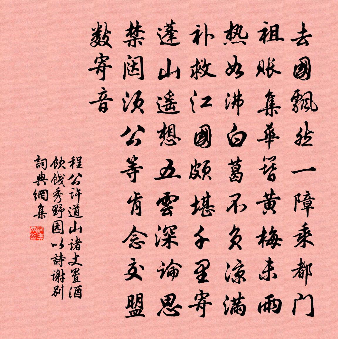 詩詞名句歷史字典書法欣賞書法字典國語詞典說文解字康熙字典古漢語字典標 題 作 者 詩 句 道山諸丈置酒飲餞秀野園以詩謝別作者:程公許 朝代:宋代原文去國飄然一障乘,都門祖賬集華簪。黃梅未雨熱如沸,白葛不負涼滿補救。江國頗堪千里寄,蓬山遙想五雲深。論思禁闥須公等,肯念交盟數寄音。詩詞問答問:《道山諸丈置酒飲餞秀野園以詩謝別》的作者是誰?答:程公許問:該詩寫於哪個朝代?答:宋代書法欣賞道山諸丈置酒飲餞秀野園以詩謝別書法作品詩詞推薦呈李贛州四首趙蕃〔宋代〕見自長台數,於今十五年。雖雲公偃薄,政坐我迍邅。苦志思重寫,愁腸不易煎。卻憐難掩處,霜發半蕭然。示兒舒岳祥〔宋代〕蛻蝶將舒魄尚凝,如痴如夢復如醒。風吹海水飛成雪,月入梅花脈作冰。有口勿言唯飲酒,無家可著不如僧。眼前招任孝叔蒲明之江亭對月郭印〔宋代〕高亭對月影成雙,客舍何人共酒缸。今夕相邀同一醉,坐看金餅落澄江。部兵之秋丘道中懷寄彭城社友賀鑄〔宋代〕駕馬出北門,徒御何遲遲。日氣方洶湧,霜陰亦紛披。役夫前驅行,少婦痛不隨。分攜仰天哭,聲盡有餘悲。雖非北門覆舟山道中范成大〔宋代〕苒苒霜風掠弊貂,簿書塵外訪漁樵。林煙色淡如蒙雨,塘水痕深似落潮。雁字江天聞塞管,梅梢山路欠溪橋。騎驢蘇幕遮 示李梁張三人王處一〔元代〕李張梁,聽少告。休恁躊躇,縱得心顛倒。每恨玉陽無答報。似此修行,何日歸蓬島。大唐僧,九度老。萬種難辛書案上三種梅三首趙蕃〔宋代〕人人共說梅花好,試問梅花好奈何。到底物名嫌太甚,市區酒肆盡東坡。酬棲上人賈島〔唐代〕夜久城館閒,情幽出在山。新月有微輝,朗朗空庭間。處世雖識機,伊余多掩關。松姿度臘見,籬藥知春還。靜覽時事感慨王同祖〔宋代〕蜀又交侵淮又危,江湖風浪沸潢池。連朝雲氣濃於墨,想是英雄血戰時。宴清都方千里〔宋代〕暮色聞津鼓。煙波碧、數行征雁時度。輕榔聚網,長歌和楫,水村漁戶。行人又落天涯,但悵望、高陽伴侶。記舊探春令趙長卿〔宋代〕疏籬橫出,綠枝斜露,笑盈盈地。悄一似、初睹東鄰女,有無限、風流意。半開折得瓊瑰蕊。惹新香沾袂。放曲屏秘閣鄭公移節鄉部置酒餞別詩以侑之張栻〔宋代〕嗜僻寡同好,意合難語離。傾蓋今年年,盍簪愜心期。況復王事可,退食陪委蛇。窺君肺腑中,落落無藩籬。獨有悟佛鑒問領旨述偈釋清海〔宋代〕實際從來不受塵,箇中無舊亦無新。青山況是吾家物,不用尋家別問津。過渦河祖無擇〔宋代〕揚鞭策羸馬,橋上一徘徊。欲擬臨渦賦,慚無八斗才。句宗必經〔宋代〕睡曉方知前是夢,落花難上舊來枝。偈三十五首釋祖珍〔宋代〕心月孤圓,虛明洞透。耀古輝今,絲毫不漏。春泊弋陽許渾〔唐代〕江行春欲半,孤枕弋陽堤。雲暗猶飄雪,潮寒未應溪。飲猿聞棹散,飛鳥背船低。此路成幽絕,家山鞏洛西。西江月楊冠卿〔宋代〕妙墨龍蛇飛動,新詞雪月交光。論文齒頰帶冰霜。鳳閣從來宮樣。壽菊叢開三徑,清姿高壓群芳。折花聊爾問行藏學無學頌一十五首釋印肅〔宋代〕奪下生機不作聲,耳聾眼瞎妙明生。隨流口欲傳心印,豈是緣情粥飯僧。次韻宋尚書山居見南山亭方岳〔宋代〕能令詩腹化神奇,香到黃花秋力微。我醉悠然山亦醉,竹深啼鳥自忘機。名句推薦生而知之;或學而知之;或困而知之:及其知之,一也。子思《中庸·第二十章》 十年生死兩茫茫,不思量,自難忘。蘇軾《江城子·乙卯正月二十日夜記夢》 梅須遜雪三分白,雪卻輸梅一段香。盧鉞《雪梅·其一》 重陽佳節意休休,與客攜壺共上樓。姜塘《摘星樓九日登臨》 嶺南能有幾多花,寒食臨之掃春跡。鄭剛中《寒食》 料得年年腸斷處,明月夜,短松岡。蘇軾《江城子·乙卯正月二十日夜記夢》 可憐白骨攢孤冢,盡為將軍覓戰功。張蠙《吊萬人冢》 皎皎窗中月,照我室南端。潘安《悼亡詩三首》 順天者存,逆天者亡。孟子《孟子·離婁章句上·第七節》 過盡千帆皆不是,斜暉脈脈水悠悠。溫庭筠《望江南·梳洗罷》