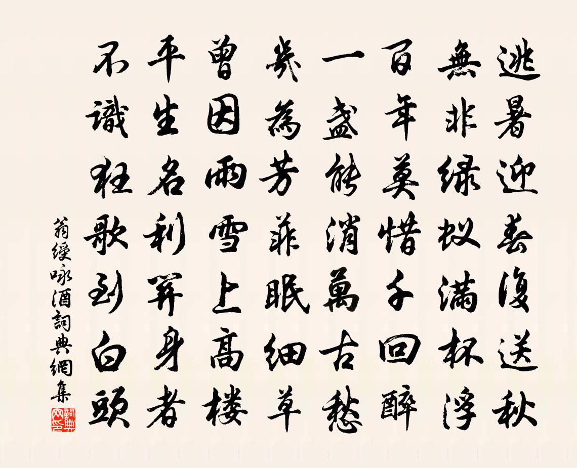 詩詞名句歷史字典書法欣賞書法字典國語詞典說文解字康熙字典古漢語字典標 題 作 者 詩 句 詠酒作者:翁綬 朝代:唐代詠酒原文逃暑迎春復送秋,無非綠蟻滿杯浮。百年莫惜千回醉,一盞能消萬古愁。幾為芳菲眠細草,曾因雨雪上高樓。平生名利關身者,不識狂歌到白頭。詩詞問答問:詠酒的作者是誰?答:翁綬問:詠酒寫於哪個朝代?答:唐代問:詠酒是什麼體裁?答:七律翁綬詠酒書法欣賞詠酒書法作品注釋全唐詩:卷600-23詩詞推薦清明韓元吉〔宋代〕老去驚時節,春來念物華。青煙百六日,同社兩三家。醉著凌風舸,歌成滿路花。滄江萬里意,獨立送殘霞。和謝虛谷孫嵩〔宋代〕窮愁幽思或成時,畦繞荒蕪失自治。秋氣居然寒宋玉,土風猶爾操鍾儀。安能跛鱉從天馬,正擬長松引菟絲。啟以致爽亭二首張嵲〔宋代〕桑枯落洲渚,澄潭漁艇集。幽禽忽飛來,斜日水光溢。蝶戀花(新晴用前韻)李彌遜〔宋代〕清曉天容爭顯晦。溪上群山,戢戢分駝背。誰似浮雲知進退。疏林嫩日黃金碎。夜枕不眠憎鼠輩。困眼貪晴,拚被聞張師德狀元登第因以寄賀兼呈梁固狀元魏野〔宋代〕科場訊息到柴扉,皇宋風流事要知。封禪汾陰連歲榜,狀元俱是狀元兒。雜興顧逢〔宋代〕異鄉飄泊暫歸來,獨上蕪城望一回。三十年前人已往,樓台不是舊樓台。讀李群玉集樂雷發〔宋代〕光順門前系馬吟,弘文館裡翠雲春。卻憐白首河西尉,枉作蓬萊獻賦人。贈歌姬崔仲容〔唐代〕水剪雙眸霧剪衣,當筵一曲媚春輝。瀟湘夜瑟怨猶在,巫峽曉雲愁不稀。皓齒乍分寒玉細,黛眉輕蹙遠山微。渭城九月初作陸游〔宋代〕菊佩糕盤節物催,老懷撫事一悠哉!年光半付殘編去,詩句時從倦枕來。零落朋儔今孰在?寂寥事業世方咍。兩叢又二首袁燮〔宋代〕平生酷愛水浮天,每到東湖決豁然。要識此湖功利溥,旱時無陰蔭民田。訪觀公不遇徐照〔宋代〕臥犬聞人出,門當青櫟林。固知多不在,自欲遠相尋。宵短余香印,林疎出磬音。昨來曾寄茗,應念苦吟心。新亭劉克莊〔宋代〕此是晉人游集處,當時風景與今同。不乾鐵鏁樓船力,似是蒲葵塵柄功。幾簇旌旗秋色里,百年陵闕淚痕中。興亡將至壽州初見淮山二首張耒〔宋代〕浩蕩平波欲接天,天光波色遠相連。風鳴雨槳初離浦,岸轉青山忽對船。澤國秋高添氣象,人家南去好風煙。步兵摸魚兒(重九)秦觀〔宋代〕傍湖濱、幾椽茅屋,依然又過重九。煙波望斷無人見,惟有風吹疏柳。凝思久。向此際,寒雲滿目空搔首。何人送挽克齋陳先生四首徐元傑〔宋代〕痛慘哲人痿,愚纏喪母悲。遡風懷紼路,泣雨寫哀詞。學本藏諸用,行皆篤所知。惟余經訓在,交付有孫枝。早秋雨後晚望齊己〔唐代〕暑氣時將薄,蟲聲夜轉稠。江湖經一雨,日月換新秋。有景堪援筆,何人未上樓。欲承涼冷興,西向碧嵩游。寄江東真漕劉宰〔宋代〕金陵千古帝王都,肉食何人解遠圖。只有愛民真學士,不慚通務漢三儒。金石台林夢英〔宋代〕雲作岩扉風自關,清陰半壑樹中間。傍廂更著茅亭好,放入西南一面山。頌古釋德會〔宋代〕放行把住謾周遮,一段風流出當家。不是當年漆桶破,爭能撒土又拋沙。重陽後絕句五首方回〔宋代〕梧桐疏葉間微黃,年例江南未肯涼。菊自此花三兩月,樽前日日是重陽。名句推薦便向夕陽影里,倚馬揮毫。納蘭性德《風流子·秋郊即事》 半壁見海日,空中聞天雞。李白《夢遊天姥吟留別 / 別東魯諸公》 兩處春光同日盡,居人思客客思家。白居易《望驛台》 古人今人若流水,共看明月皆如此。李白《把酒問月·故人賈淳令予問之》 不痴不聾,不作家翁。司馬光《資治通鑑·唐紀四十》 勸君頻入醉鄉來,此是無愁無恨處。晏幾道《玉樓春·雕鞍好為鶯花住》 聲無小而不聞,行無隱而不形。荀子《荀子·勸學》 多謝月相憐,今宵不忍圓。朱淑真《菩薩蠻·山亭水榭秋方半》 狐死首丘,代馬依風。范曄《後漢書·列傳·班梁列傳》 魯女東窗下,海榴世所稀。李白《詠鄰女東窗海石榴》