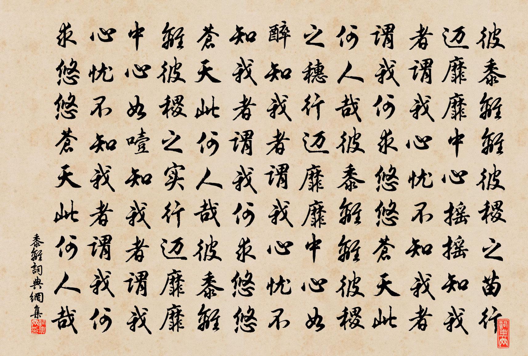 彼黍離離,彼稷之實。行邁靡靡,中心如噎。知我者,謂我心憂;不知我者,謂我何求。悠悠蒼天,此何人哉?
