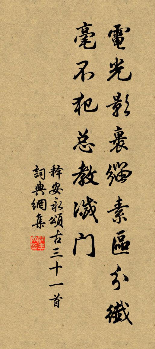 詩詞名句歷史字典書法欣賞書法字典國語詞典說文解字康熙字典古漢語字典標 題 作 者 詩 句 頌古三十一首作者:釋安永 朝代:宋代頌古三十一首原文電光影裹,緇素區分。纖毫不犯,總教滅門。詩詞問答問:頌古三十一首的作者是誰?答:釋安永問:頌古三十一首寫於哪個朝代?答:宋代釋安永頌古三十一首書法欣賞頌古三十一首書法作品詩詞推薦瀑布范仲淹〔宋代〕迥與眾流異,發源高更孤。下山猶直在,到海得清無。勢斗蛟龍惡,聲吹雨雹粗。晚來雲一色,詩句自成圖。春雪牟巘〔宋代〕一冬只辨作嚴寒,剪水飛花事竟難。閉戶不知春意動,撲窗忽覺雨聲乾。頗聞萬事正雲集,何處一蓑如畫看。但喜通州道中汪元量〔宋代〕一片秋雲妒太虛,窮荒漠漠走群狐。西瓜黃處藤如織,北棗紅時樹若屠。雪塞搗砧人戍遠,霜營吹角客愁孤。幾回和學士秋懷一十五首李彌遜〔宋代〕旋落檐花夜正喧,參橫斗轉有更傳。了無人跡妨真夢,枕簟同參一味禪。八月十二日夜偕客賞木犀八首陳造〔宋代〕冰蟾蜚下一天霜,領{上四下各}岩花旖旎香。我亦小園清絕處,與君同命醉為鄉。偈二首釋思岳〔宋代〕臘月初,歲雲徂。黃河凍已合,深處有嘉魚。活鱍鱍,跳不脫,又不能相煦以濕相濡以沫。慚愧菩薩摩訶薩,春風耆英會席汝言〔宋代〕壯歲塵埃祿事牽,老歸重到舊林泉。曾無勳業書青史,偶向康寧養老年。自分杜門居陋巷,敢期序齒預公筵。更慚重陽不見菊次諸公韻朱翌〔宋代〕遲笑秦昭舅,吝譏和長輿。當時雖說貴,退步不為疏。萸實采重嶺,拒霜臨碧渠。梁王門下客,先後有嚴徐。和集賢相公攝事出郊夏竦〔宋代〕台袞承嚴祀,傳呼出禁城。扢壇將錯事,總駟暫觀耕。盈止逾周頌,康哉葉舜賡。滿篝登大穟,首種達初萌。行饁如夢令陳三聘〔宋代〕紅紫不將春住。風定更飄無數。溪漲綠含風,短艇晚橫沙渡。歸去。歸去。肯念西池鴛鷺。猴馬陳師道〔宋代〕沐猴自戲馬自驚,圉人未解猴馬情。猴其天資馬何罪,意欲防患猶傷生。異類相宜亦相失,同類相傷非所及。志行湖州歌九十八首 其五十五汪元量〔宋代〕徐州城上覓黃樓,四壁詩章讀不休。更欲登台看戲馬,州官攜酒共嬉遊。獨酌試藥玉滑盞,有懷諸君子。明日望夜,月蘇軾〔宋代〕熔鉛煮白石,作玉真自欺。琢削為酒杯,規摹定州瓷。荷心雖淺狹,鏡面良渺彌。持此壽佳客,到手不容辭。曹侯贈廣信醫博士陳雲泉艾性夫〔宋代〕見說雲泉深又深,定知巢入梅棠林。君醫尚副窮時願,吾道全孤壯歲心。藥籠有方玄白髮,莧腸無分服黃金。近來再到鍾陵作貫休〔唐代〕六七年來到豫章,舊遊知己半凋傷。春風還有花千樹,往事都如夢一場。無限丘墟侵郭路,幾多台榭浸湖光。只應冷翠谷口占董嗣杲〔宋代〕亂山蔽天盡,叢澗繞山流。茅屋冷欲壓,今日方中秋。緣識宋太宗〔宋代〕如來千百億,化身本是真。駈駈煩惱不解嗔,我不能談說,沿舊卻知新。蘇幕遮 訓徒眾王哲〔元代〕弟兄懣,事下手。與世相逢,日日長鈐口。休論汞鉛並卯酉。開闡絳宮,自在逍遙走。二儀真,三耀秀。我欲親傳過臨川懷劉氏弟兄陳藻〔宋代〕臨川幾日到長沙,聞道黔南路更賒。行見一村籬落好,誰家此住憶君家。秋閨怨曹勛〔宋代〕憂勤番作妒,險詖自為才。趙瑟弦初絕,秦箏曲更哀。蛛綱羅妝鑒,庭蕪暗玉階。聽雞雖自誤,辭輦卻成非。猶謝名句推薦屋上春鳩鳴,村邊杏花白。王維《春中田園作》 如夢,如夢,殘月落花煙重。李存勖《如夢令·曾宴桃源深洞》 四百年來成一夢,堪愁。王安石《南鄉子·自古帝王州》 九月九日望鄉台,他席他鄉送客杯。王勃《蜀中九日 / 九日登高》 一味學吃虧,是處事良方。王永彬《圍爐夜話·第五四則》 秋娘渡與泰娘橋,風又飄飄,雨又蕭蕭。蔣捷《一剪梅·舟過吳江》 自古聖賢盛德大業,未有不由學而成者也。黃宗羲《明儒學案·甘泉學案·侍郎許敬菴先生孚遠》 三千丈清愁鬢髮,五十年春夢繁華。喬吉《折桂令·客窗清明》 懸衡而知平,設規而知圓。韓非及後人《韓非子·飾邪》 萬兩黃金容易得,知心一個也難求曹雪芹《紅樓夢·第五十七回》